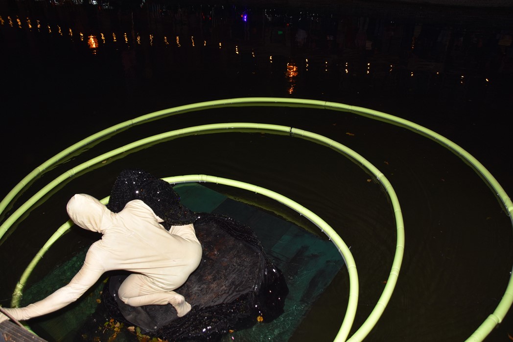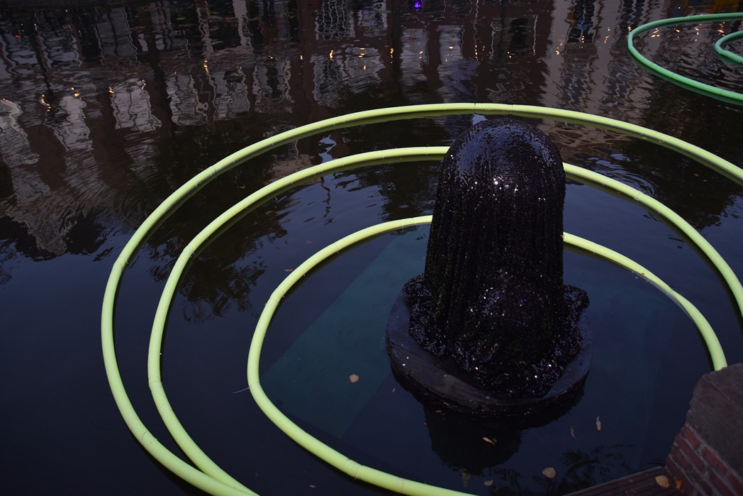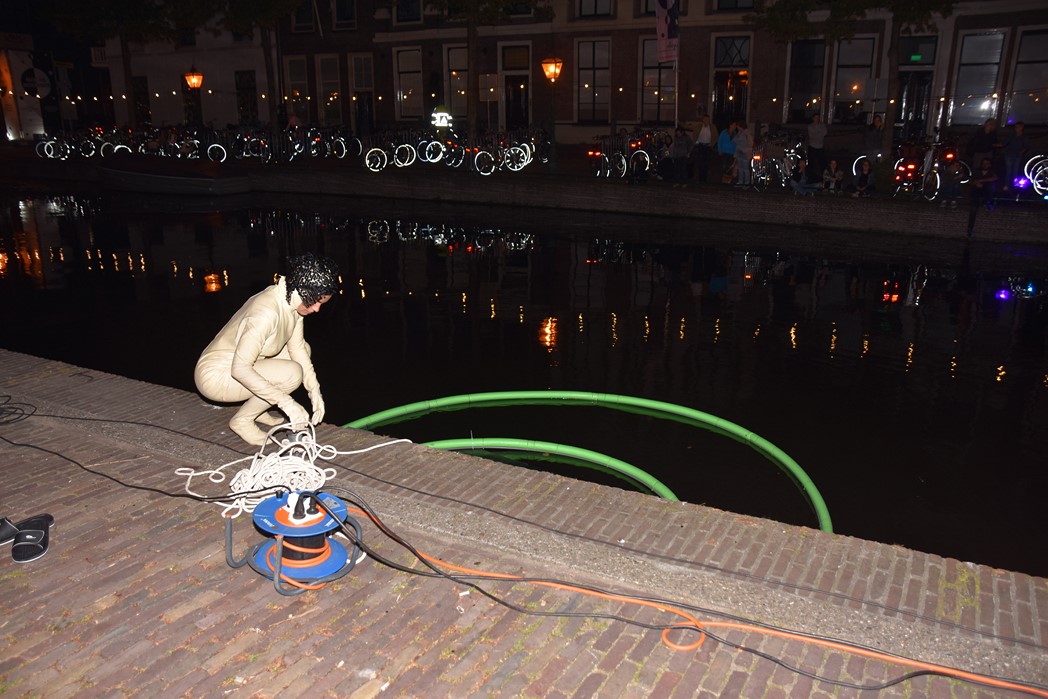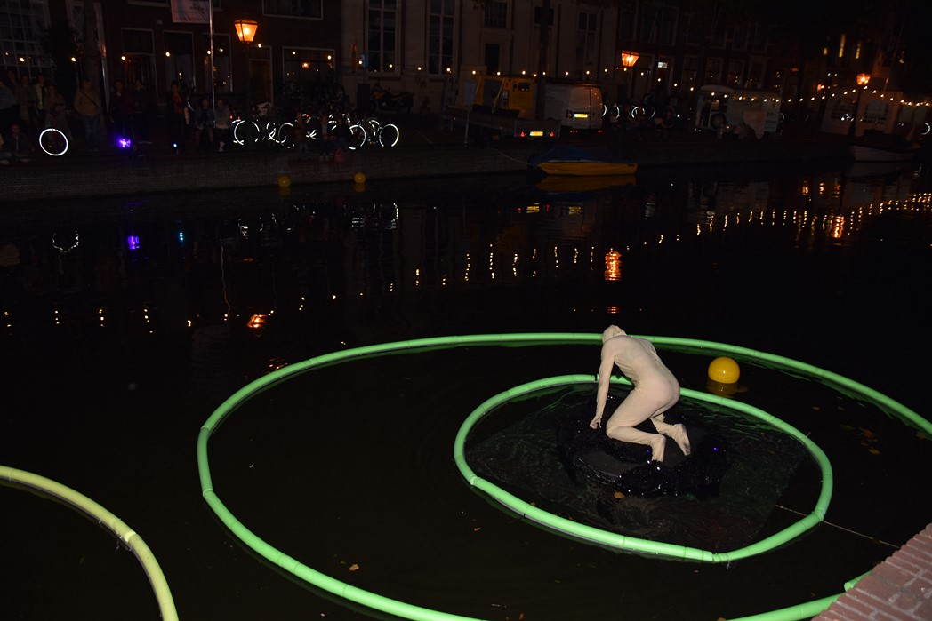Je vindt tijdens evenementen als dit eigenlijk altijd pareltjes. Van die dingen waarvan je denkt ‘móói’, ‘wist ik niet’ of ‘bijzonder’. Zo’n plek is Old School aan het Pieterskerkhof waar werken van Jos Agasi de aandacht trekken. Binnen is Punt te zien: een haast hallucinerende omgeving van lichtpuntjes, duizenden die als insecten over verschillende dundoeken bewegen en daardoor de ruimte helemaal vullen. Je kunt er tussen gaan staan en iedere keer weer de lichtjes anders beleven. Buiten lopen mensen langs Overvloed, een projectie van de altijd bewegende waterlijn van de zee op de ramen van de oude gymzaal. Het mooie is dat sommigen het geluk hebben langs te lopen als de geprojecteerde waterlijn de deur, die ook in de gevel zit, bereikt: dan stroomt er, helemaal synchroon, met het beeld schuim en water onder de deur door!