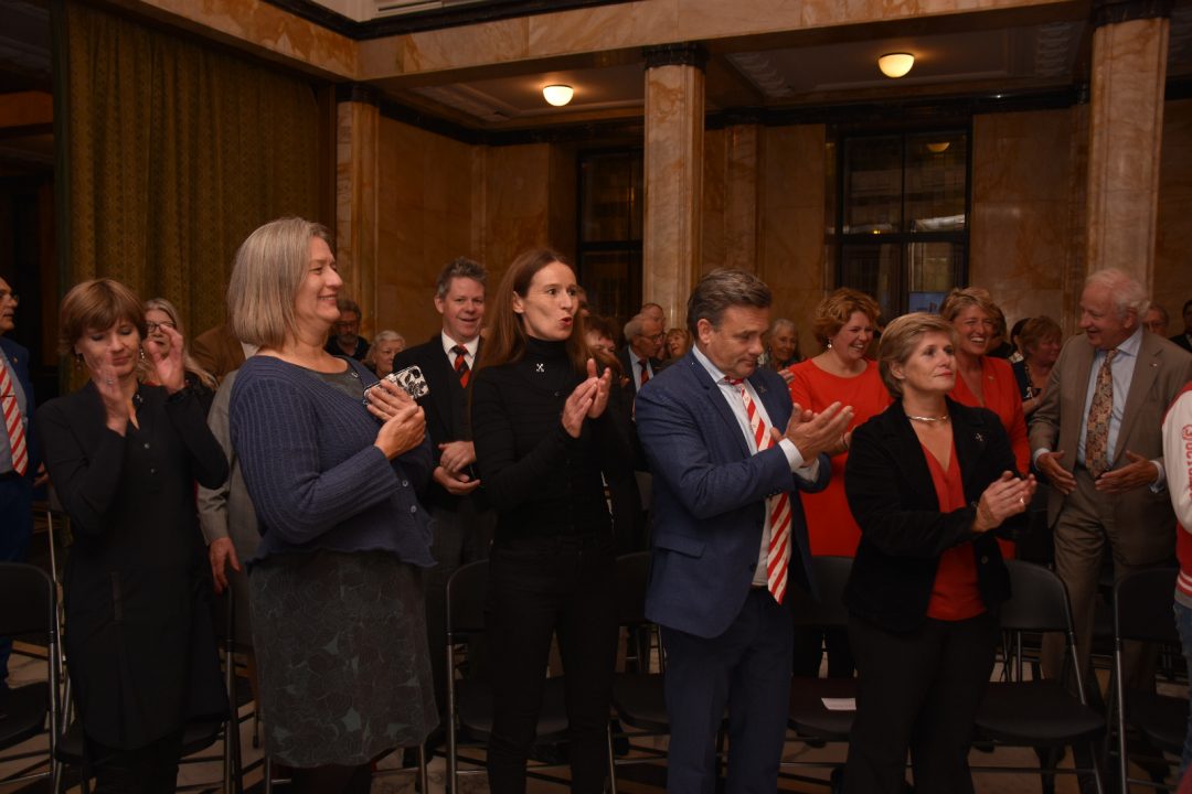 Ook werd een kunstwerk gepresenteerd dat Barbara van Druten en Niki Koutouras van ARTvertisements maakten voor de 3 October Vereeniging. Een prachtige collage die op een dienblad is geprint/ Dit is exclusief te koop bij Hudson’s Bay in Leiden