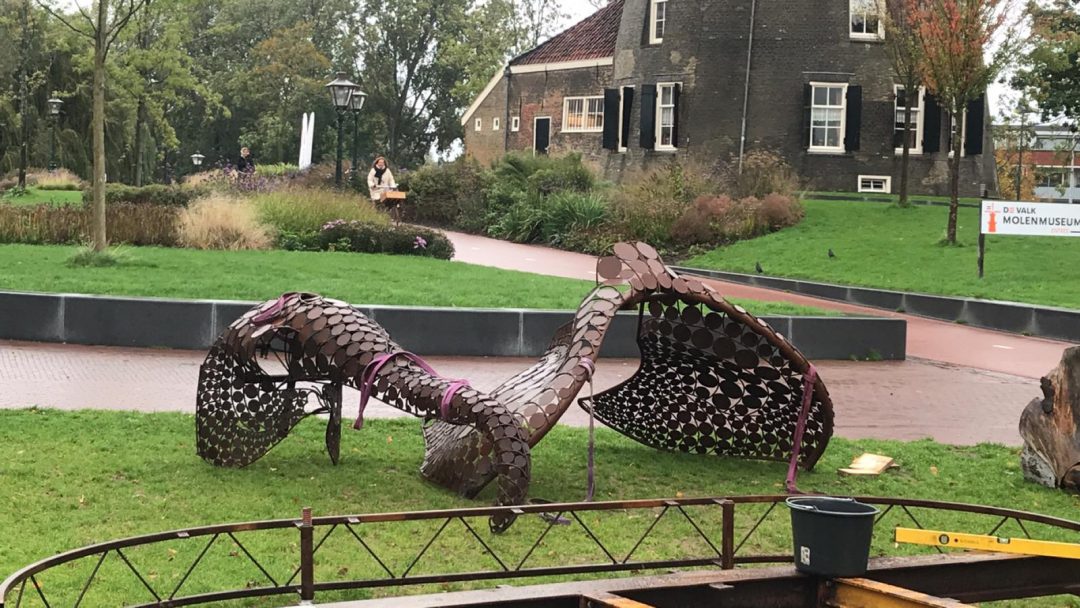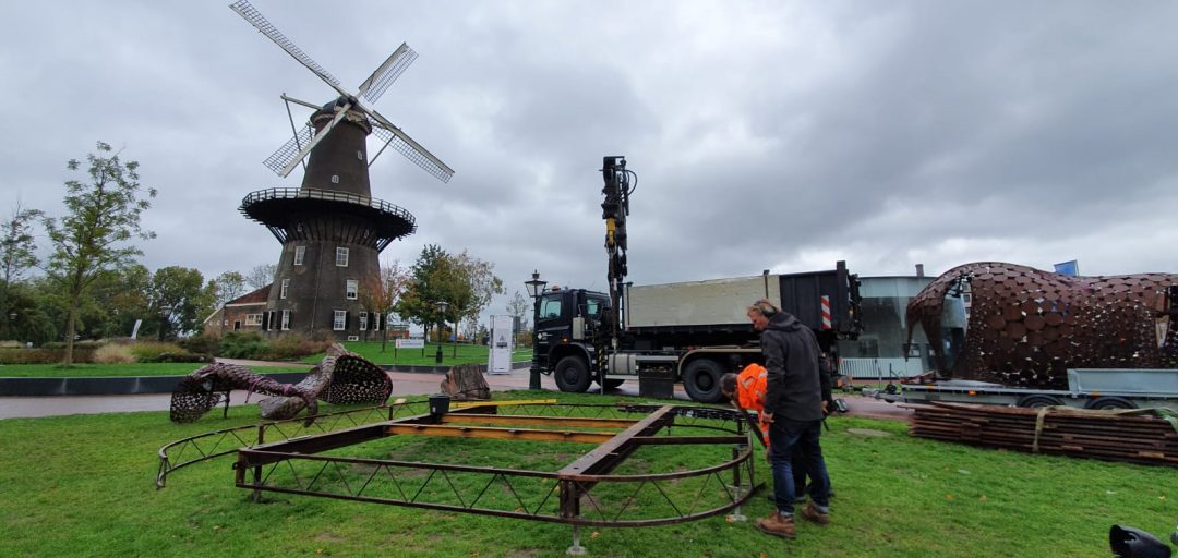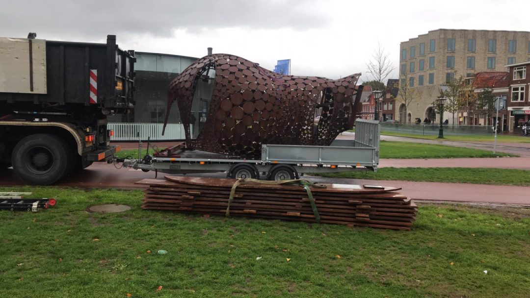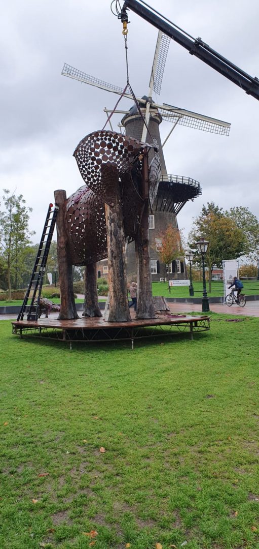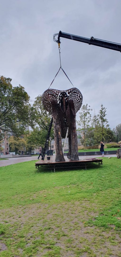 The Weeping Elephant is vanmiddag geplaatst op het Cultuurplein Lammermarkt. Het is na ‘Ode aan het Varken’ dat eerder dit jaar enige tijd naast molen De Valk stond het tweede kunstwerk van Jantien Mook dat een tijdelijke plek krijgt in Leiden. “De olifant komt de mensen in de stad opzoeken,” zegt Mook. “In eerste instantie wil ik hem positiviteit laten uitstralen, een positieve benadering waarmee ik mijn verwondering voor zo’n dier in het werk probeer te verbeelden.”