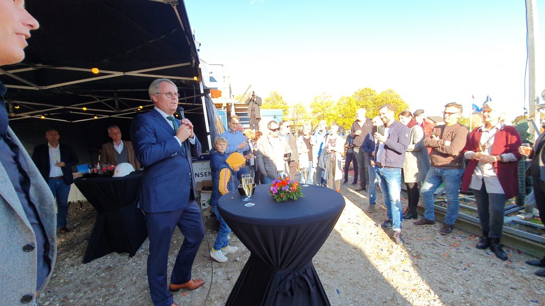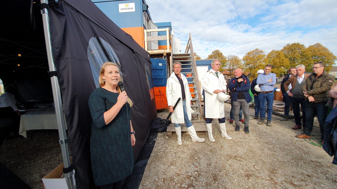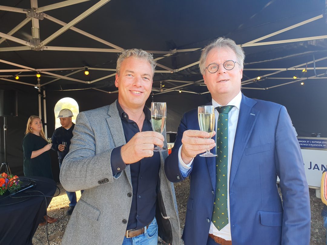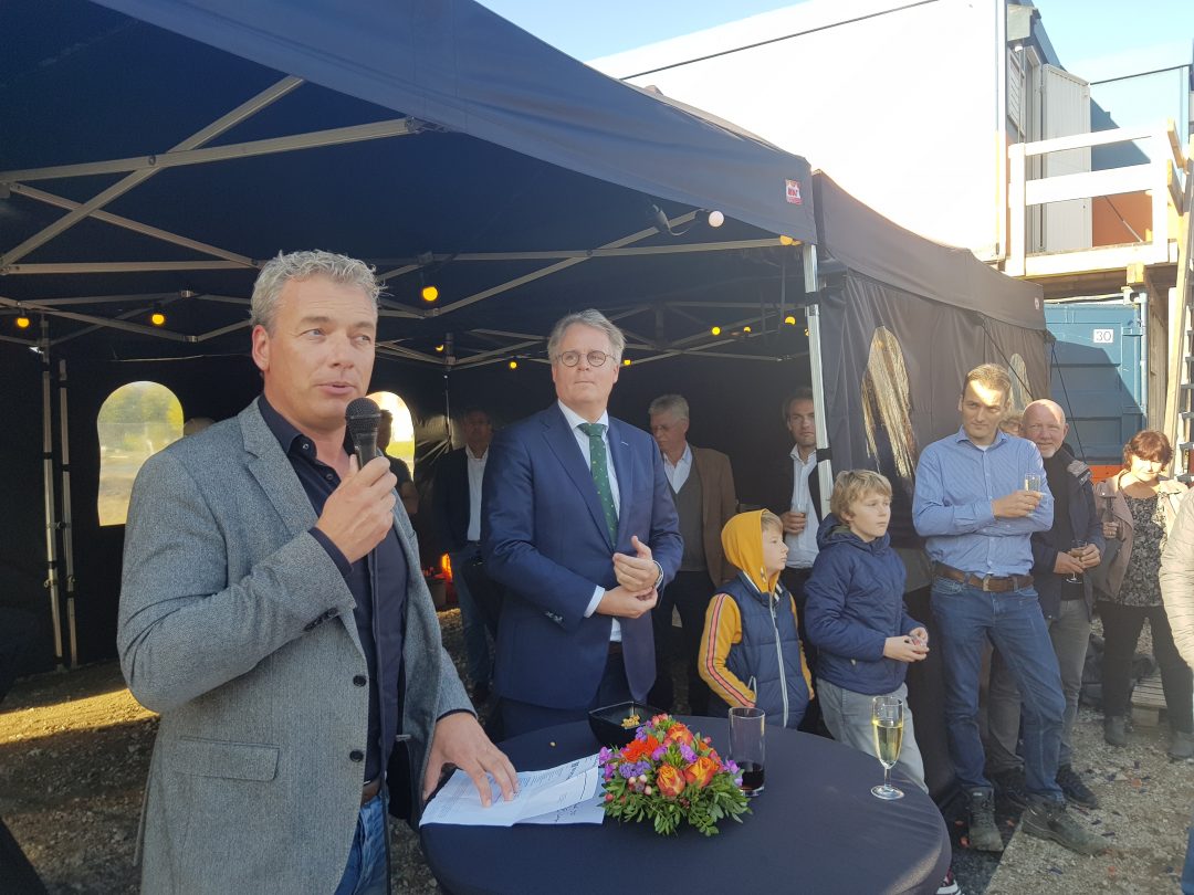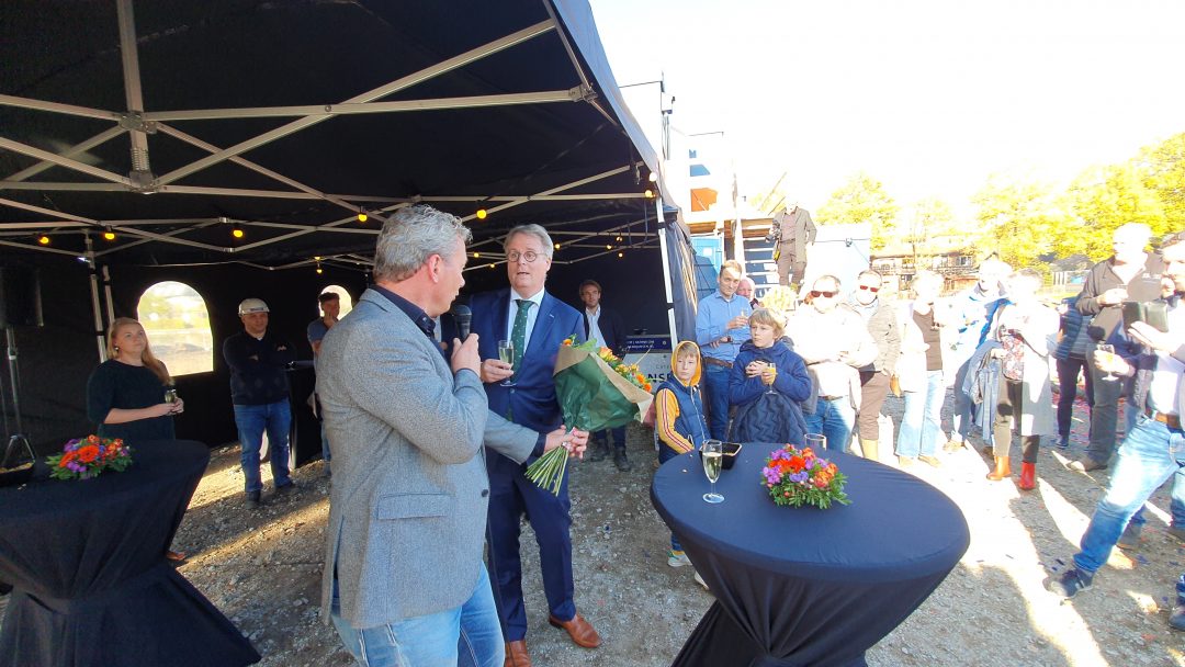 Chris de Waard sprak na de officiële start van de bouw met bouwer Mark Niersman en de Zoeterwoudse wethouder Ton de Gans.