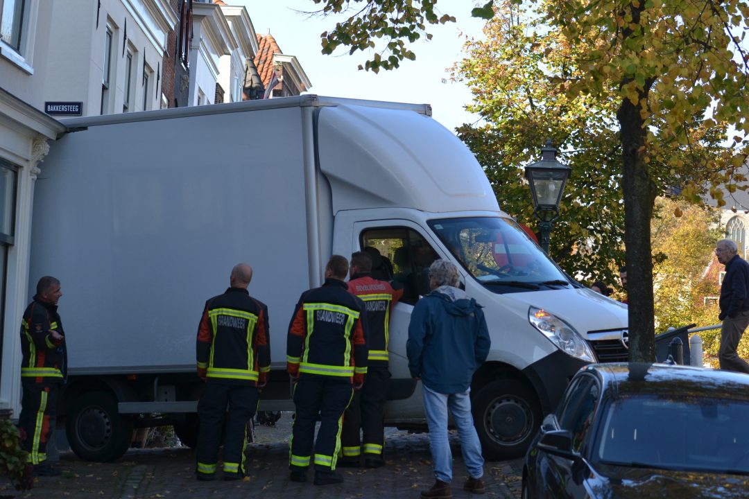 De brandweer werd erbij gehaald en heeft zowel het gat dat in de vrachtwagen was ontstaan iets groter gemaakt en ook een stuk van de dakgoot afgezaagd. Vervolgens kon de brandweer de vrachtwagen voorzichtig wegrijden.