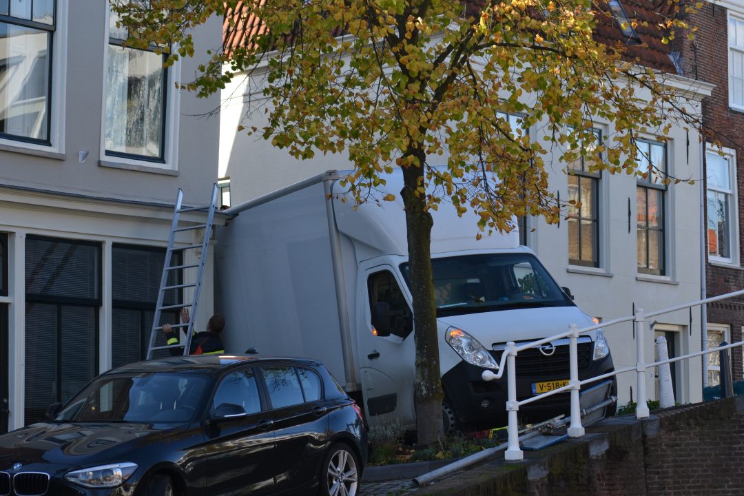 Een bestelwagen heeft zich donderdagmiddag vastgereden tegen de dakgoot van een hoekwoning aan de Vliet in Leiden. De bestelwagen wilde vanuit de Bakkersteeg de Vliet opdraaien, maar de chauffeur nam de bocht te krap.