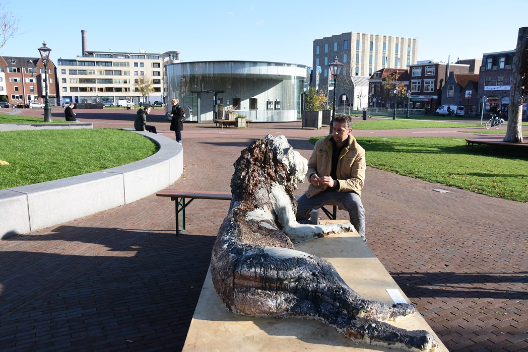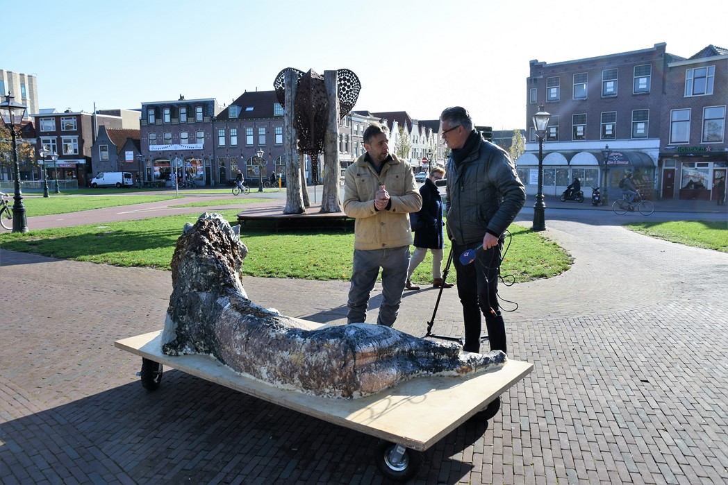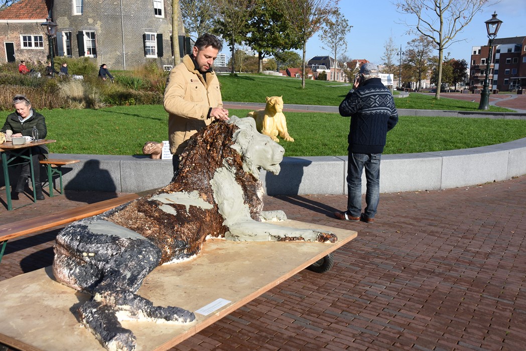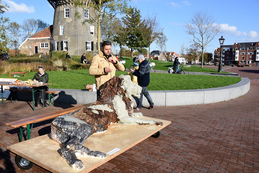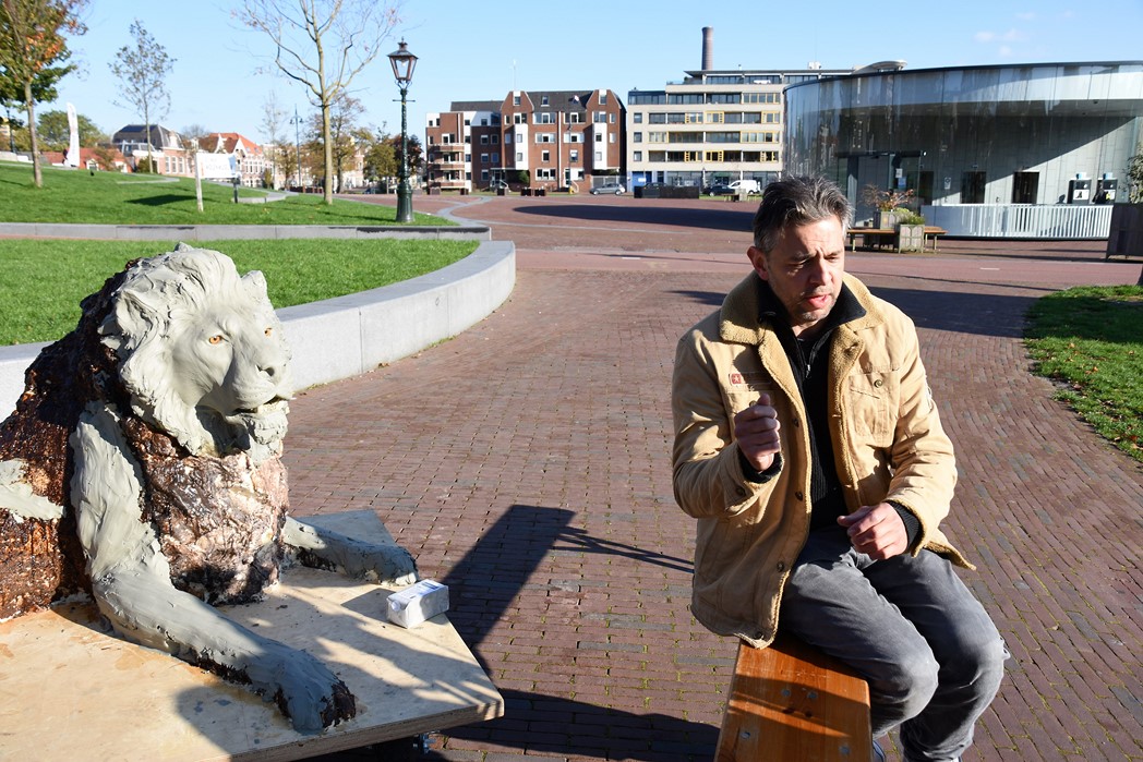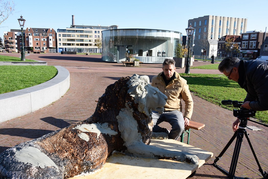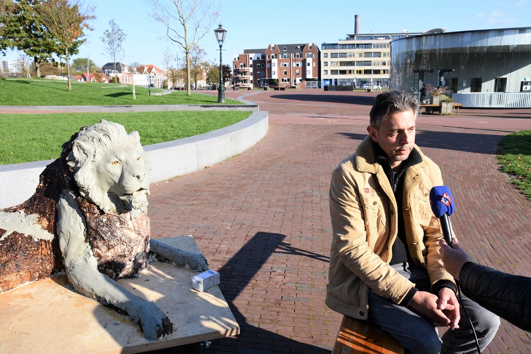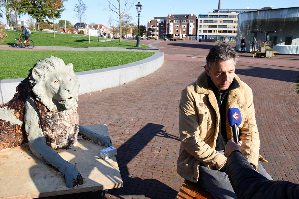 Robbert van Cleef van mediapartner Omroep West in gesprek met beeldend kunstenaar Chris Tap over zijn levensgrote leeuw.