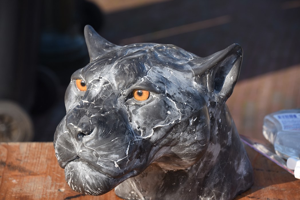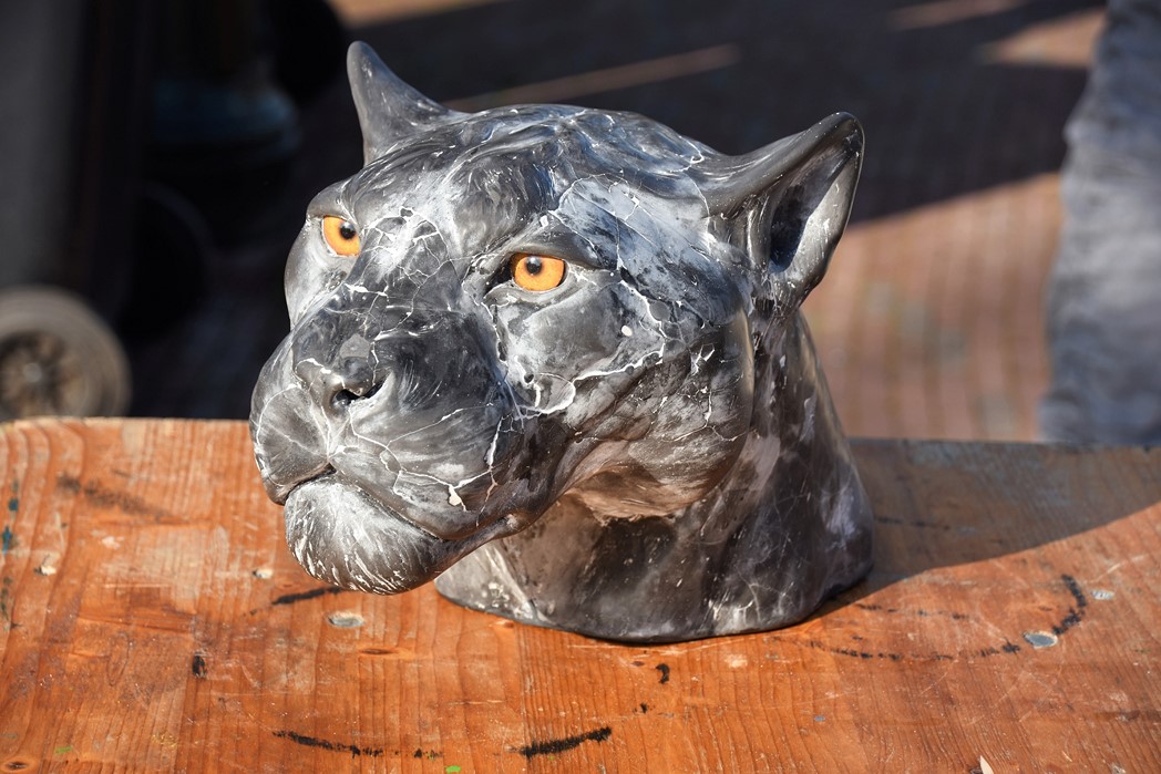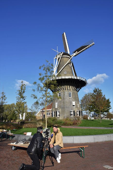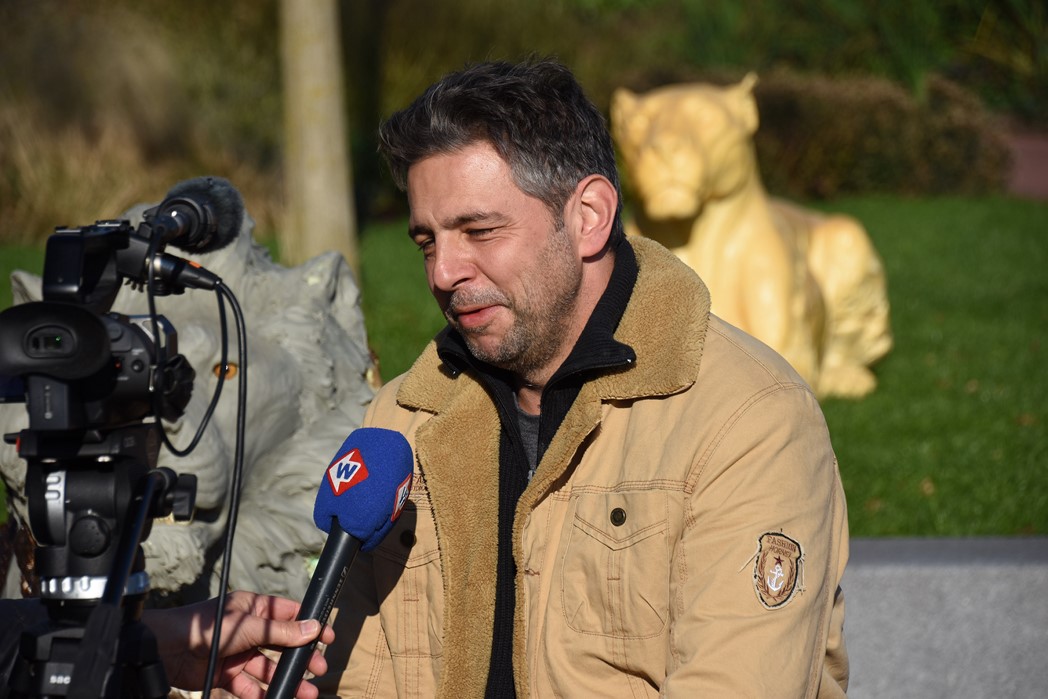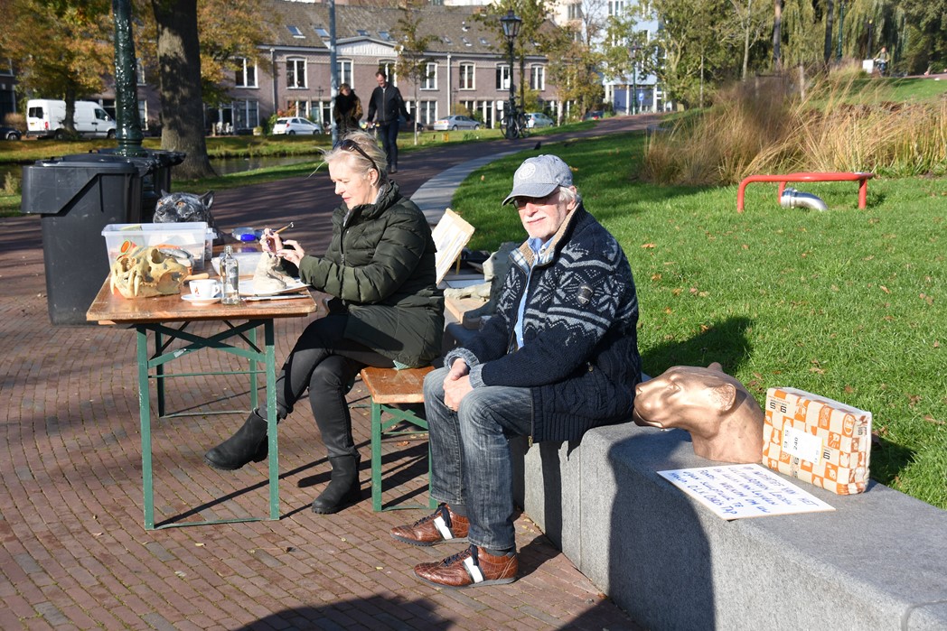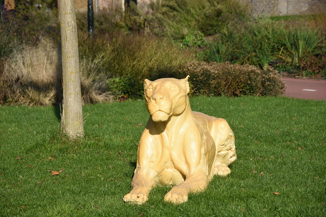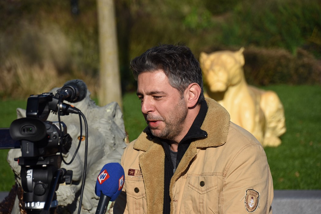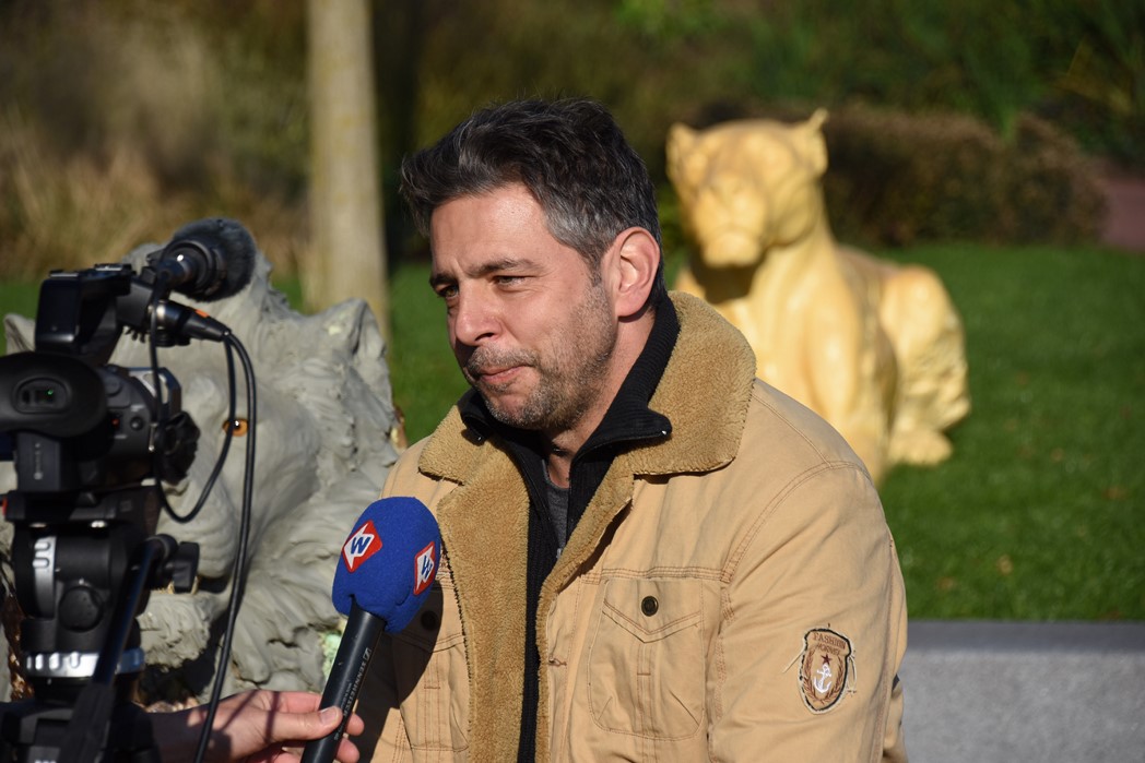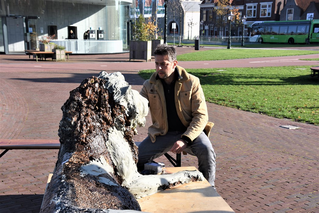 Robbert van Cleef van mediapartner Omroep West in gesprek met beeldend kunstenaar Chris Tap over zijn levensgrote leeuw.
