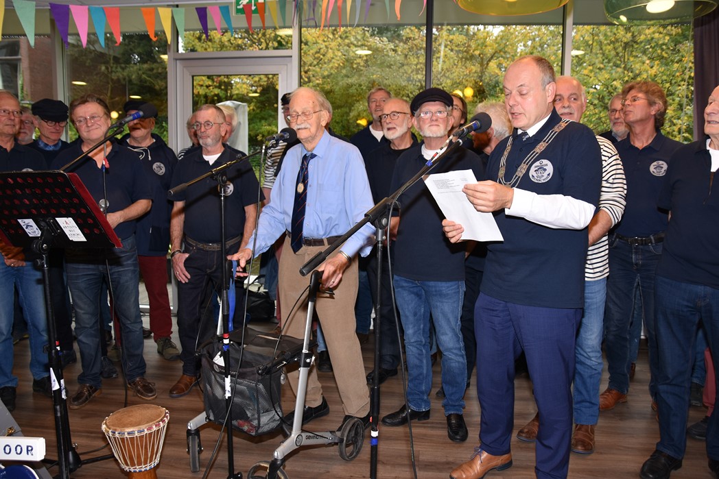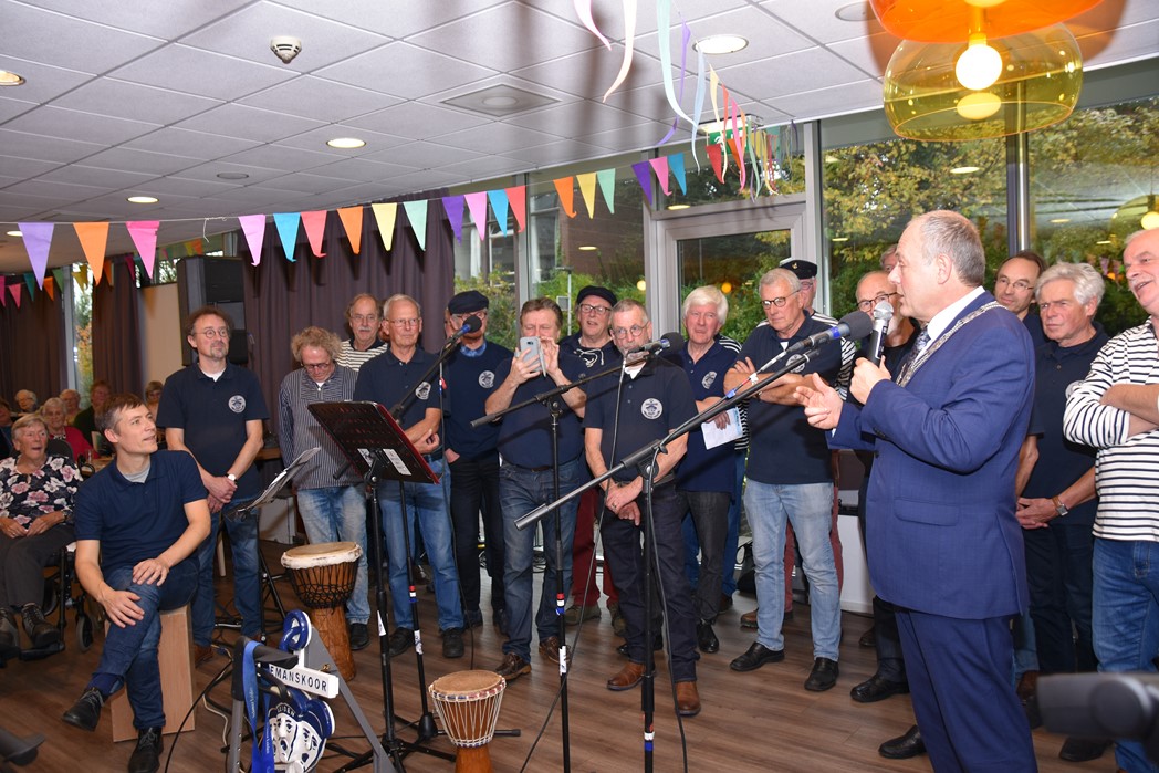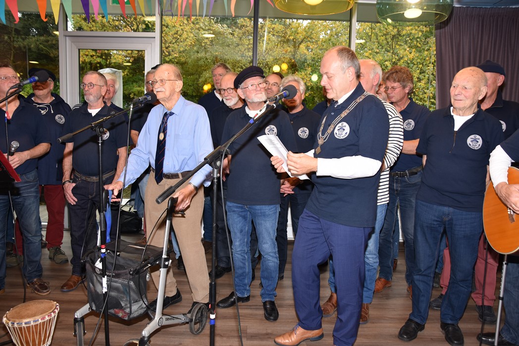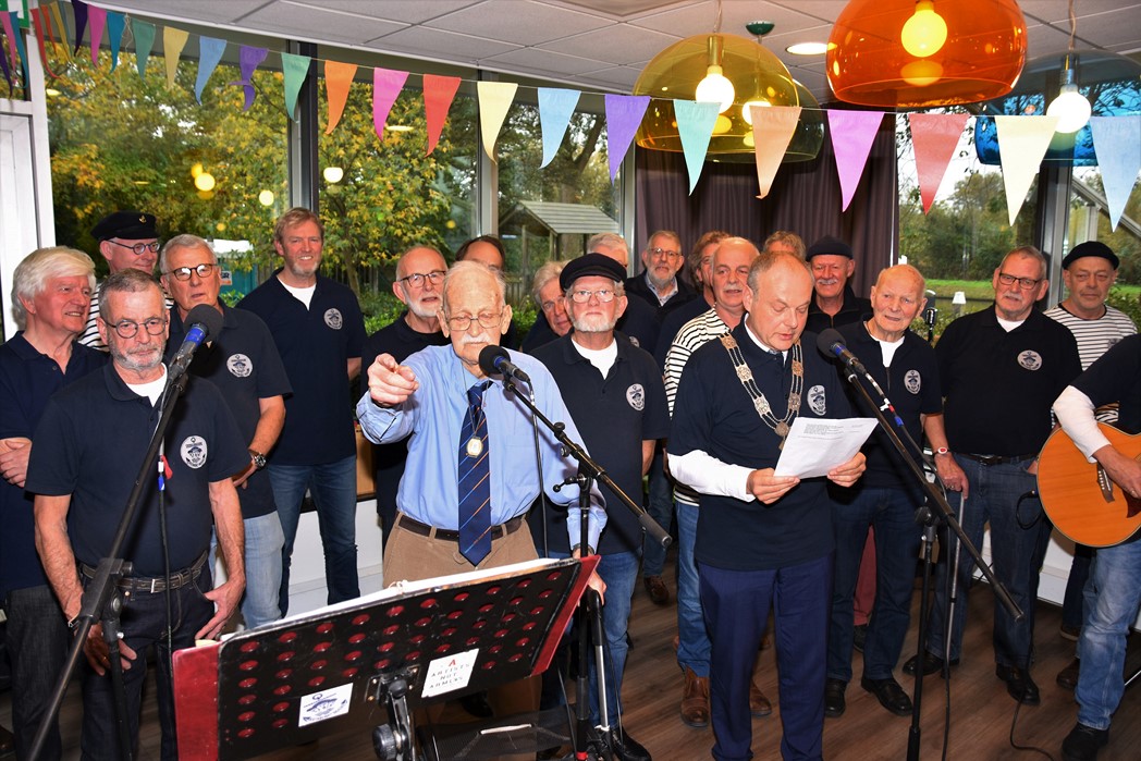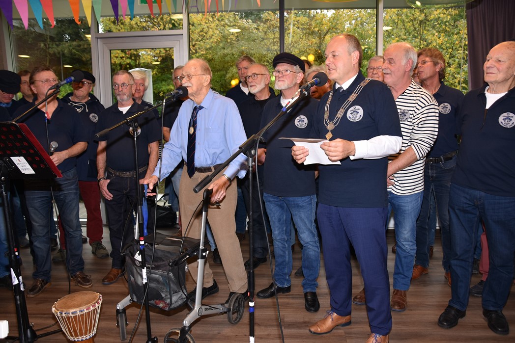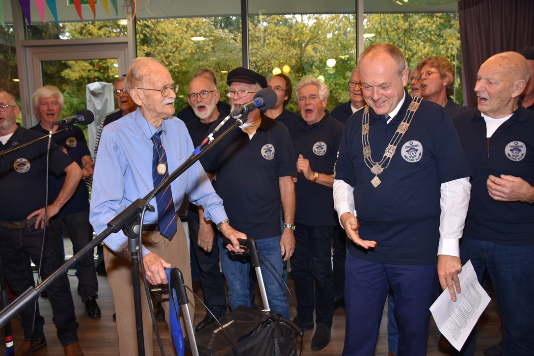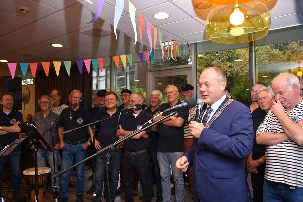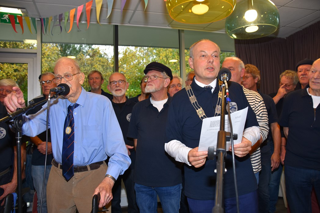 Ko Zonneveld zingt samen met burgemeester Henri Lenferink het lied De Fles