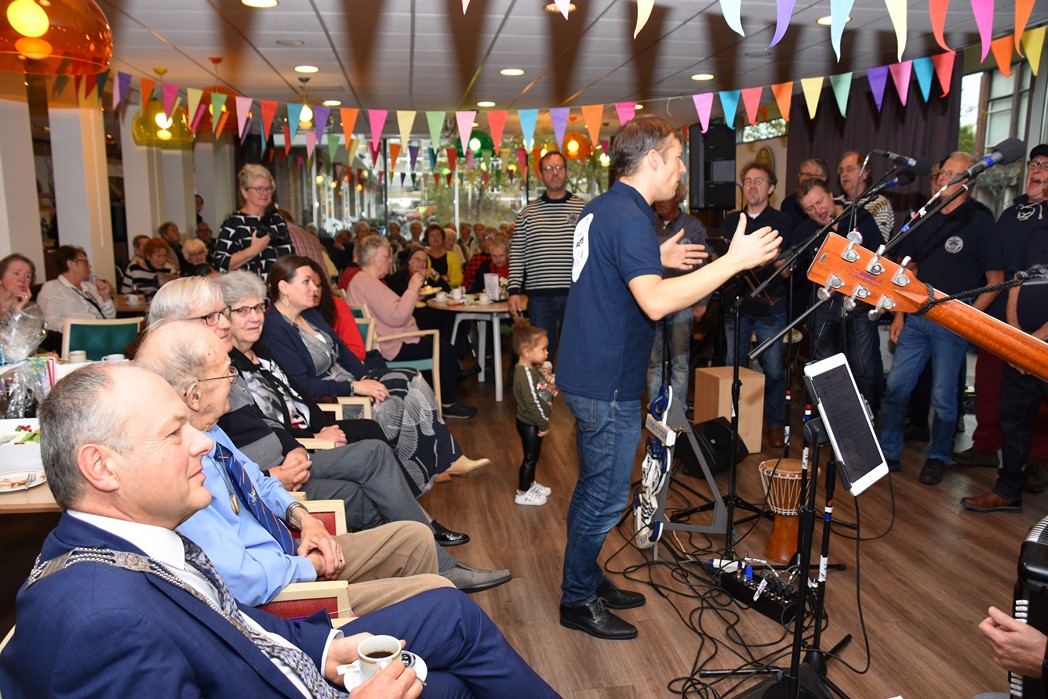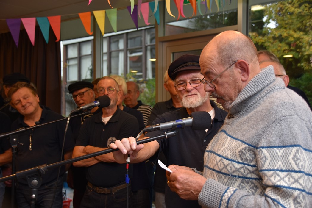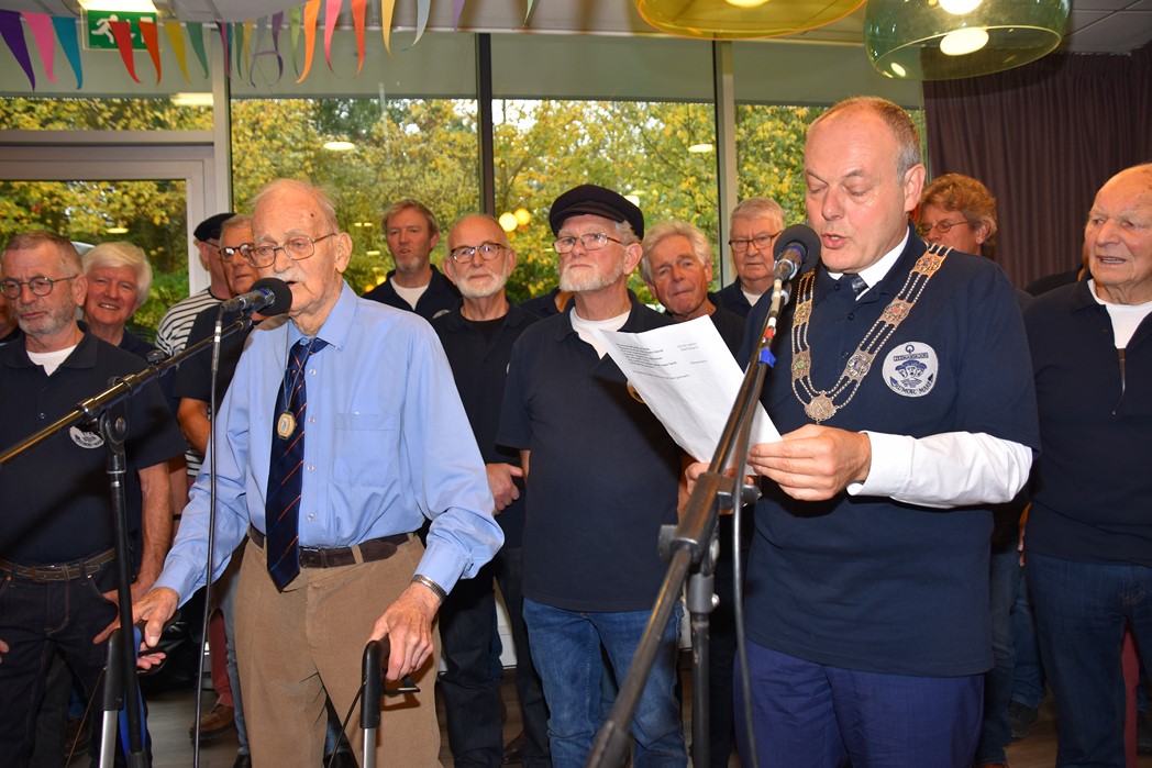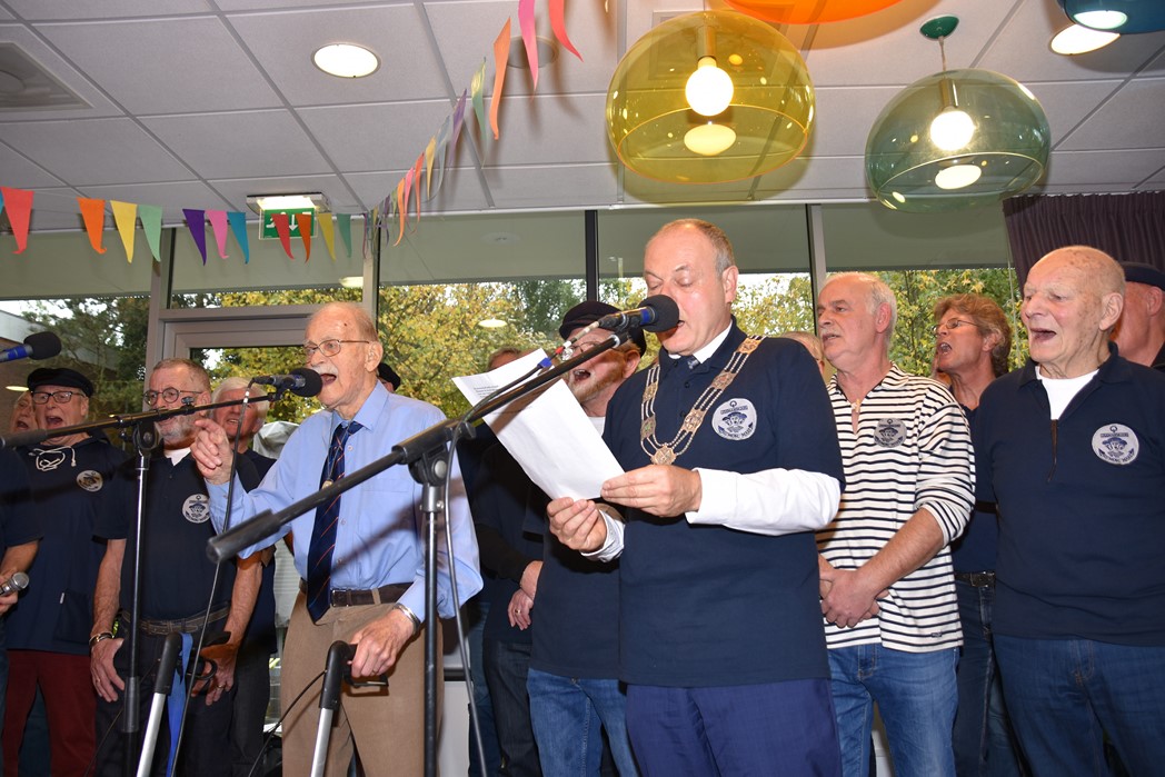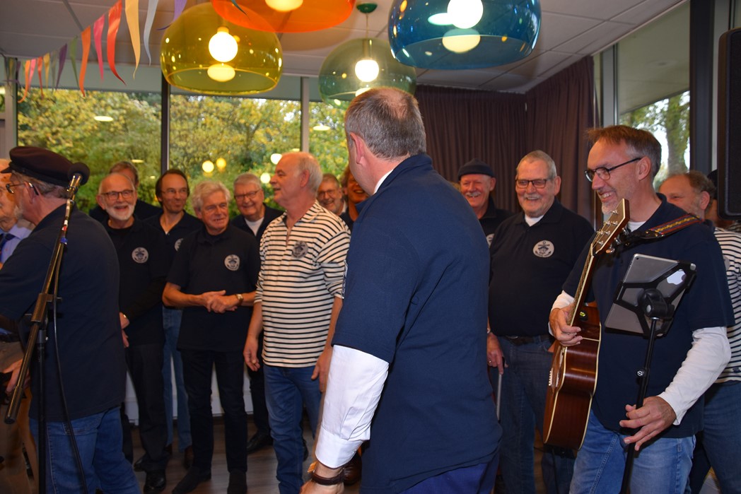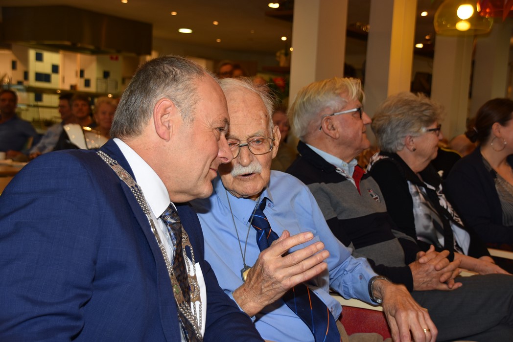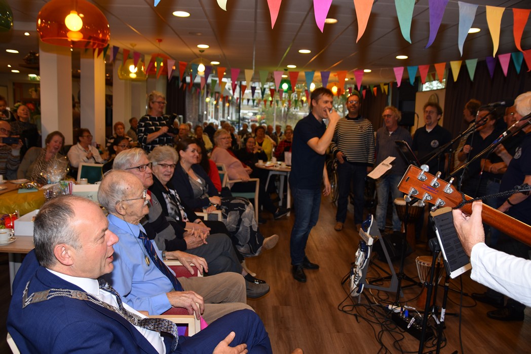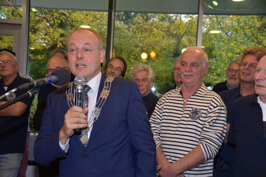 Ko Zonneveld zingt samen met burgemeester Henri Lenferink het lied De Fles