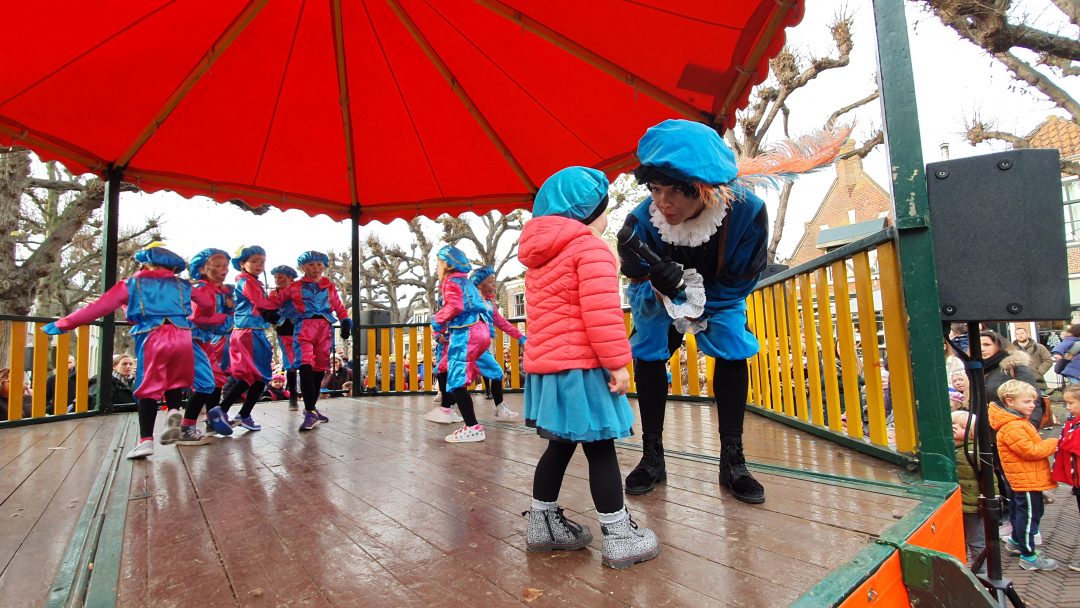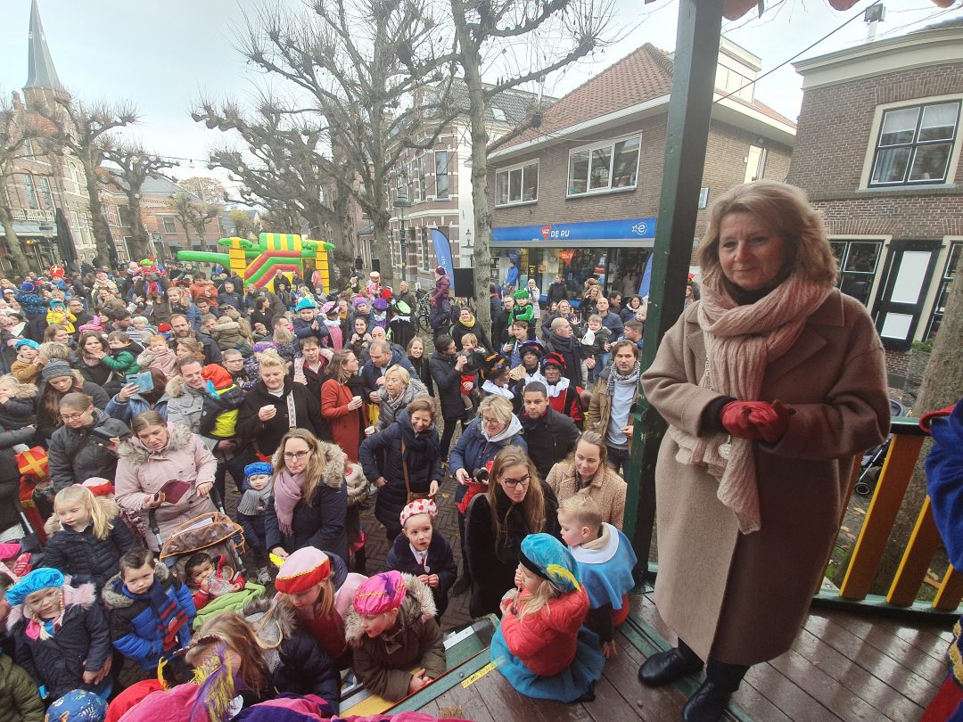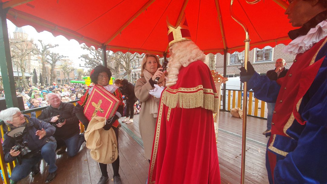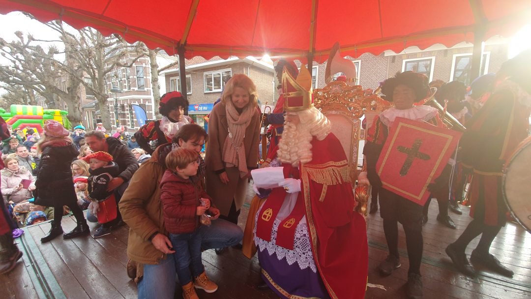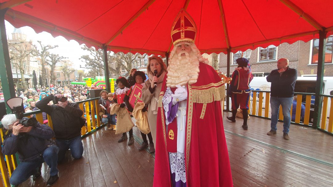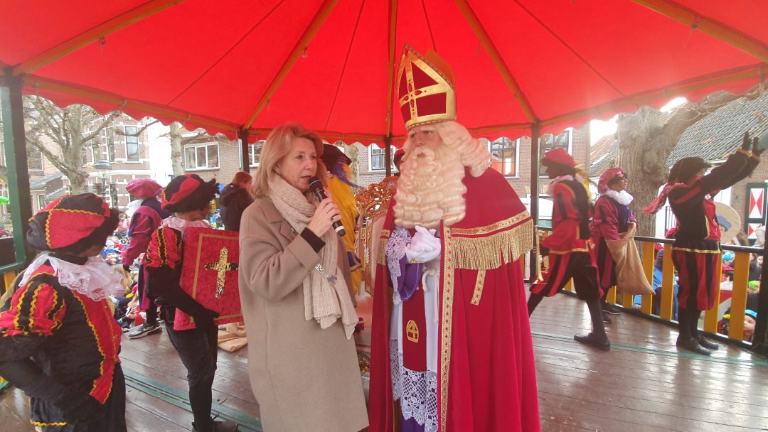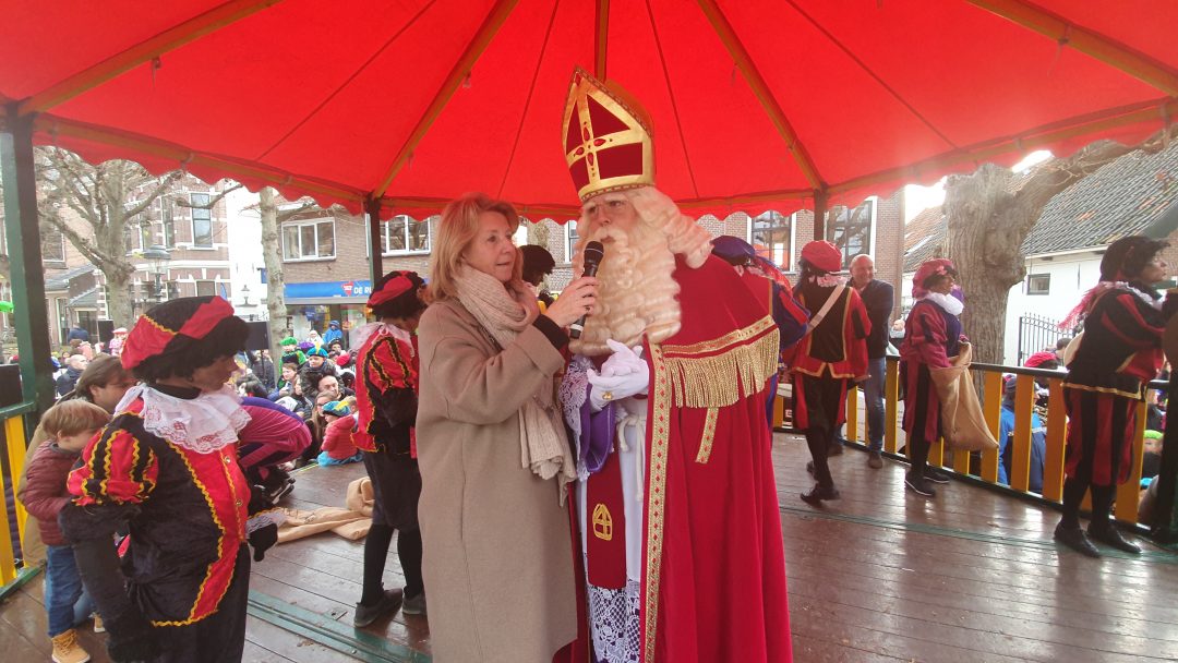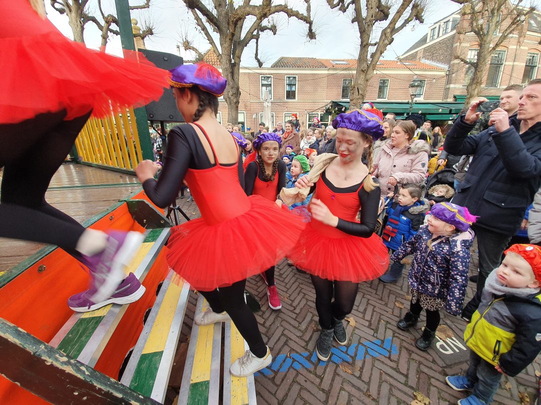 De burgemeester ontving sinterklaas op het podium in de Voorstraat nadat de goedheiligman met zijn pieten eerst een tocht door het centrum had gemaakt. Het toegestroomde publiek werd ondertussen vermaakt door de danspieten van Balletstudio Giselle.
