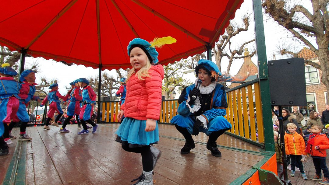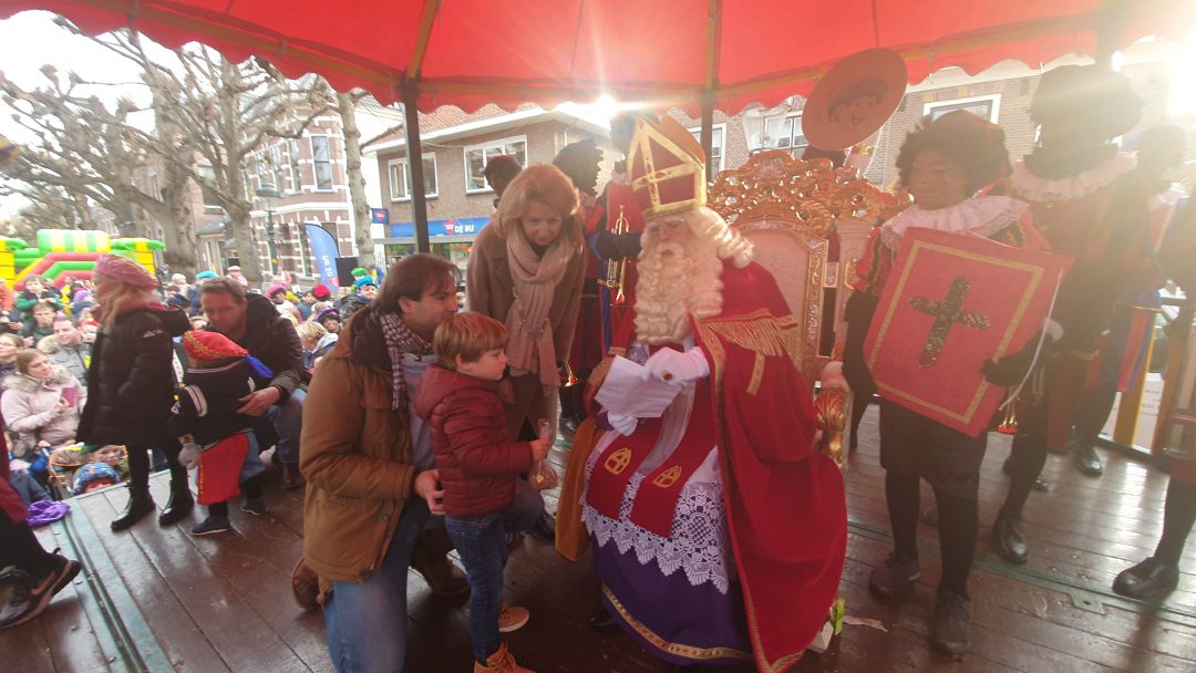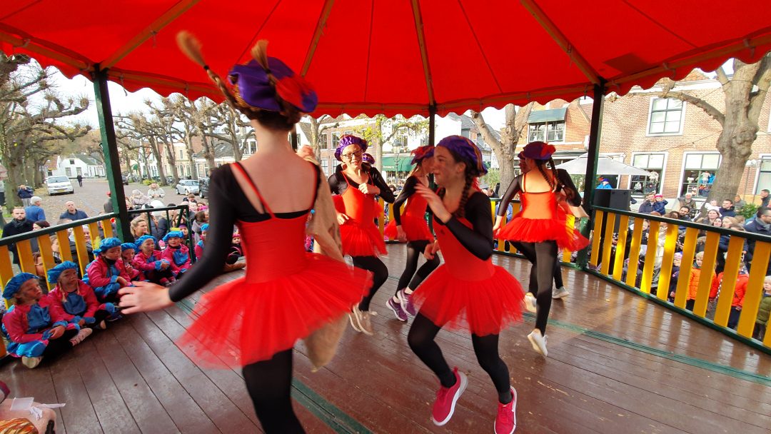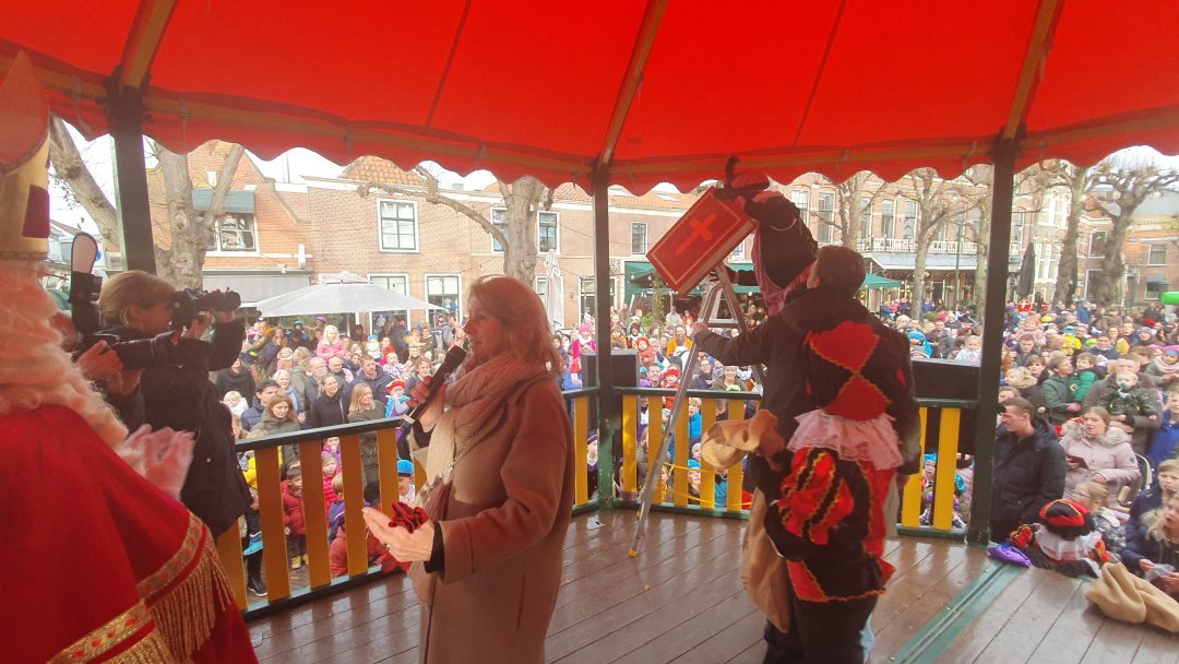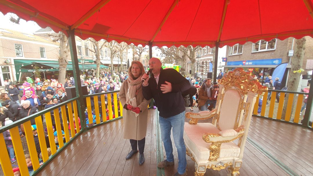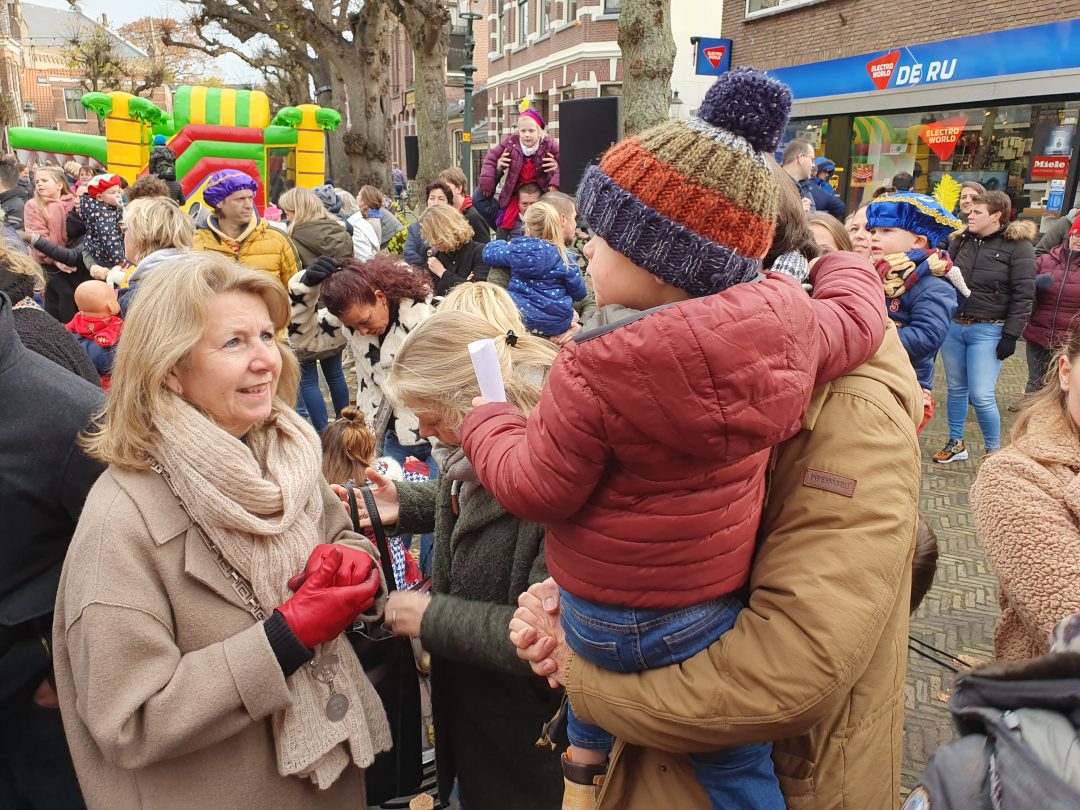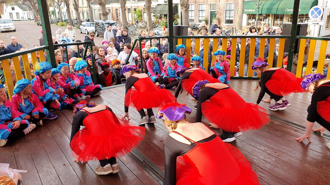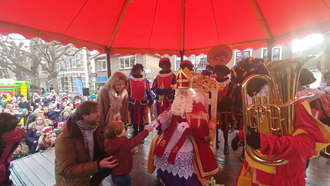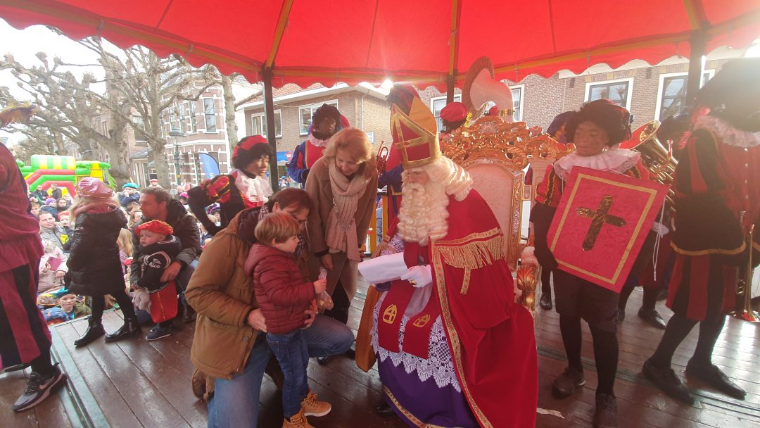 De burgemeester ontving sinterklaas op het podium in de Voorstraat nadat de goedheiligman met zijn pieten eerst een tocht door het centrum had gemaakt. Het toegestroomde publiek werd ondertussen vermaakt door de danspieten van Balletstudio Giselle.