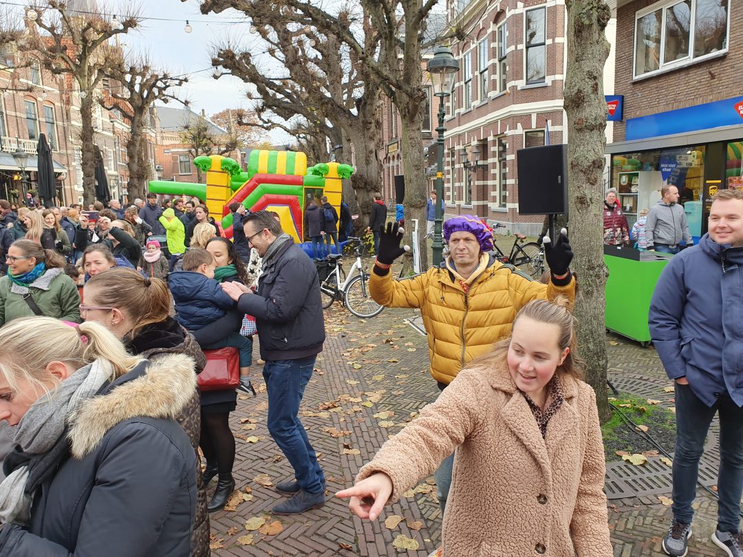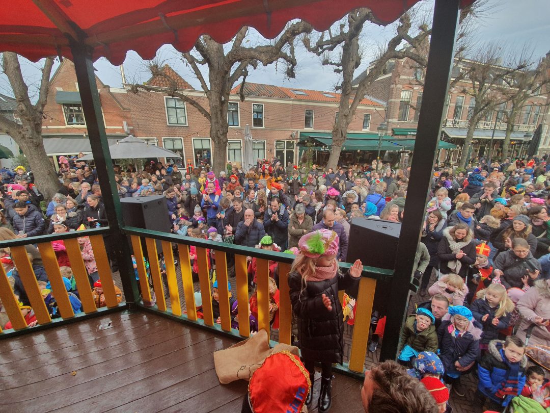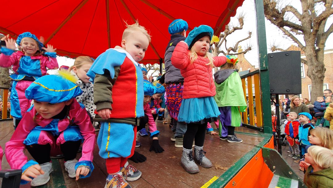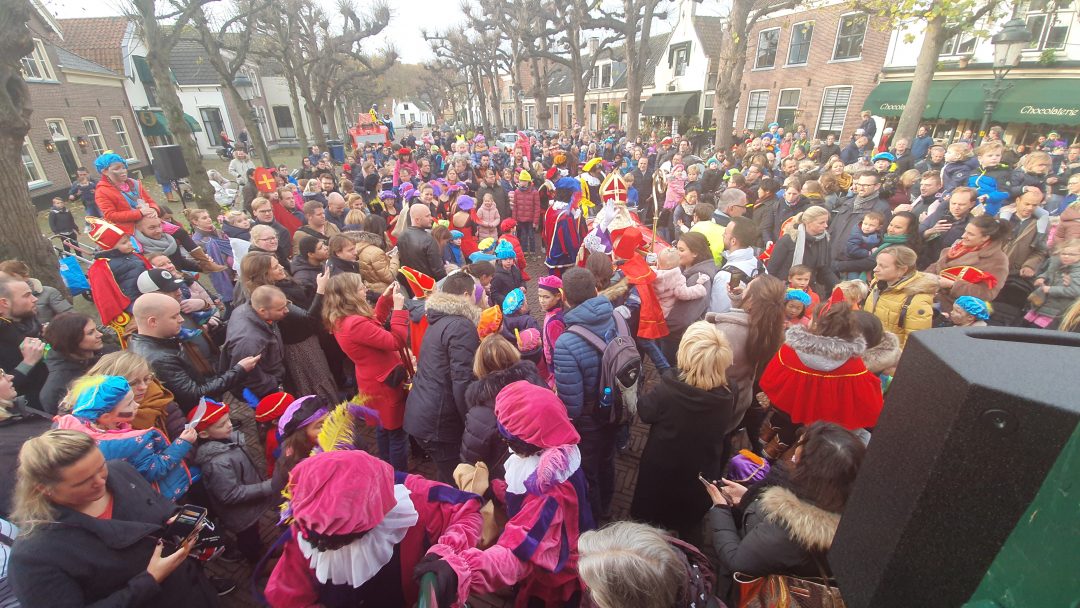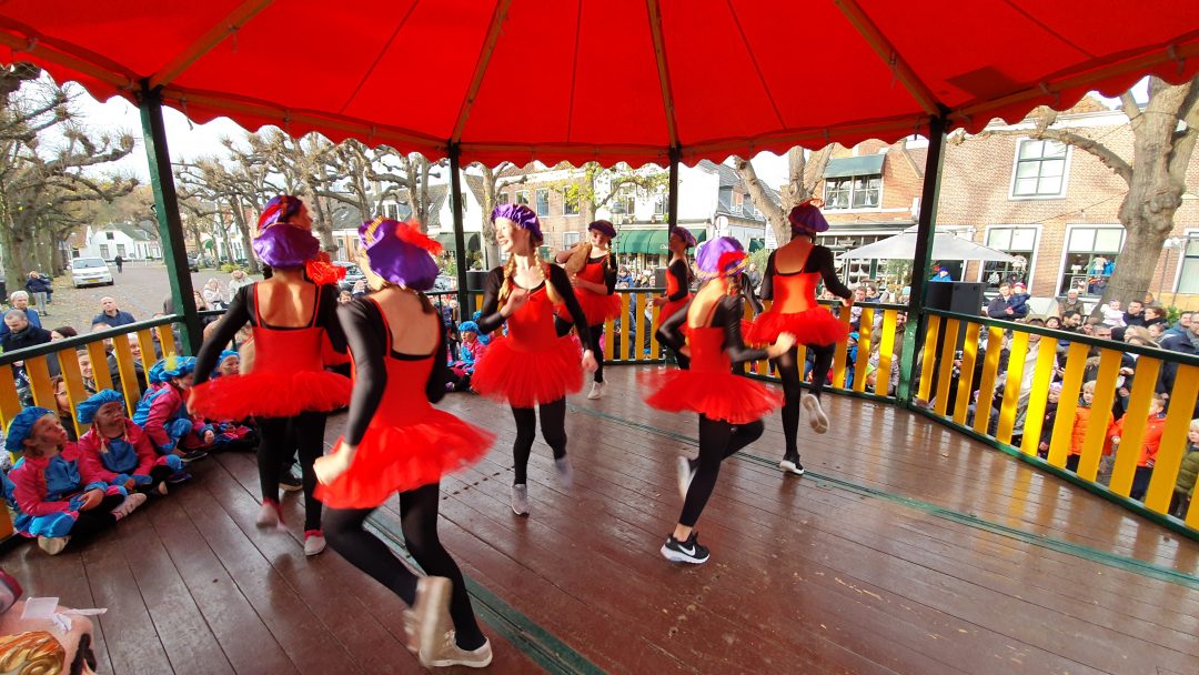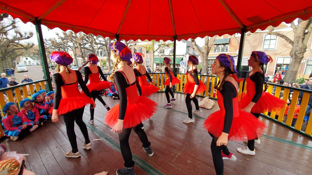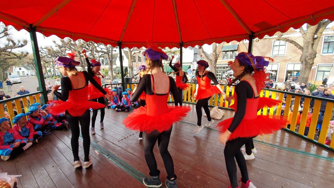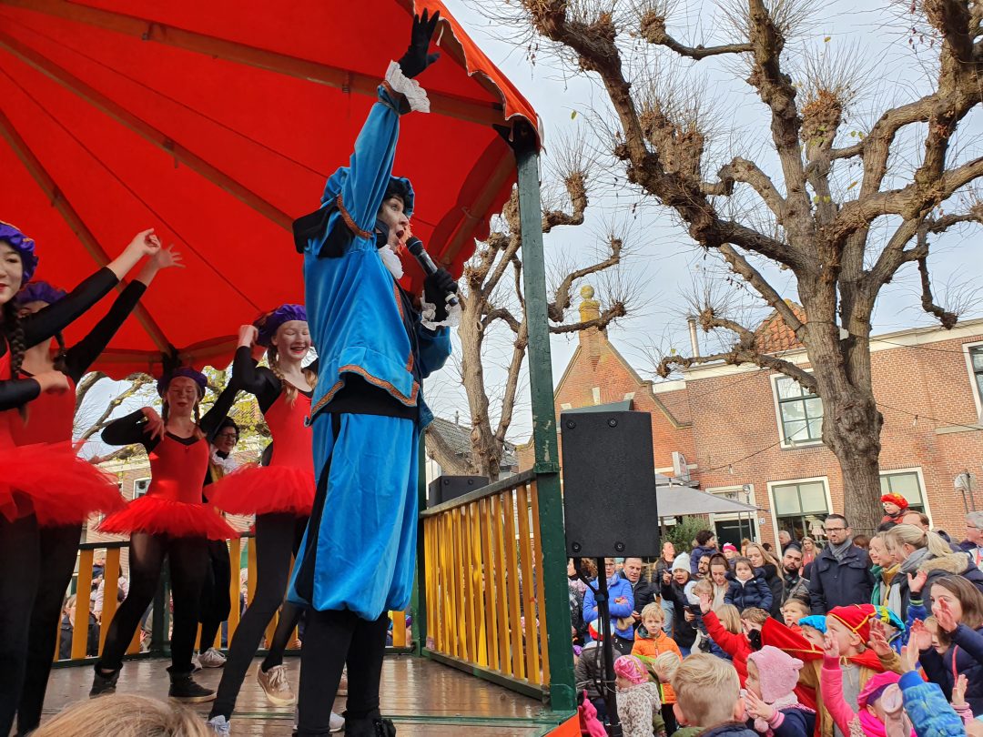 De burgemeester ontving sinterklaas op het podium in de Voorstraat nadat de goedheiligman met zijn pieten eerst een tocht door het centrum had gemaakt. Het toegestroomde publiek werd ondertussen vermaakt door de danspieten van Balletstudio Giselle.