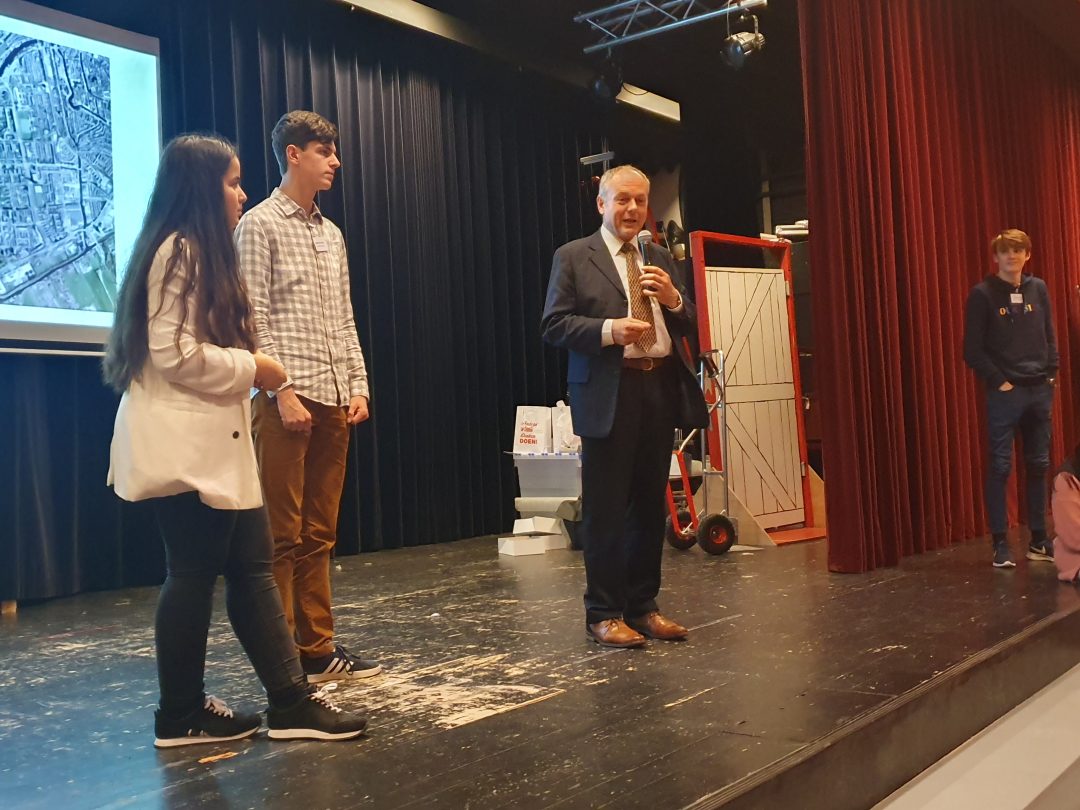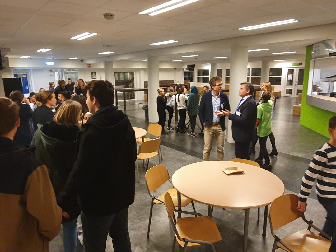 Chris de waard sprak bij het Vlietland College met wethouder Marleen Damen over de collegetoer waarbij de scholieren aan zet waren.