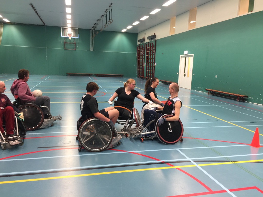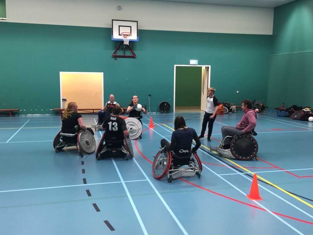 Rugby mag dan te boek staan als een ruige sport voor stoere mannen en vrouwen, de evenknie van deze sport in een rolstoel is duidelijk ook niet voor zachtgekookte eitjes. De spelers van de rolstoelrugbyploeg van de Leidse club DIOK noemen zichzelf ‘Dragons’ en in hun rolstoelen gaan ze aardig tekeer in de gymzaal van het Gebouw waar ze de komende maanden trainen. “Elkaar in de wielen rijden is de tackle van het rolstoelrugby”, zegt Annemarie na afloop van de training.