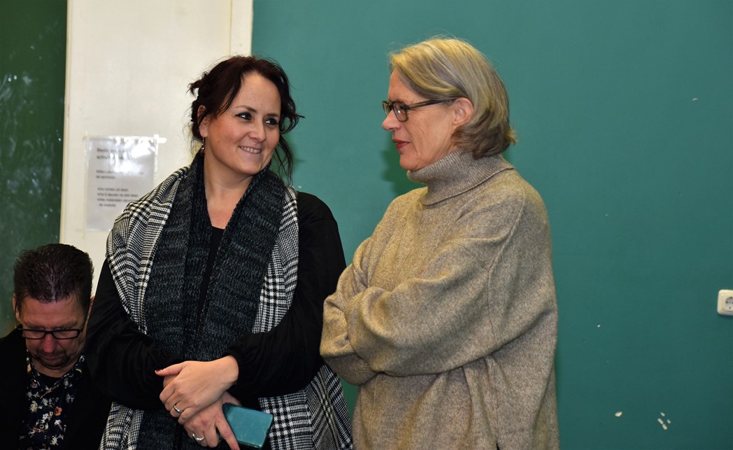 Verslaggeefster Gerry van Bakel in gesprek met leerlingen, Sanne Jongbloed, Anna Rasouli en Marjo van der Luit over Key Mura.