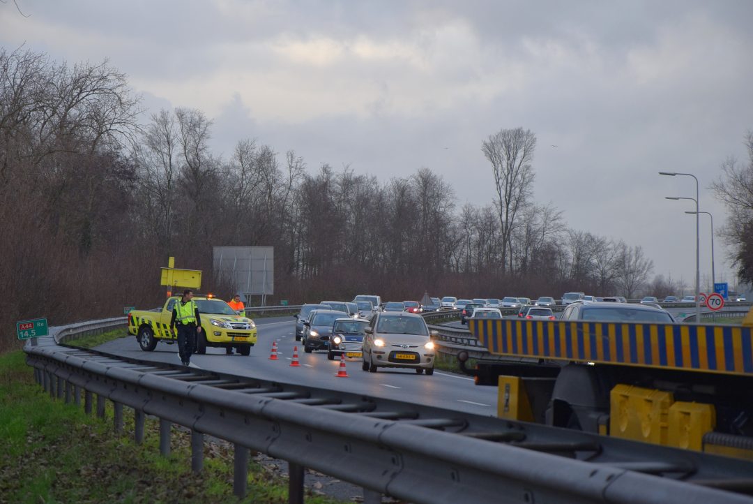 Vlak voor de afslag Oegstgeest/Rijnsburg op de A44 zijn twee auto’s in de namiddag met elkaar in botsing gekomen. Één van de voertuigen kwam door de botsing achterstevoren tegen de vangrails tot stilstand. Het andere voertuig stond een paar honderd meter verderop. Geen van de inzittenden raakte bij het incident gewond. Voor de afwikkeling van het ongeval sloot de politie en Rijkswaterstaat één rijstrook af. Het overige verkeer liep hierdoor vast in een flinke file. Een berger heeft beide voertuigen afgevoerd.