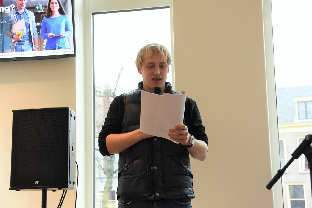Aan stadsdichter Marianne van Velzen de lastige taak een winnaar aan te wijzen. “Ik let erop of een gedicht me raakt, me soms op het verkeerde been zet. Er waren wel vijf of zes gedichten die ik echt goed vond, maar een was voor mij echt de beste.” Winnares Neheh Bagura was helaas afwezig en kon niet zelf haar prijs en het bijbehorende applaus in ontvangst nemen.