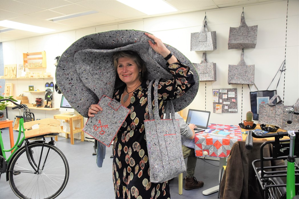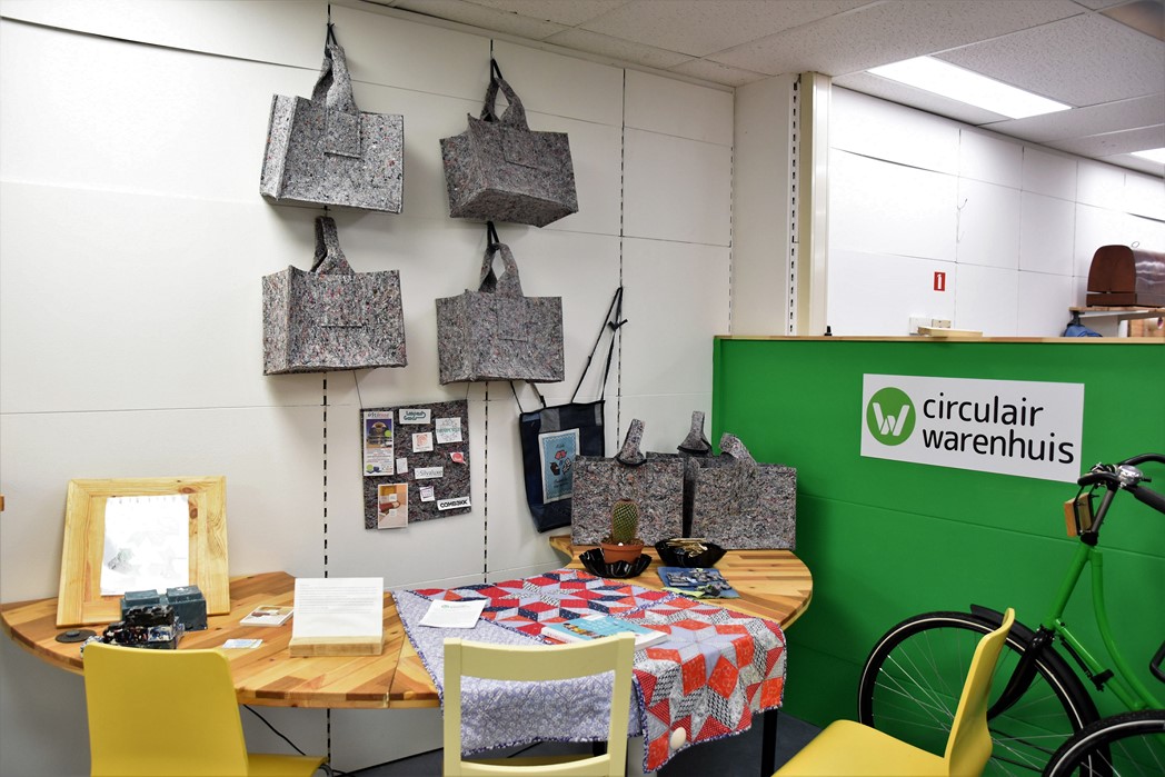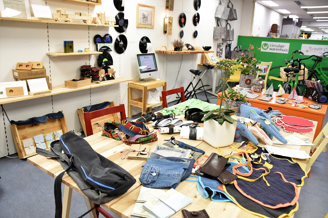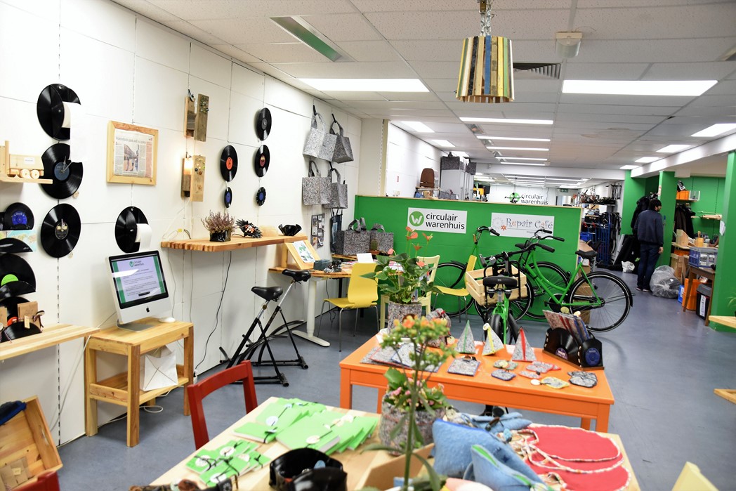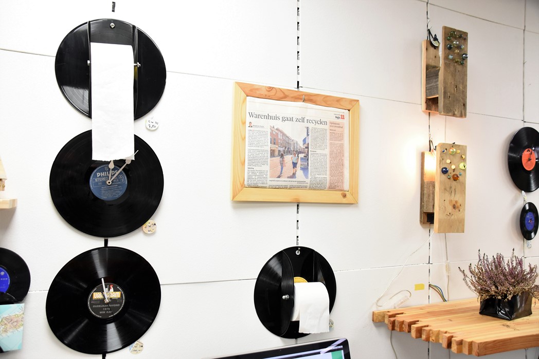 In het winkeldeel van het Circulair Warenhuis vind je dat terug. De vinyl langspeelplaat is misschien nog niet hemelbestormend als klok of tijdschriftstandaard. Maar er ligt ook iets zó simpels dat het nog niet eerder was bedacht: vlaggelijnen met vlaggetjes gemaakt van oude boeken. Zeker die waarvoor oude atlassen zijn gebruikt kunnen met gemak de concurrentie aan met de plastic massaproducten die elders in de straat worden verkocht. Of tassen gemaakt van vilt dat op zijn beurt is gemaakt van oude spijkerbroeken. Zoekt u iets exclusiefs? Kan ook. Houten stopcontacten en schakelmateriaal: veilig en heel bijzonder om te zien. Of de gietijzeren pannen – lóódzwaar, dat wel – gemaakt van Nederlandse spoorstaven, mét aanduiding waar ‘uw spoorstaaf’ ooit lag. Een oud fietsframe nutteloos? Je kunt er barstoelen van maken (kijken, niet uit te leggen). Of een boekenkast annex display van bagagedragers. Van oud NS-plastic vorm je ook dienstblaadjes-net-anders.