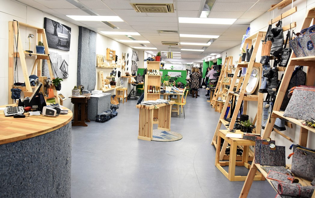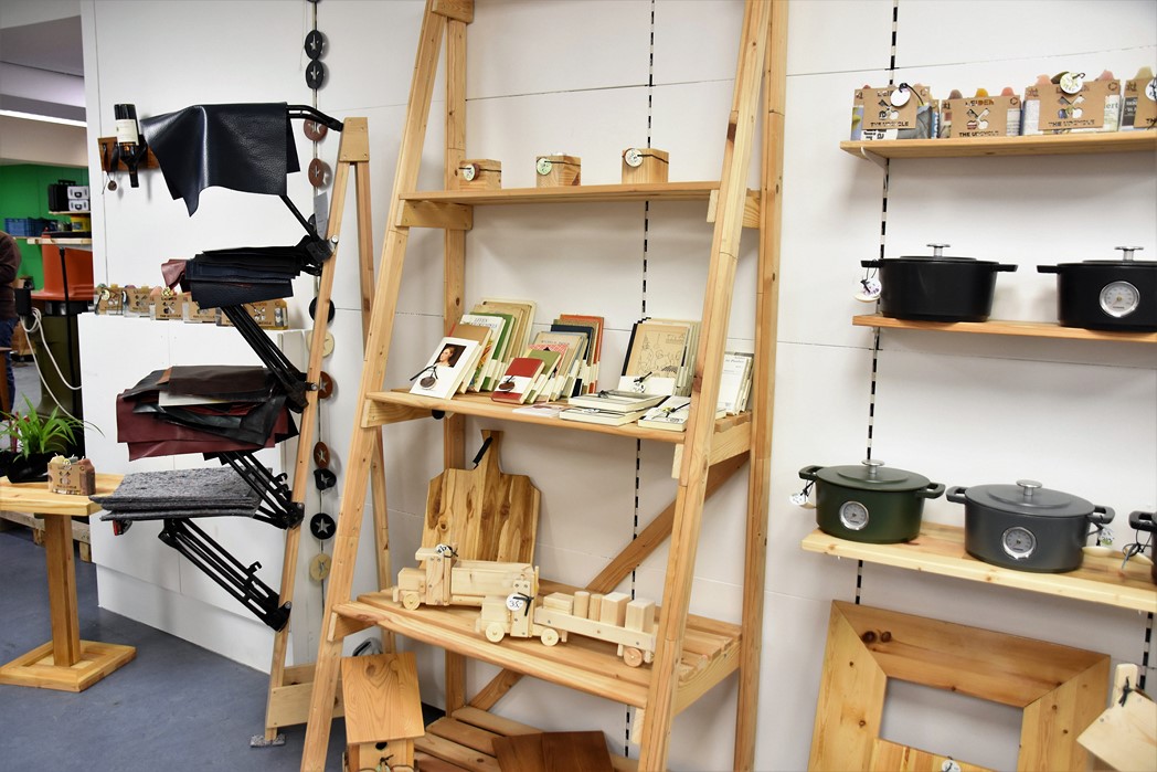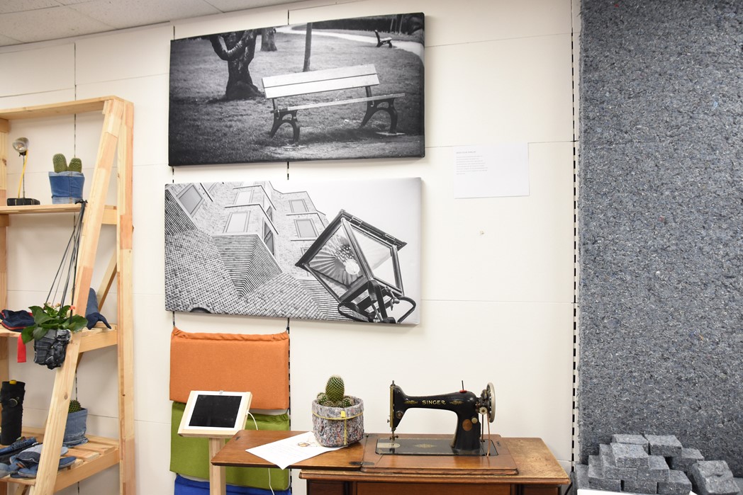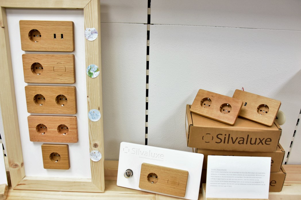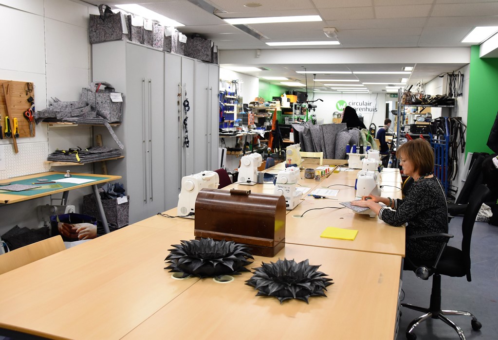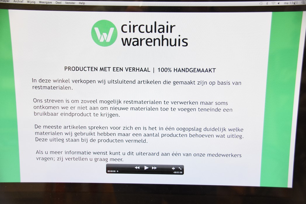 In het winkeldeel van het Circulair Warenhuis vind je dat terug. De vinyl langspeelplaat is misschien nog niet hemelbestormend als klok of tijdschriftstandaard. Maar er ligt ook iets zó simpels dat het nog niet eerder was bedacht: vlaggelijnen met vlaggetjes gemaakt van oude boeken. Zeker die waarvoor oude atlassen zijn gebruikt kunnen met gemak de concurrentie aan met de plastic massaproducten die elders in de straat worden verkocht. Of tassen gemaakt van vilt dat op zijn beurt is gemaakt van oude spijkerbroeken. Zoekt u iets exclusiefs? Kan ook. Houten stopcontacten en schakelmateriaal: veilig en heel bijzonder om te zien. Of de gietijzeren pannen – lóódzwaar, dat wel – gemaakt van Nederlandse spoorstaven, mét aanduiding waar ‘uw spoorstaaf’ ooit lag. Een oud fietsframe nutteloos? Je kunt er barstoelen van maken (kijken, niet uit te leggen). Of een boekenkast annex display van bagagedragers. Van oud NS-plastic vorm je ook dienstblaadjes-net-anders.
