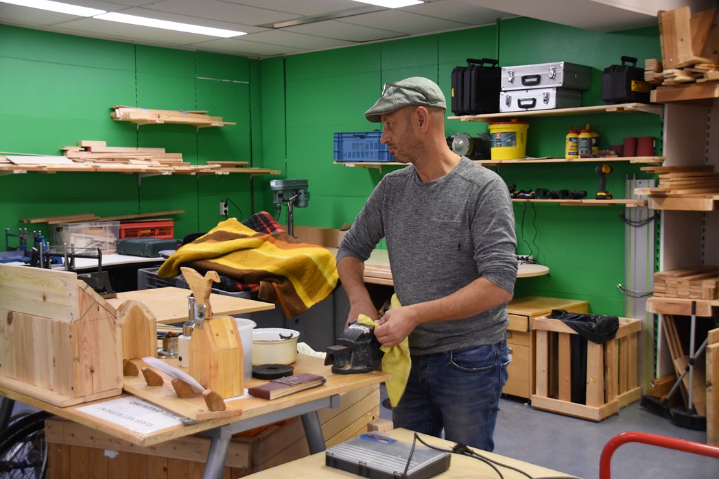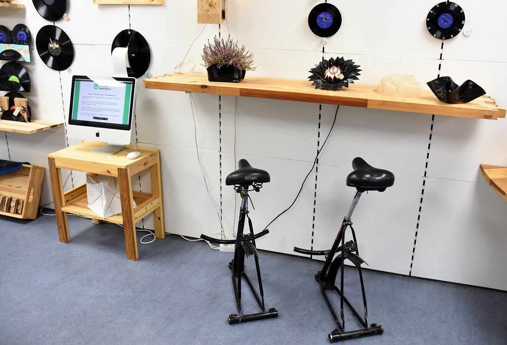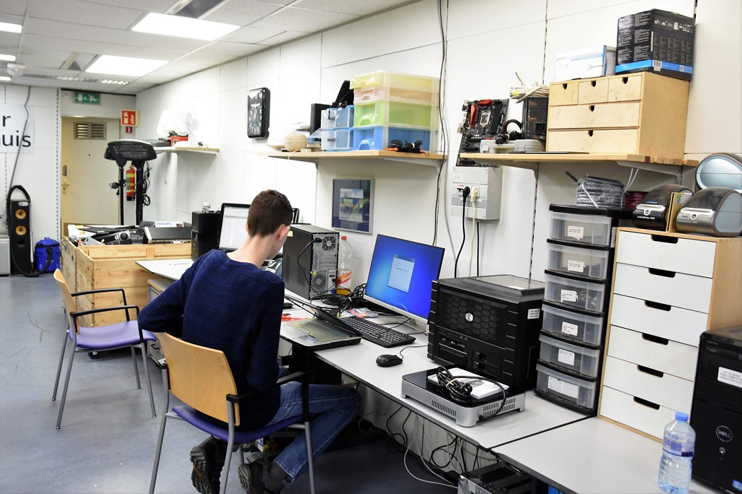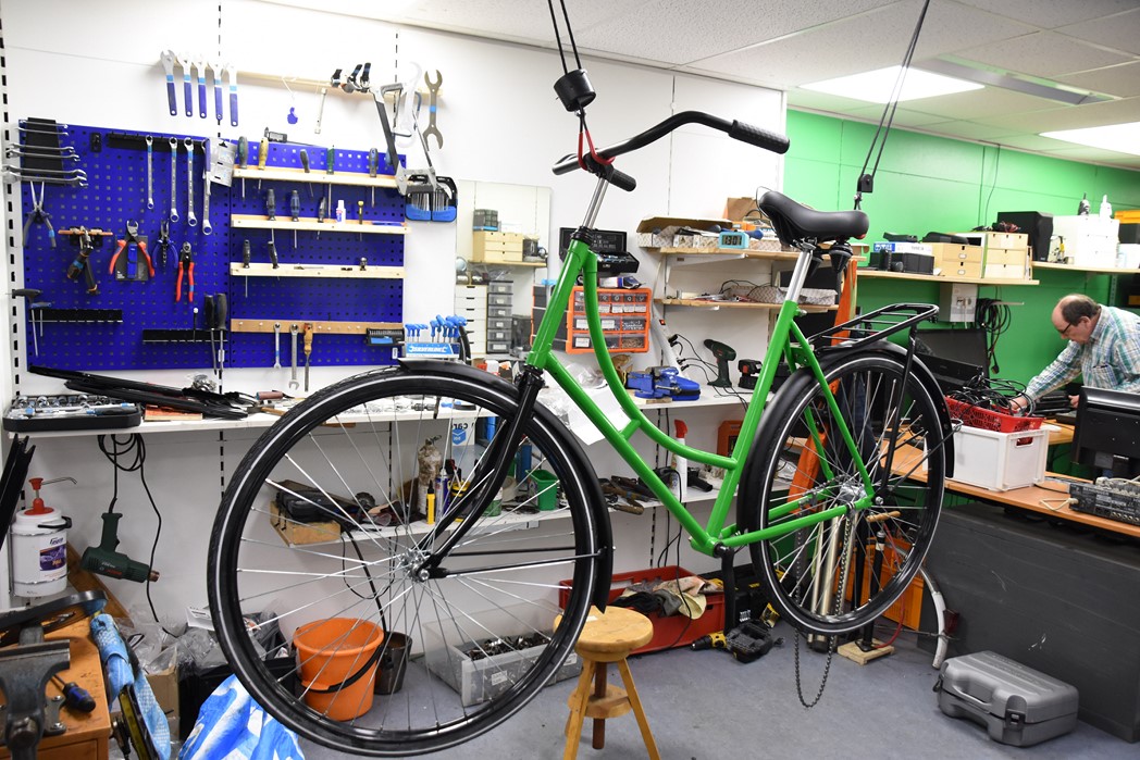 Tweederde van de voormalige winkel van Halfords is in gebruik als werkplaats. Er worden computers nagekeken “maar dat is voor Het Warenhuis en is ook veel te bewerkelijk en duur om iets mee te doen”. Er staan naaimachines. Maar het interessants is niet eens echt te zien. Wie hier werkt, verdient studiepunten. Daarmee kan een studie worden gevolgd. Gemiddeld na twintig weken. En de fietsen; die zijn voor verhuur aan bedrijven. Maar de glimmend-groene nieuw ogende stadsfiets was dus ooit wel degelijk een afdankertje!