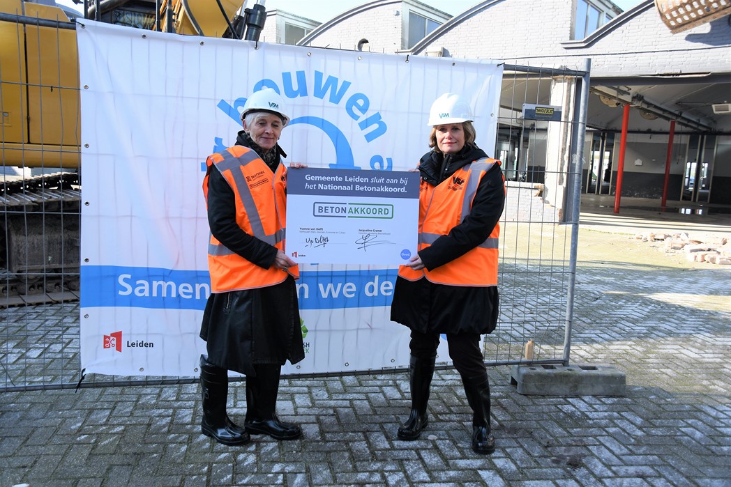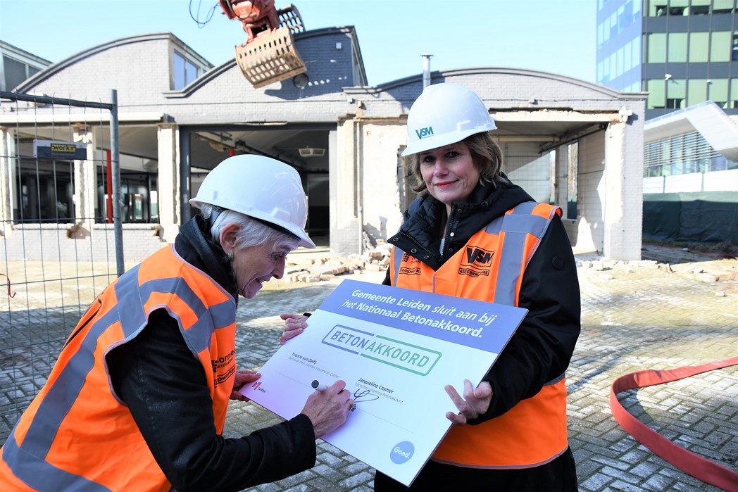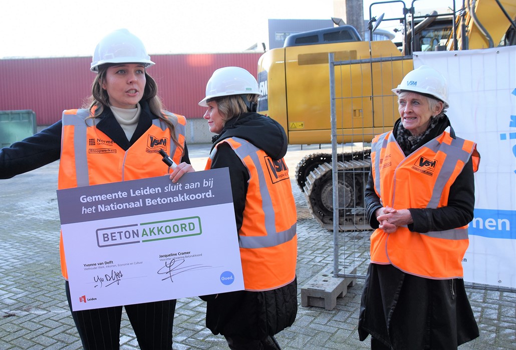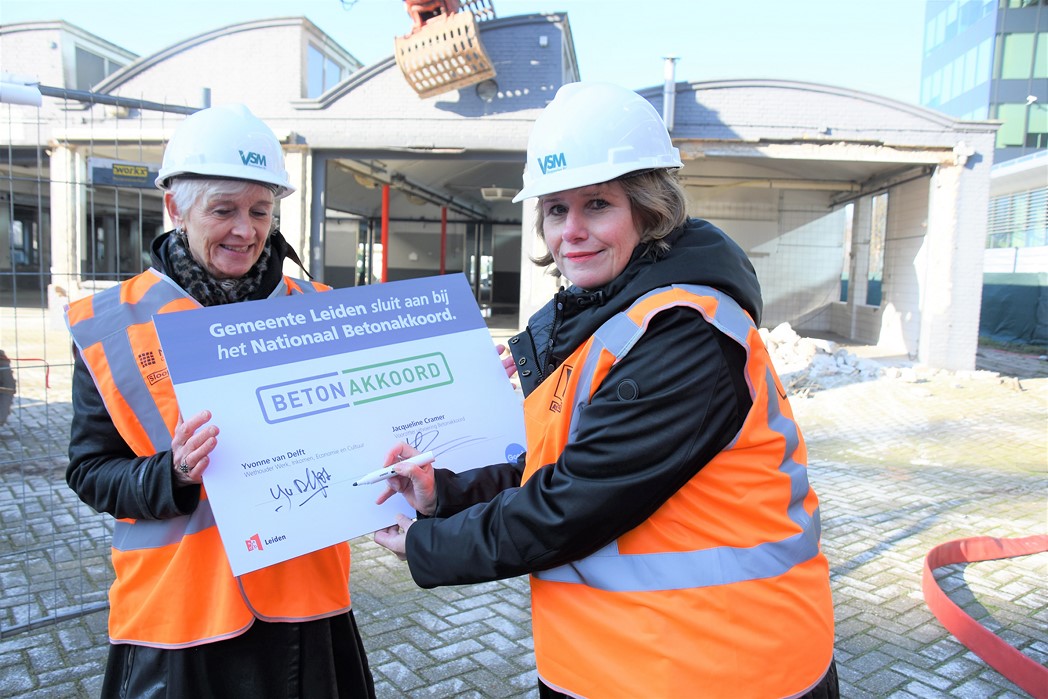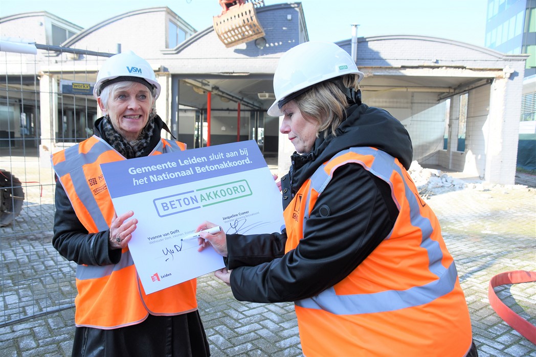 Vrijdag 7 februari 2020 ondertekende wethouder Werk, Inkomen, Economie & Cultuur Yvonne van Delft (GroenLinks) namens de gemeente Leiden het Betonakkoord. Zoals dat gaat, was dat een symbolische daad. De wethouder en mevrouw Jacqueline Cramer (voorzitter van het Betonakkoord) zetten beiden een handtekening op een bord, waarna Van Delft met een sloopmachine een aantal flinke happen nam uit dak en achtergevel van Lammenschansweg 128. De indertijd daar gevestigde autodealer maakt nu plaats voor een plein in de Lammenschansdriehoek.