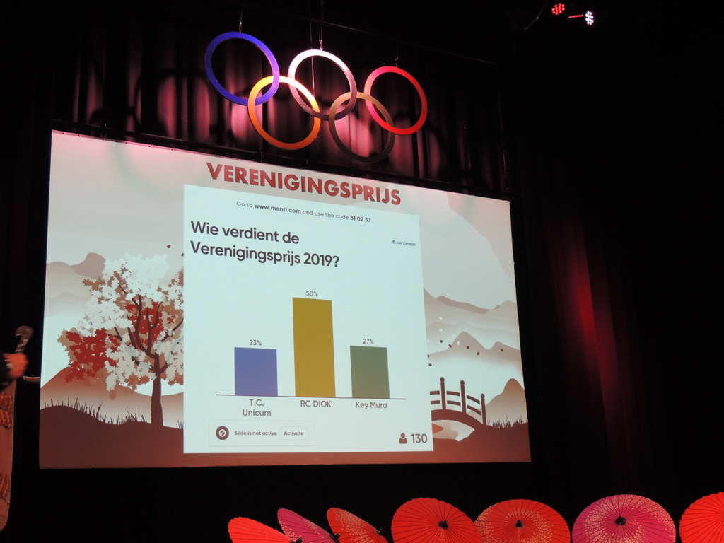 Voor de titel sportvereniging van het jaar werd er ter plekke in de zaal gestemd. Dat DIOK een grote achterban heeft bleek niet alleen uit het binnenhalen van de publieksprijs waar het publiek de afgelopen weken voor kon stemmen. Ook van de aanwezigen in de zaal kreeg DIOK meer dan vijftig procent van de stemmen. Deze prijs werd dit jaar voor het eerst uitgereikt. Met deze nieuwe categorie willen de gemeente en de Leidse Sportfederatie ook de breedtesport eren en verenigingen in het zonnetje zetten die in 2019 net iets extra’s hebben gedaan. Ook Tennis- en padelvereniging Unicum en sportschool Key Mura waren genomineerd voor de titel ‘vereniging van het jaar’.