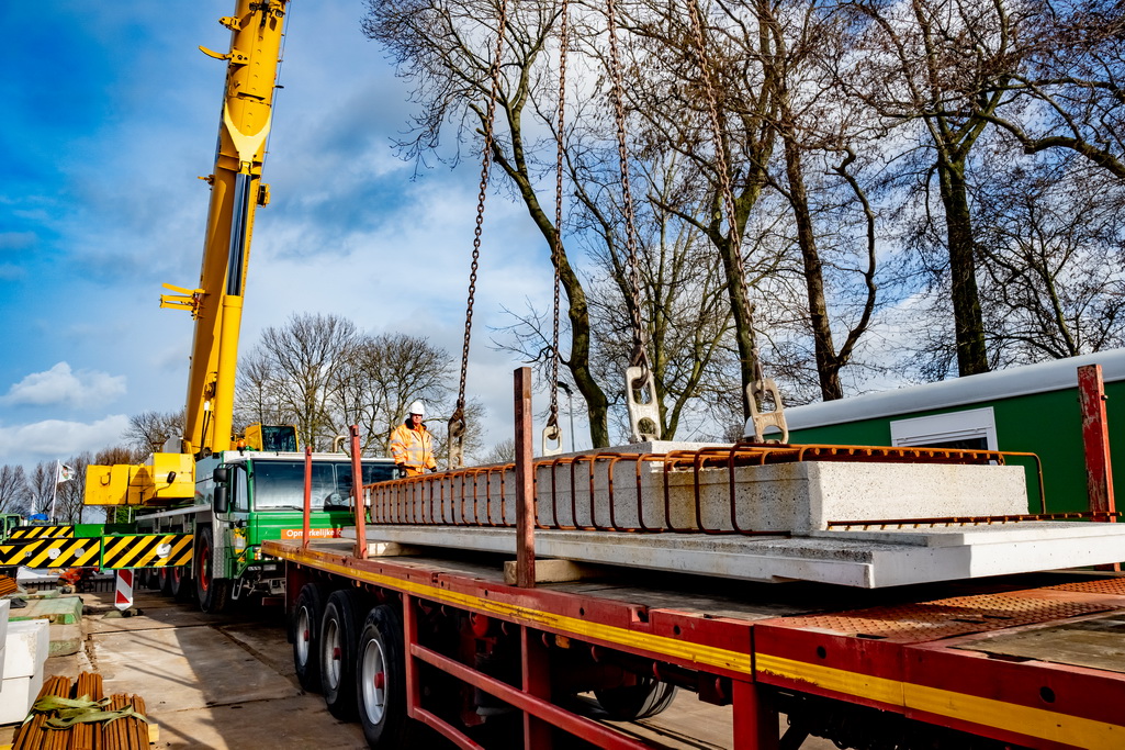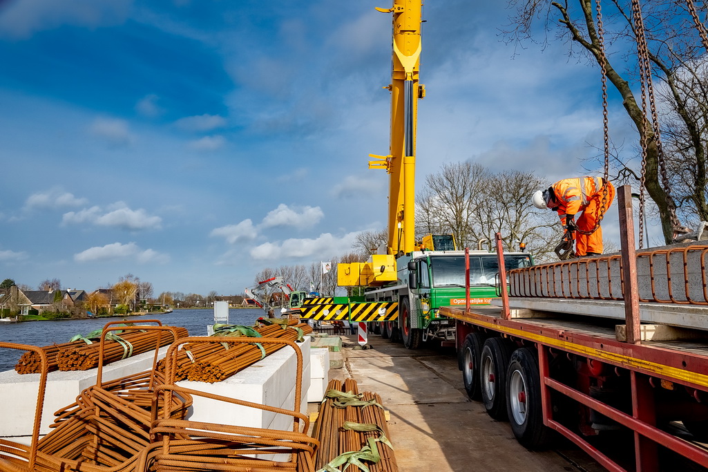Vandaag zijn de brugliggers gelegd, één week eerder dan gepland. Daarmee is de verbinding van A naar B weer gemaakt. De komende dagen wordt de brug ingevlochten. De brug wordt gebouwd door aannemersbedrijf Gebr. Schouls uit Leiden. Zij zijn verantwoordelijk voor meer befaamde bruggen in de regio. Zo hebben ze ook de prijswinnende Leidse Catharinabrug aangelegd. De nieuwe brug kan zestig ton dragen, dat is drie keer zoveel als de oude brug.