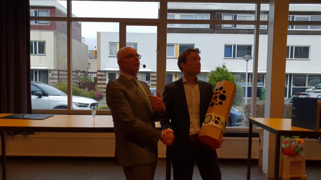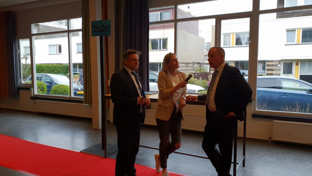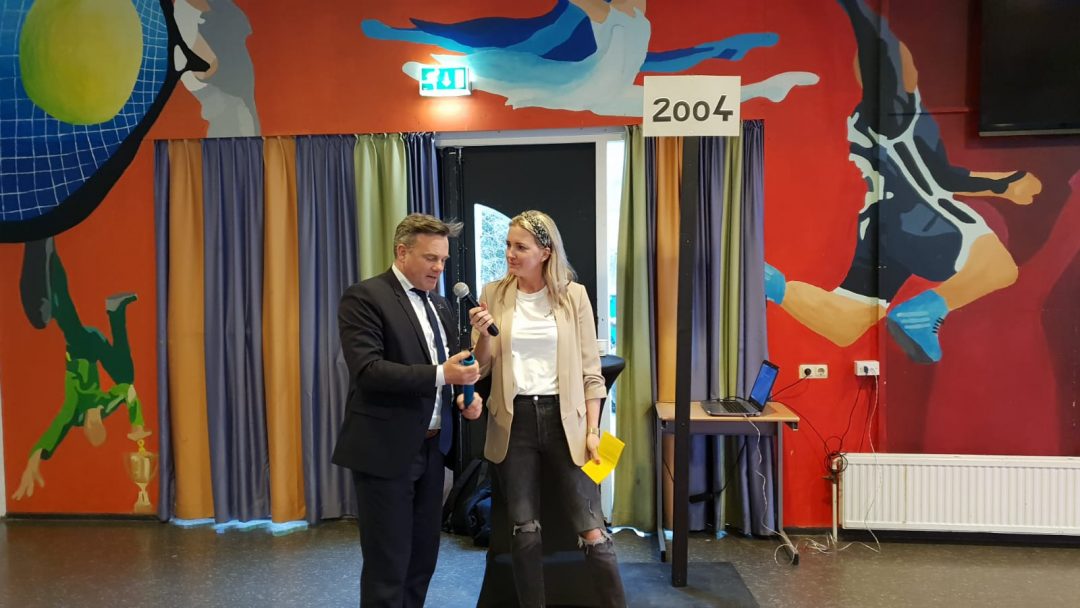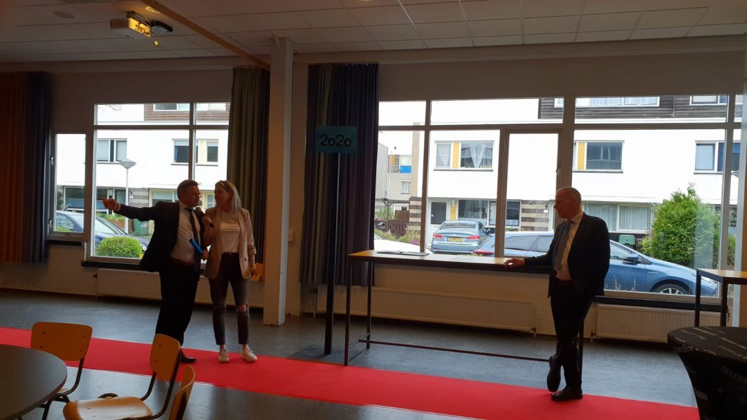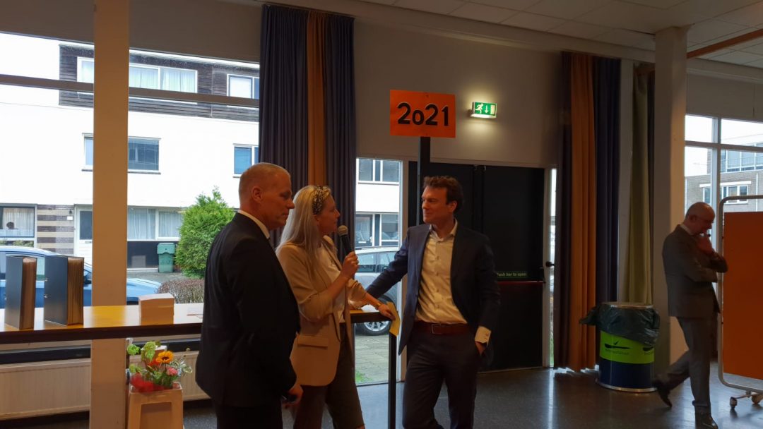 Reanne van Kleef in gesprek met wethouder Paul Dirkse over de nieuwbouw van het Leonardo College.