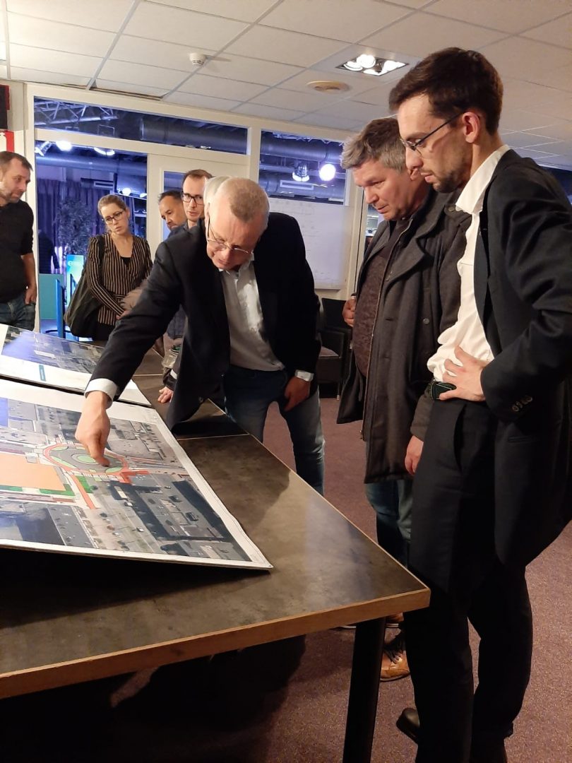 Chris de Waard sprak bij de bewonersavond over de rotonde met verkeerskundig adviseur Joost Klimbie van de gemeente Leiden en met wethouder Ashley North.