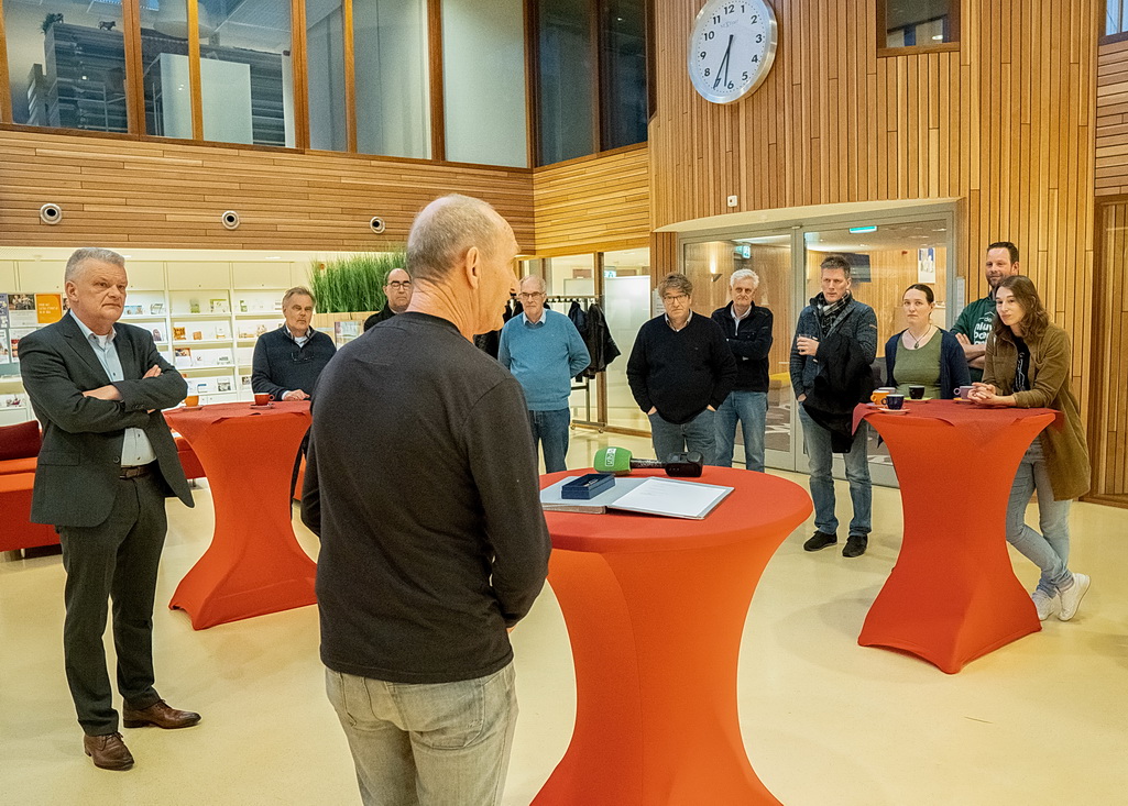 Reanne van Kleef in gesprek met wethouder Daan Binnendijk, Theo van Leeuwen van Groene Klaver en Bert van Leeuwen van VAN Ade over weidevogelconvenant Leiderdorp.