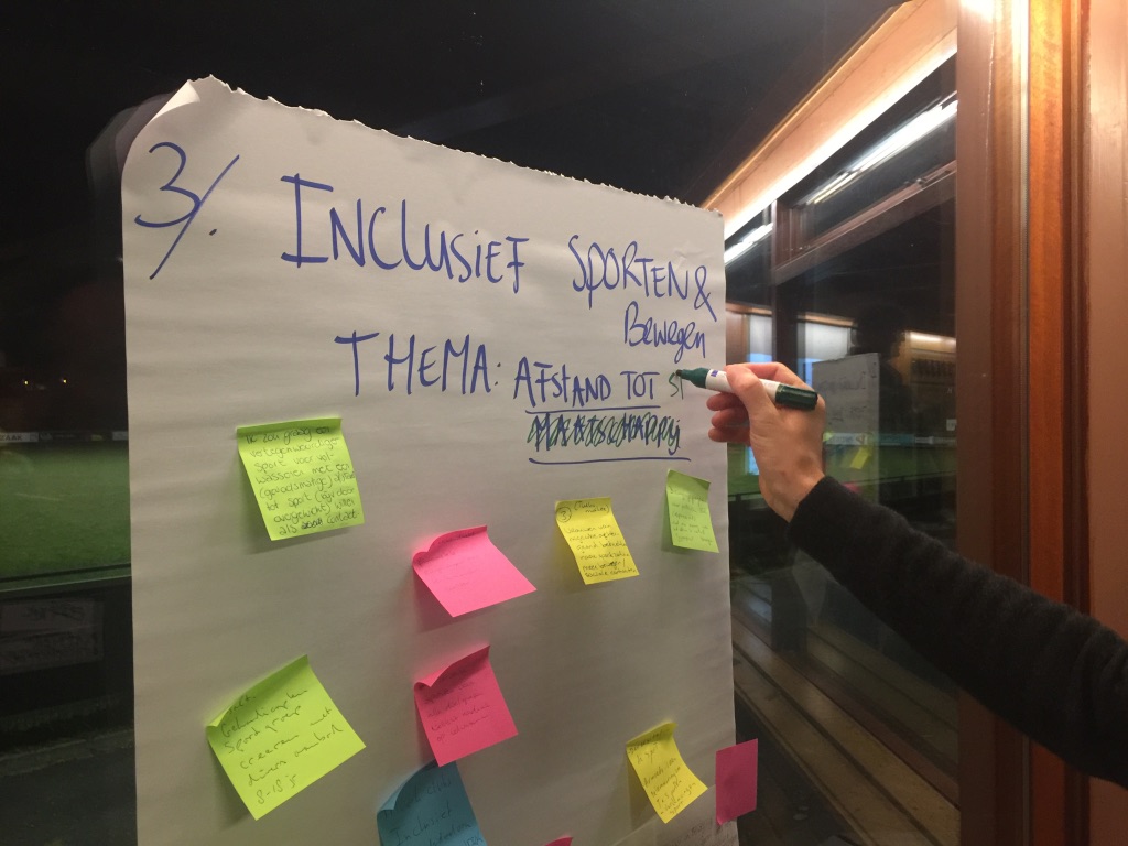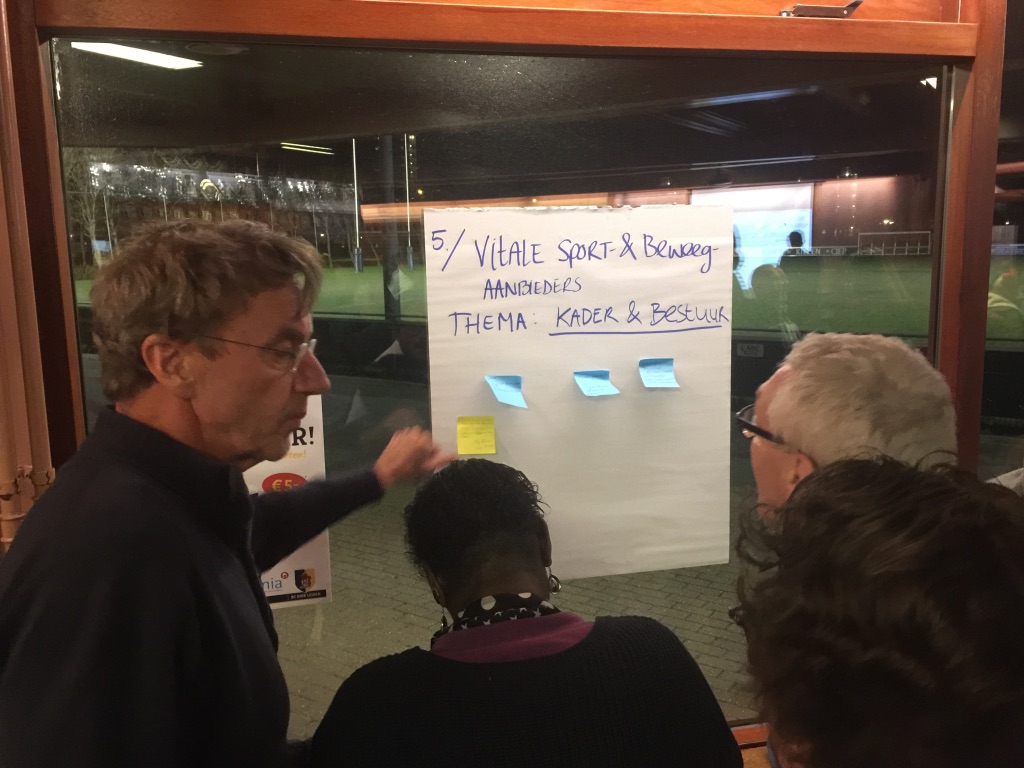 Sportformateur Mijke Sluis had twee buurtsportcoaches uit Rijswijk en Delft uitgenodigd om alle aanwezigen te voorzien van wat praktijkvoorbeelden. Sjors Grasman en Mike van der Kraan namen in sneltreinvaart een aantal initiatieven door waarbij op slimme wijze gebruik werd gemaakt van accommodaties, kennis en mensen. Sluis hield wel de tijd in de gaten, want al die Leidse sportliefhebbers moesten vooral zelf aan de slag. Eerst mochten er briefjes worden geplakt op posters met ideeën, vragen, wensen, opmerkingen en plannen.