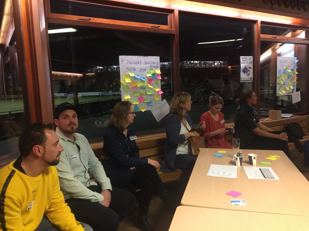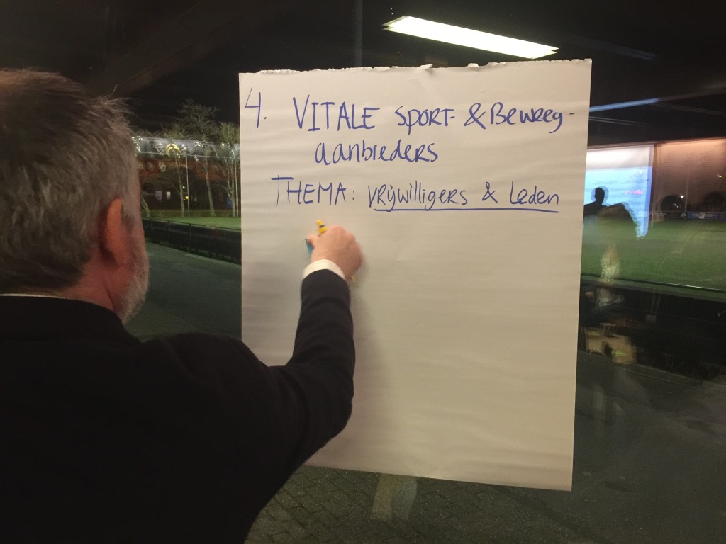 Bij de plenaire terugkoppeling van de tafelgesprekken komt ook naar voren dat verenigingen en organisaties wel willen en ook al van alles organiseren, maar daarbij een platform missen waarop dit allemaal samenkomt. Bijvoorbeeld een sportmarkt waar verenigingen zich kunnen profileren. Airin van der Horst, voorzitter van de honk- en softbalvereniging Biënto, zegt daarover dat zulke promotiemogelijkheden altijd veel nieuwe aanmeldingen oplevert. “Honkbal en softbal zijn kleine sporten, wij willen er graag meer bij worden betrokken.”