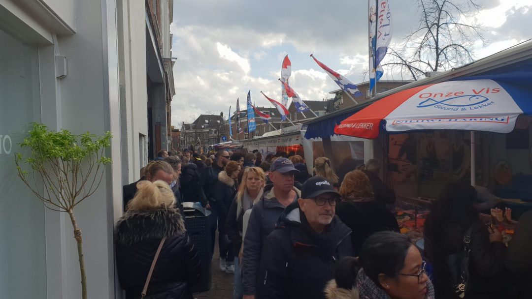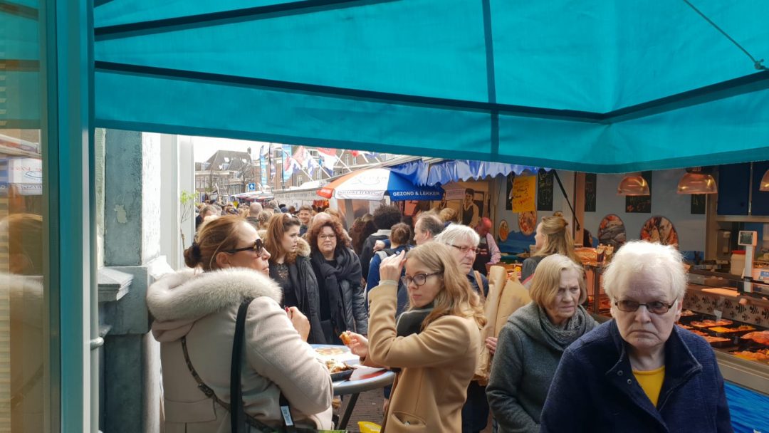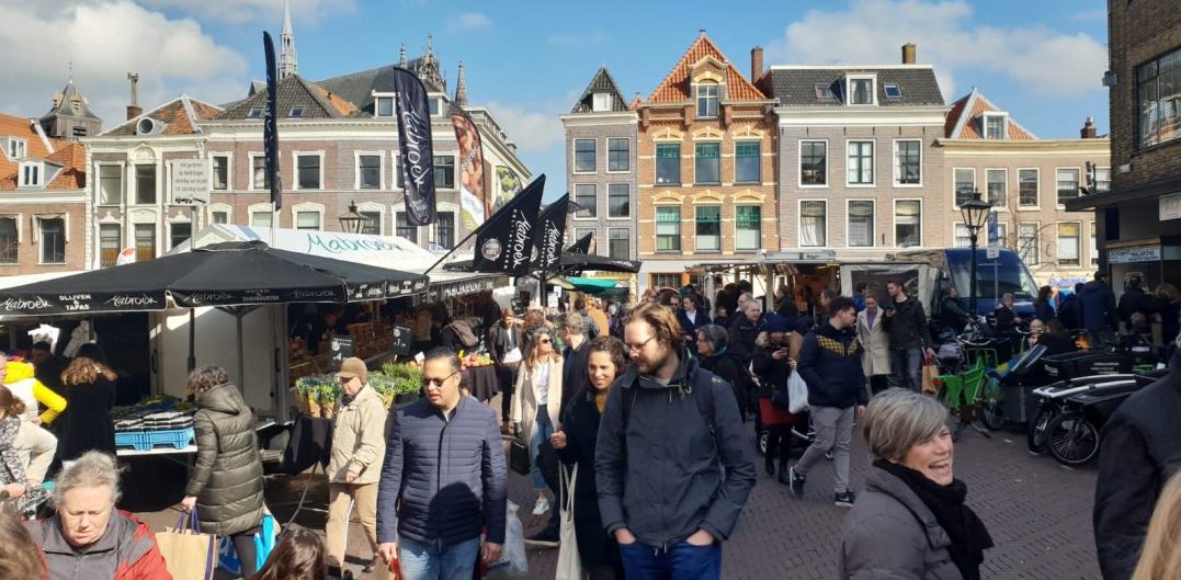 Het was zaterdagmiddag druk op de Leidse markt, die ondanks landelijke maatregelen tegen het coronavirus nog niet werd afgelast. De noodverordening van de Veiligheidsregio wordt namelijk met opzet pas vanavond van kracht, zodat eerst de tijd kon worden genomen om de effecten ervan op bijvoorbeeld markten duidelijk te krijgen. Op de straten rond de Nieuwe Rijn gebeurde daardoor echter wel precies wat het verbod op grote evenementen moet voorkomen: nauw contact tussen groepen mensen.