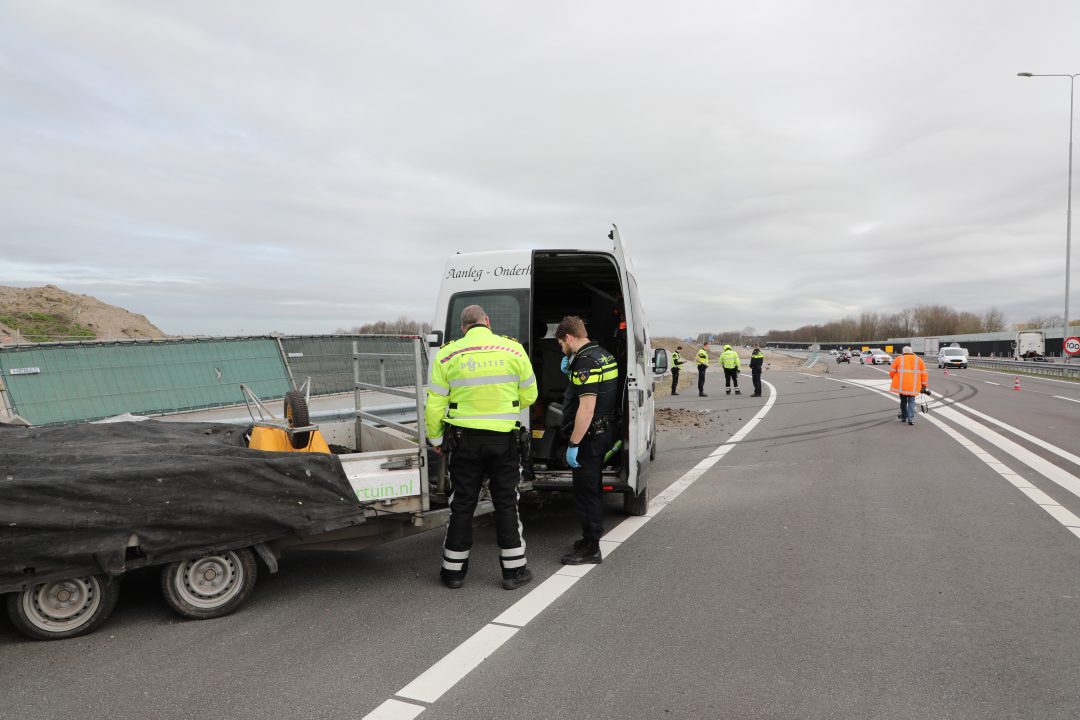 Een bedrijfsbus met aanhanger is vanochtend omstreeks 10.15 uur geschaard op de A44 bij Leiden in de richting van Wassenaar. Het busje is bij het ongeval tegen de vangrail geklapt en kwam achterstevoren tot stilstand. Op de Rijksweg zijn flinke remsporen te zien en er liggen stenen op het wegdek die uit de aanhanger vlogen.