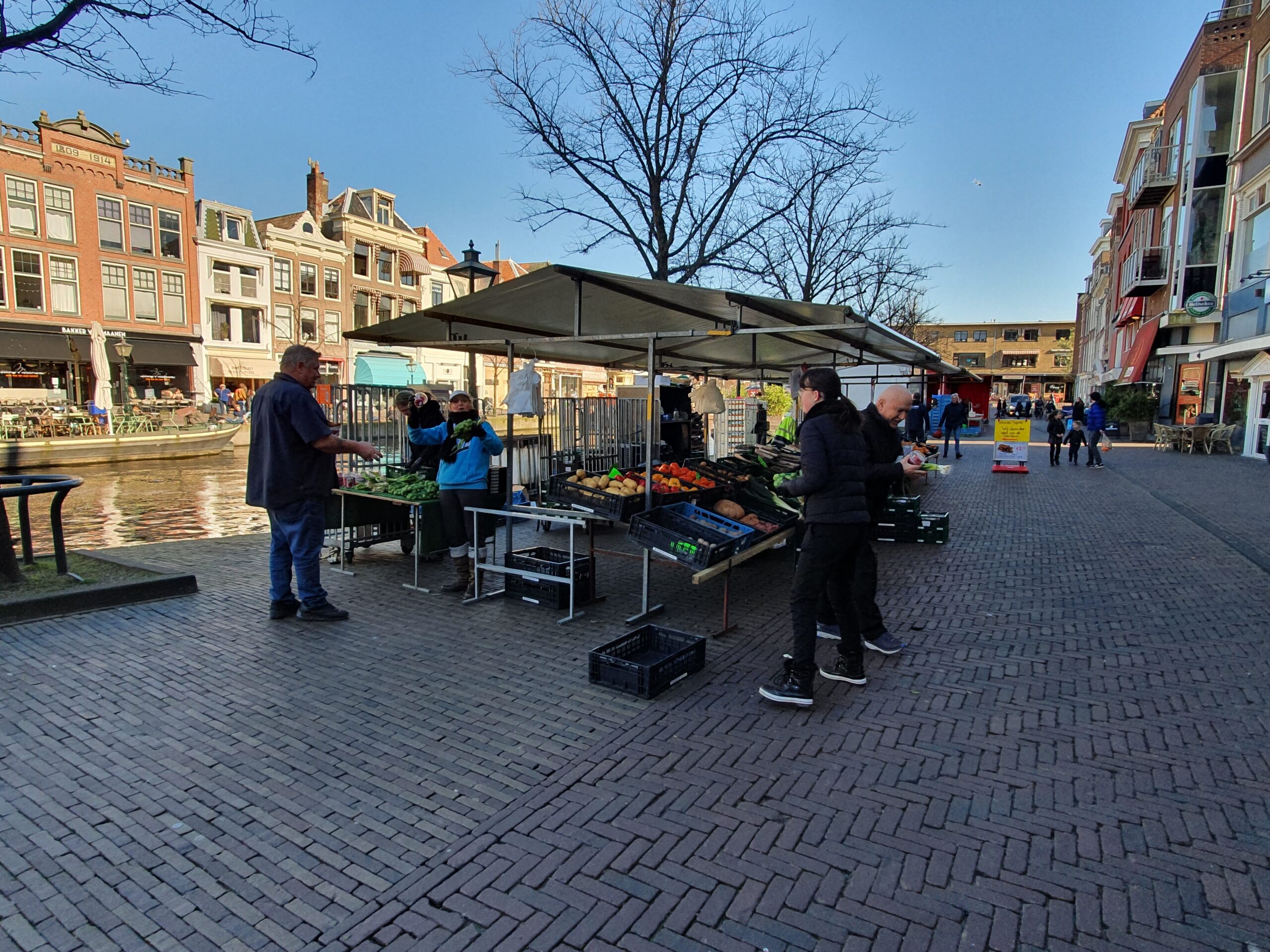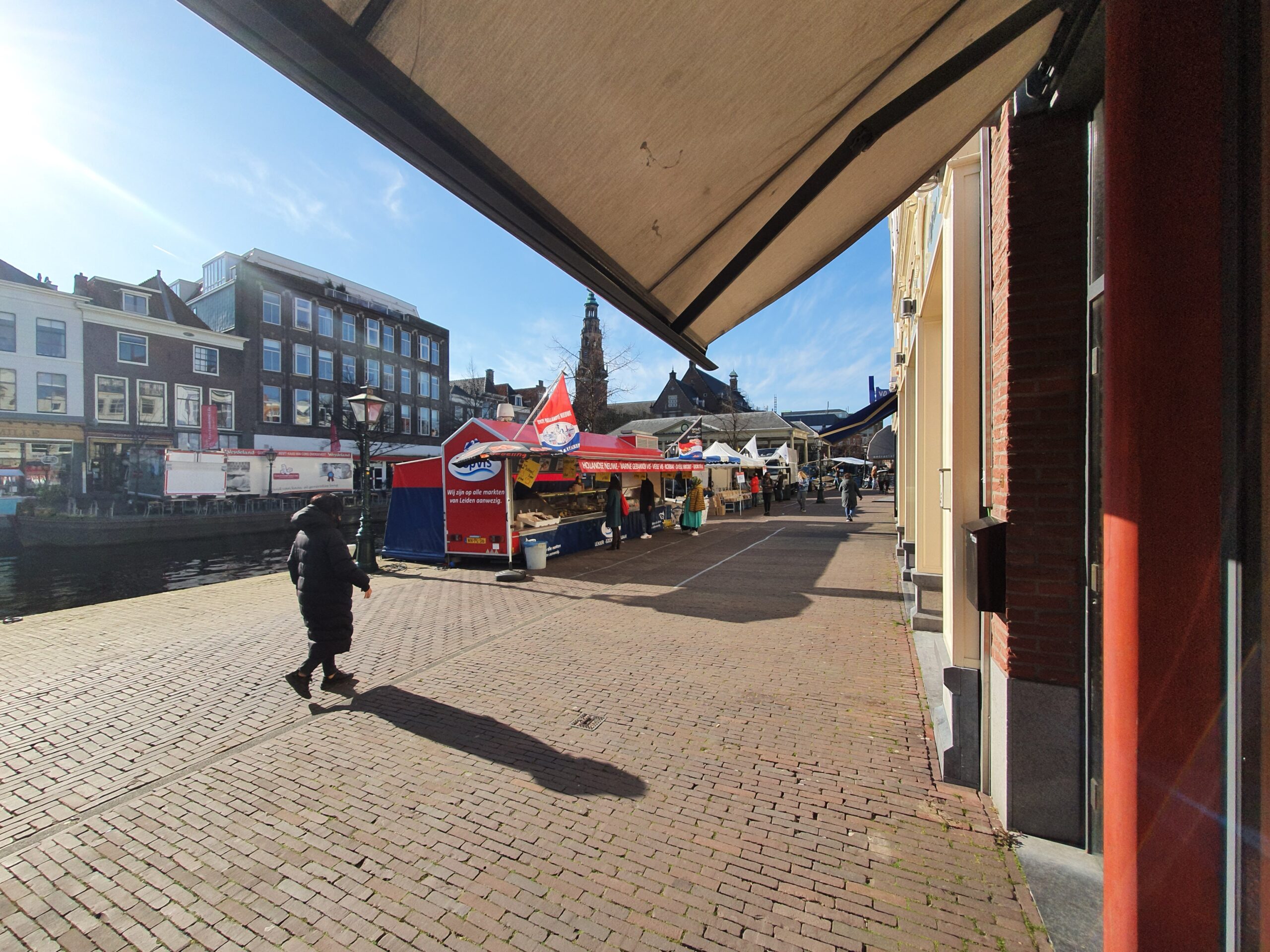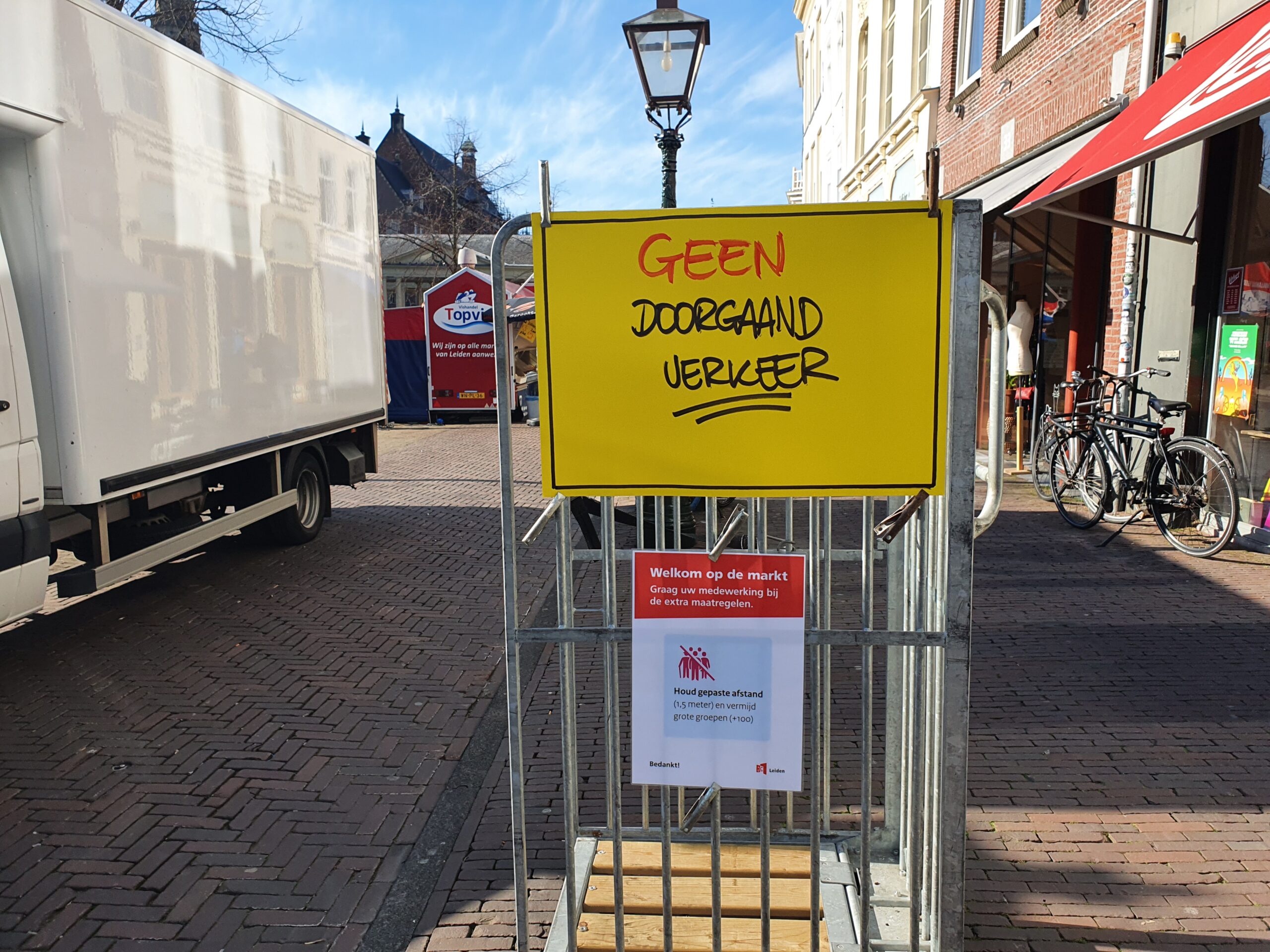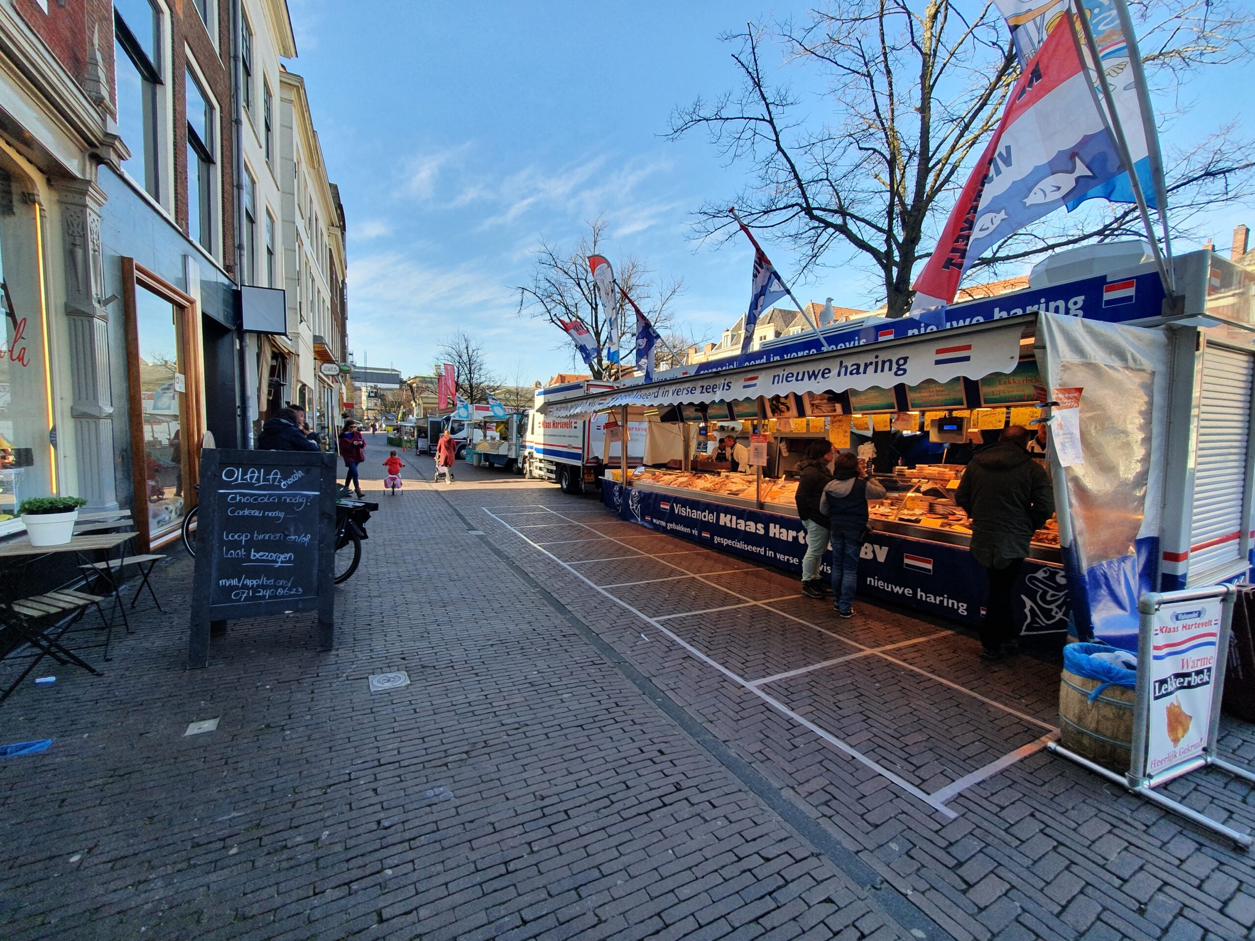 In tegenstelling tot de te drukke zaterdagmarkt, was het deze woensdag rustig op de markt in het centrum van Leiden. De kramen met levensmiddelen, non-food wordt sowieso van de markt geweerd, hebben allemaal zo hun maatregelen genomen om het publiek op afstand te houden. Waar dat duidelijk is aangegeven, houdt men zich er goed aan, op andere plekken is het door het geringe aantal bezoekers eigenlijk overbodig.