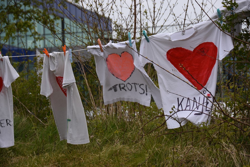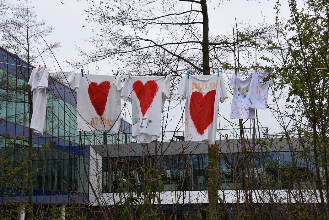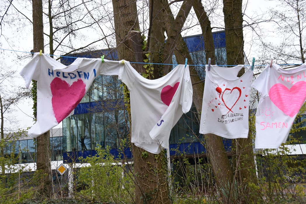Buurtbewoners hebben witte t-shirts met een rood hart opgehangen rond het Alrijne ziekenhuis in Leiderdorp. Daarmee willen ze de medewerkers van het ziekenhuis een hart onder de riem steken in deze coronatijd.