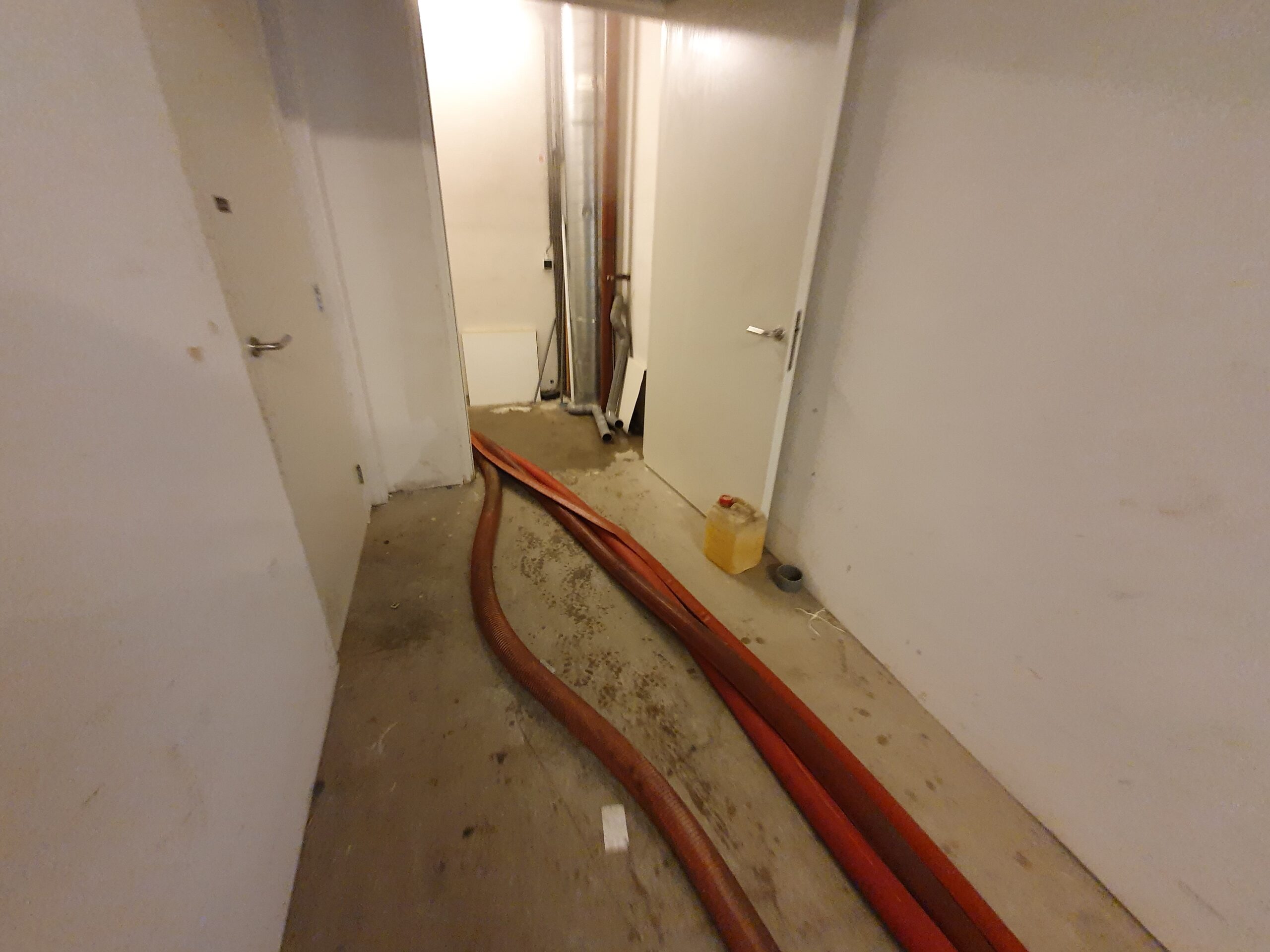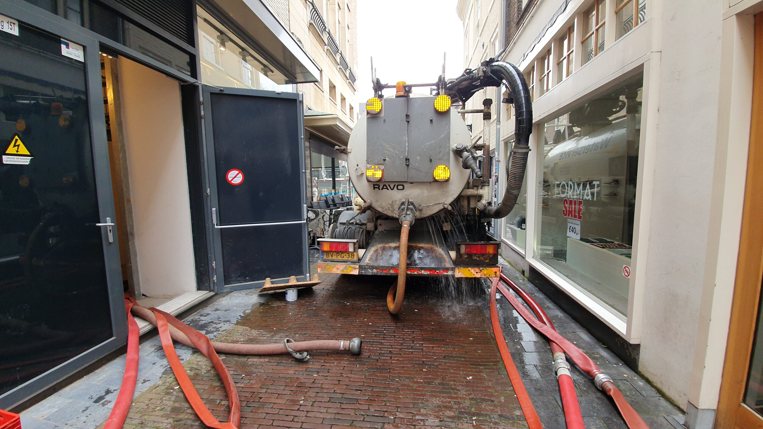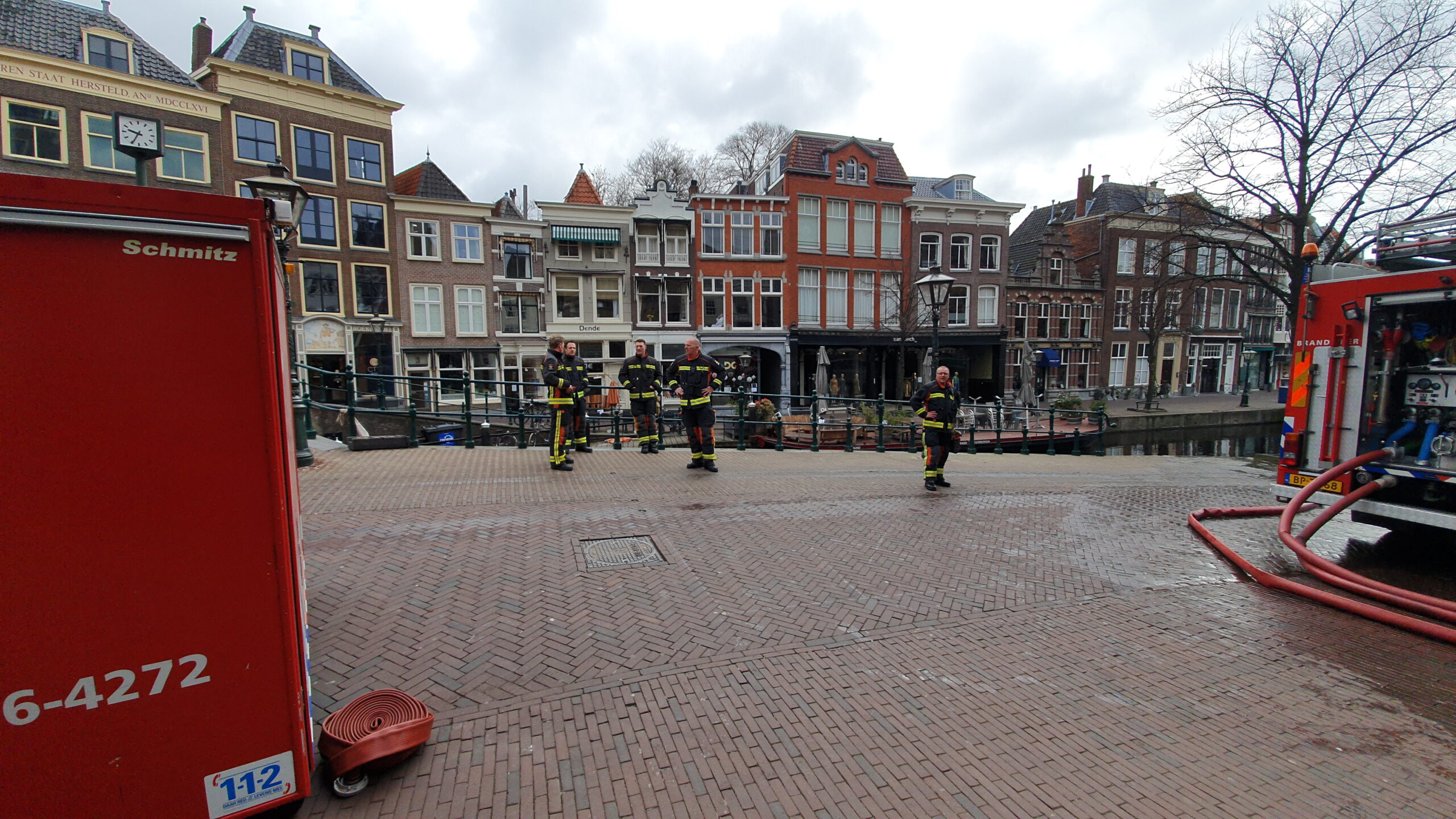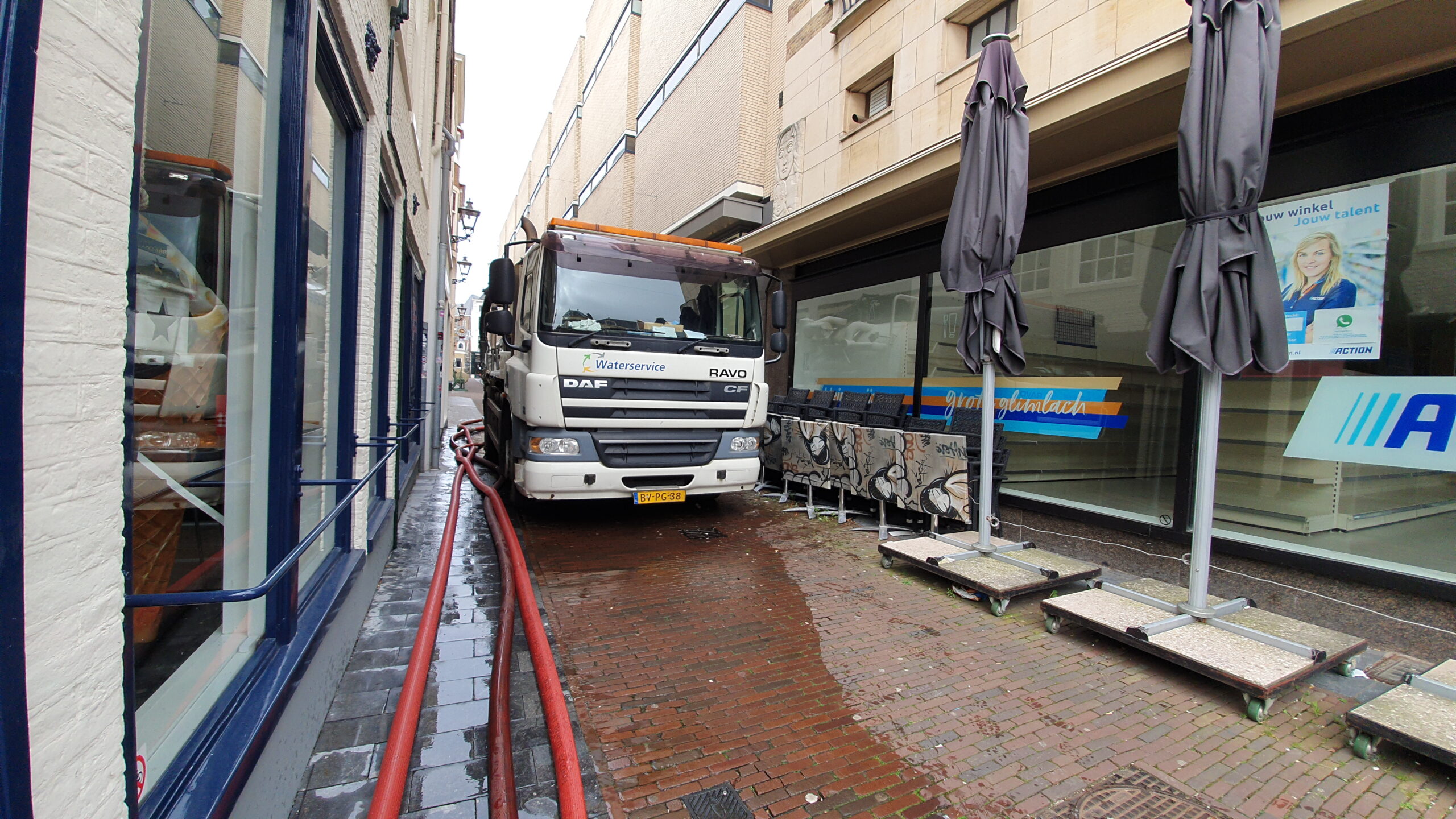 De waterzuiger staat in de Maarsmansteeg waar de brandweer via een zijdeur van het pand een hele bos slangen in de kelder heeft gehangen. De pompwagen kan zo’n zevenduizend liter water kwijt en is al drie keer geleegd in de Nieuwe Rijn. Na een half uurtje pompen verzucht een brandweerman dat het water een halve meter is gezakt. Nog zo’n 40.000 liter te gaan, leert een snelle rekensom. In de kelder is het bloedheet.