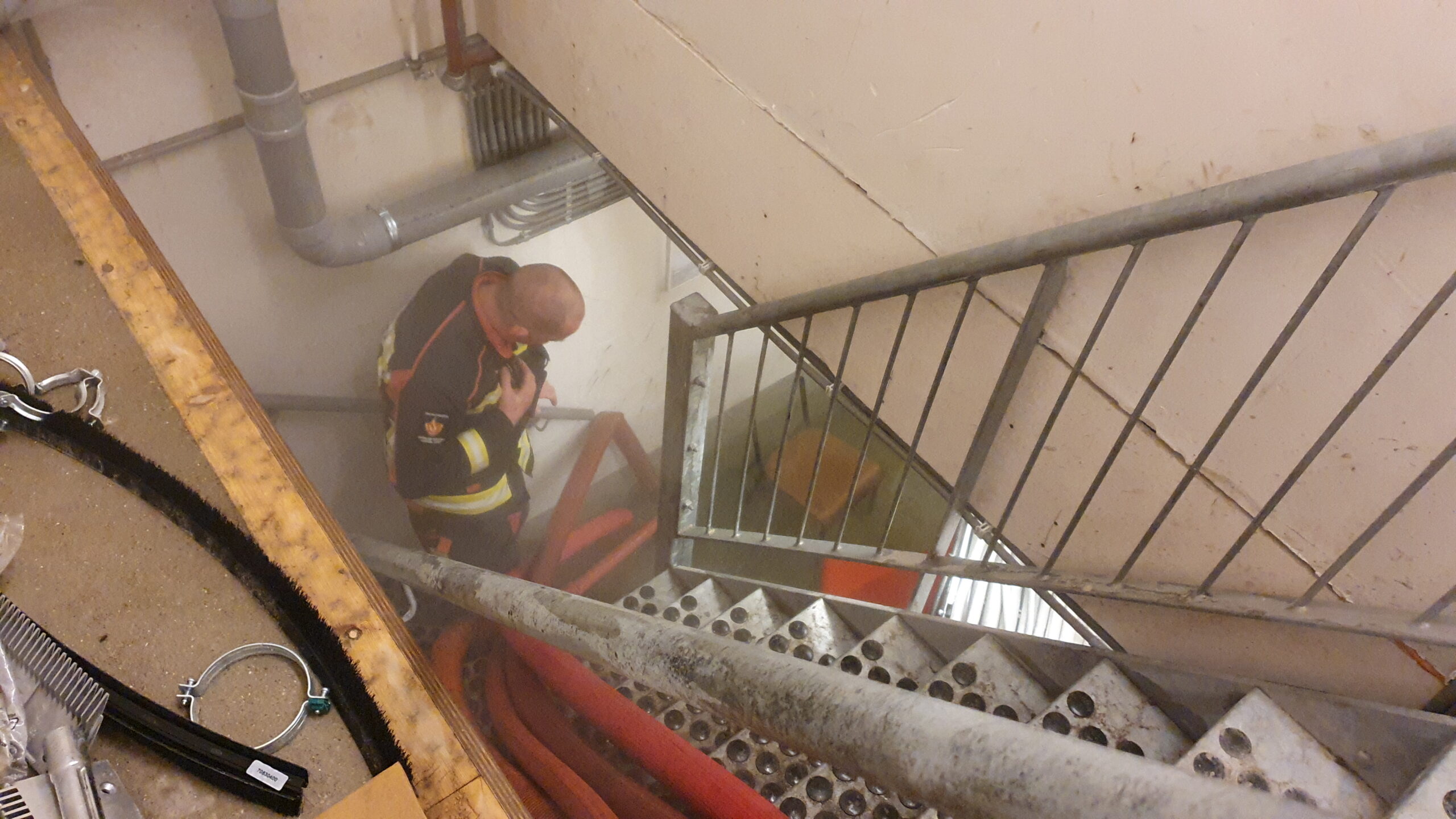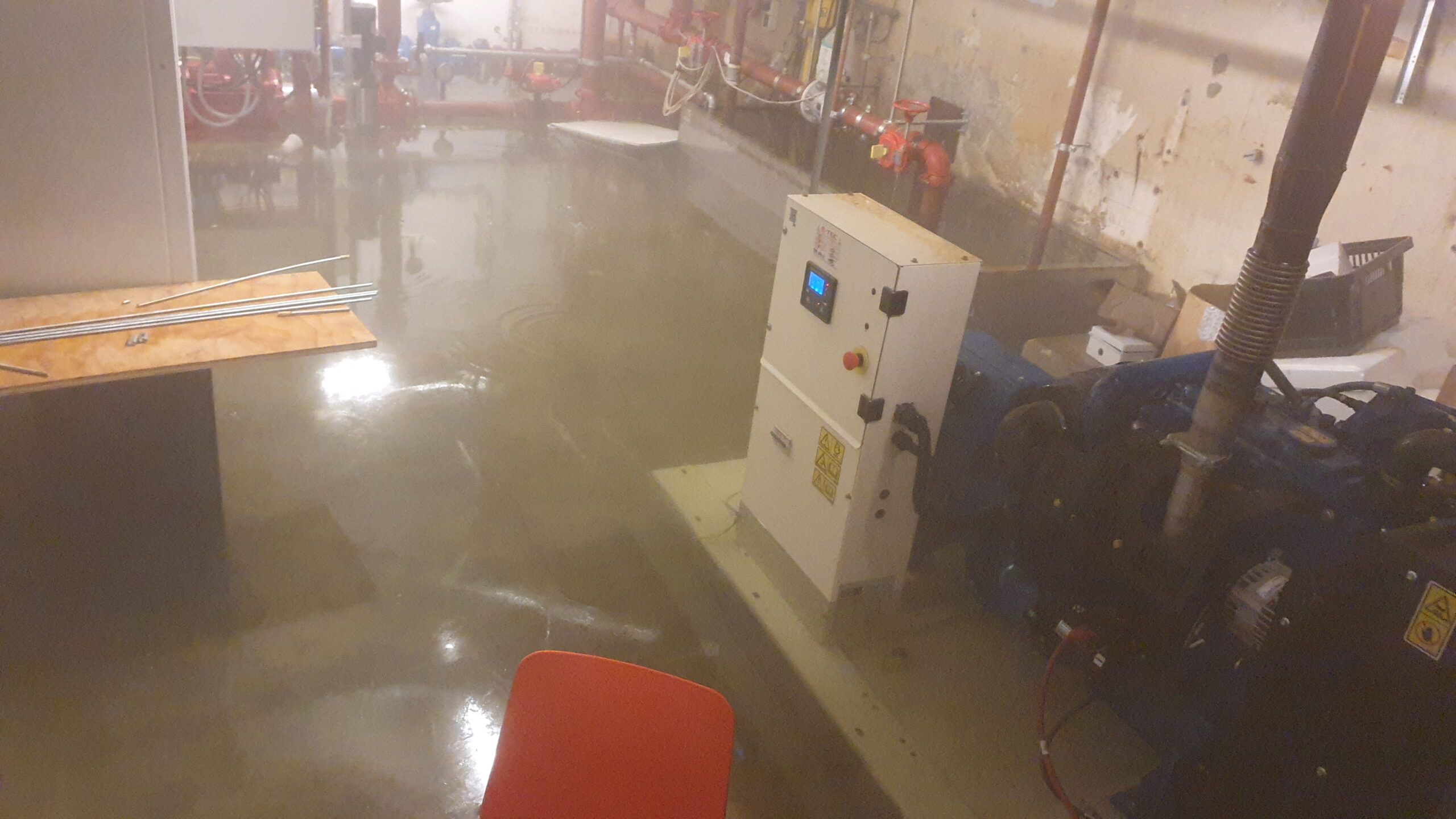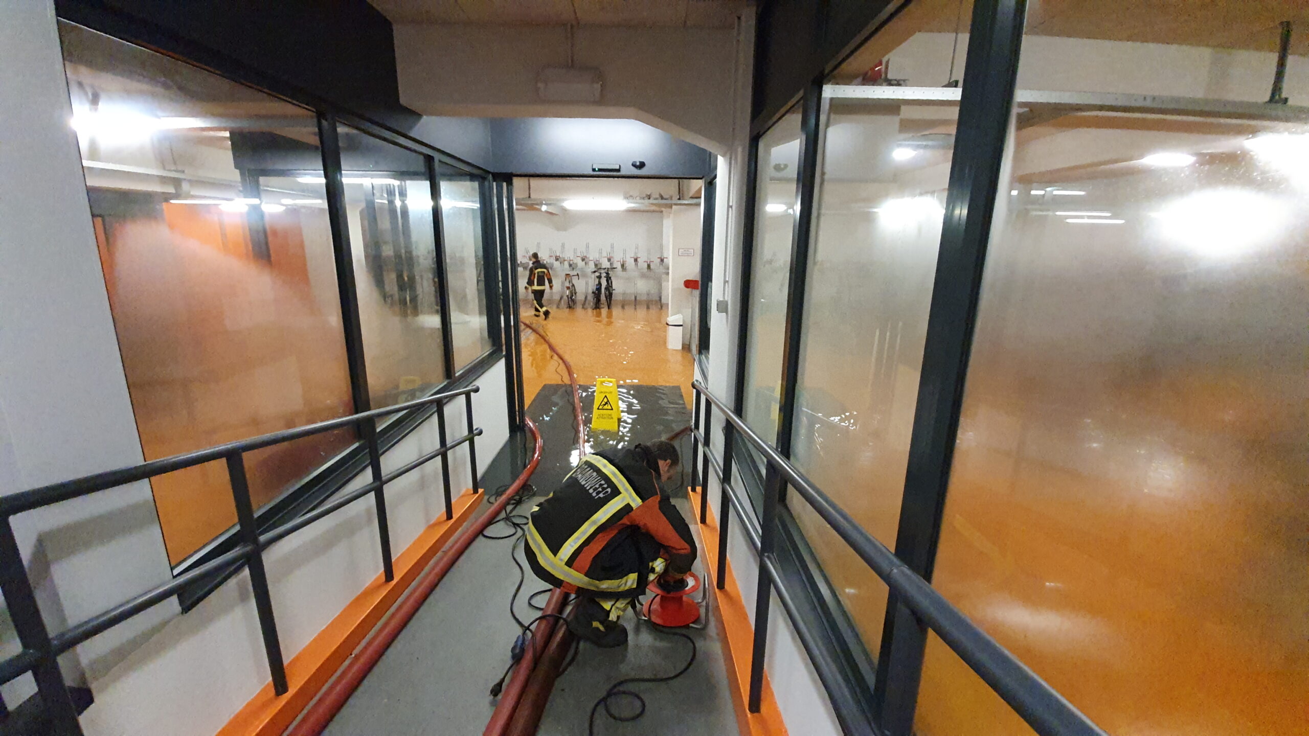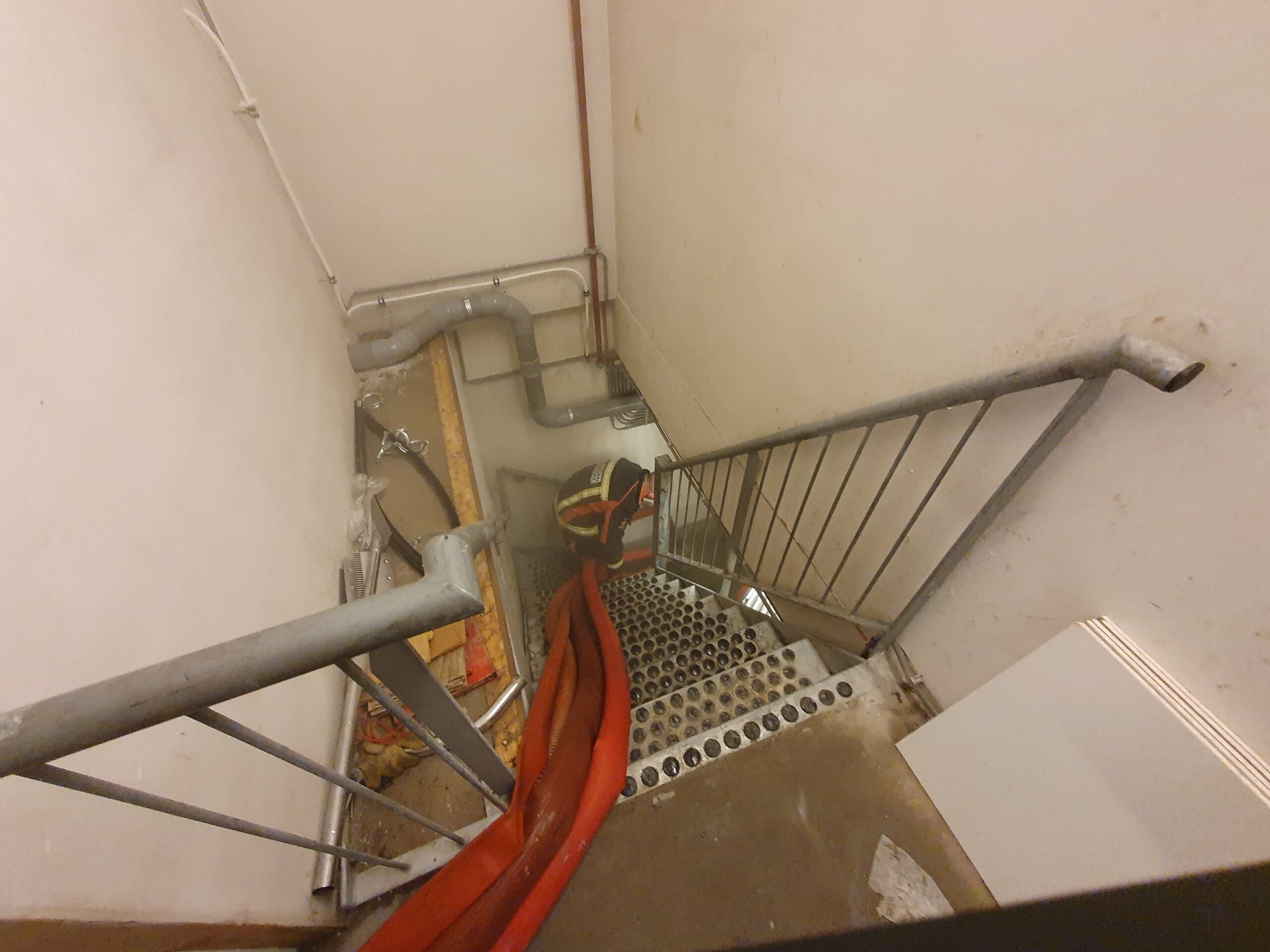 De waterzuiger staat in de Maarsmansteeg waar de brandweer via een zijdeur van het pand een hele bos slangen in de kelder heeft gehangen. De pompwagen kan zo’n zevenduizend liter water kwijt en is al drie keer geleegd in de Nieuwe Rijn. Na een half uurtje pompen verzucht een brandweerman dat het water een halve meter is gezakt. Nog zo’n 40.000 liter te gaan, leert een snelle rekensom. In de kelder is het bloedheet.