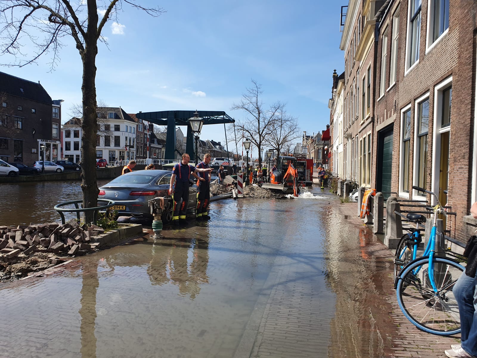 Op de Oude Singel in Leiden is bij graafwerkzaamheden een waterleiding geraakt.