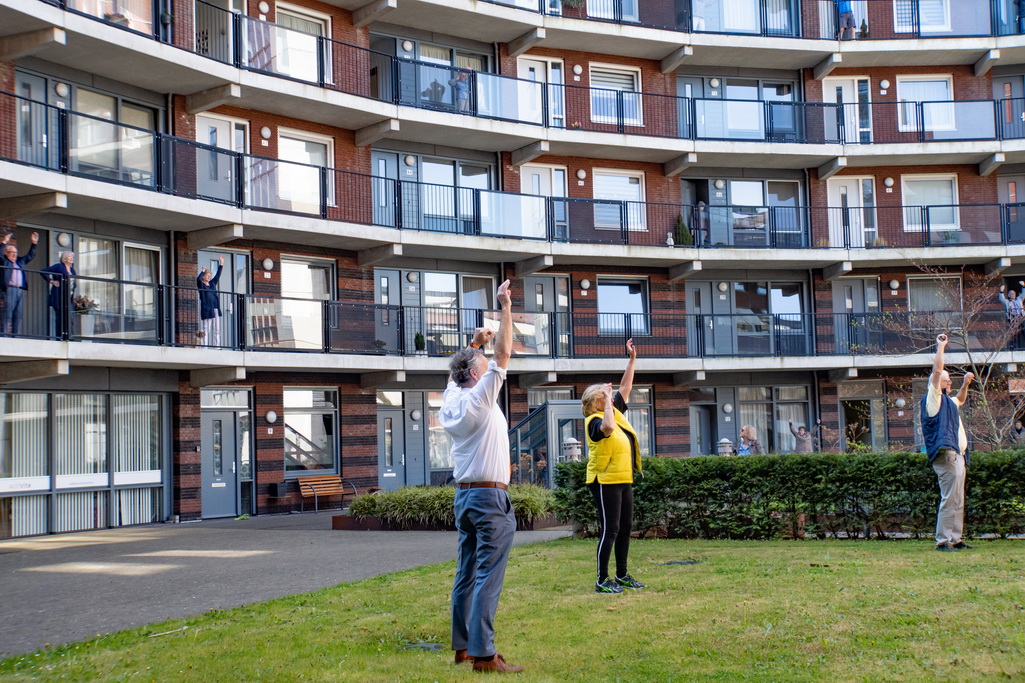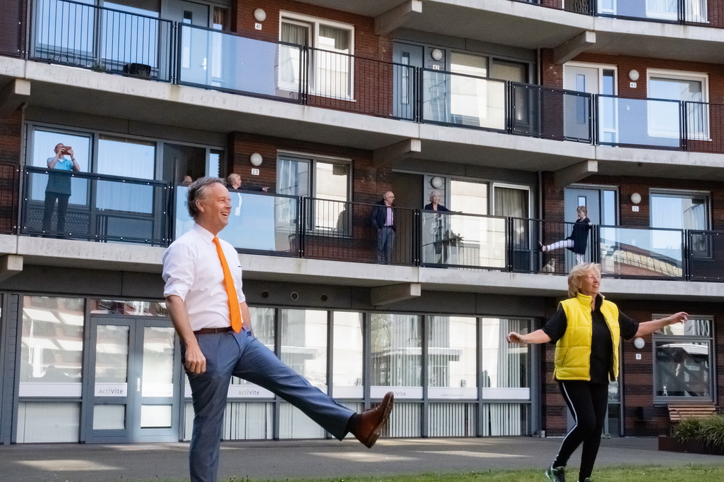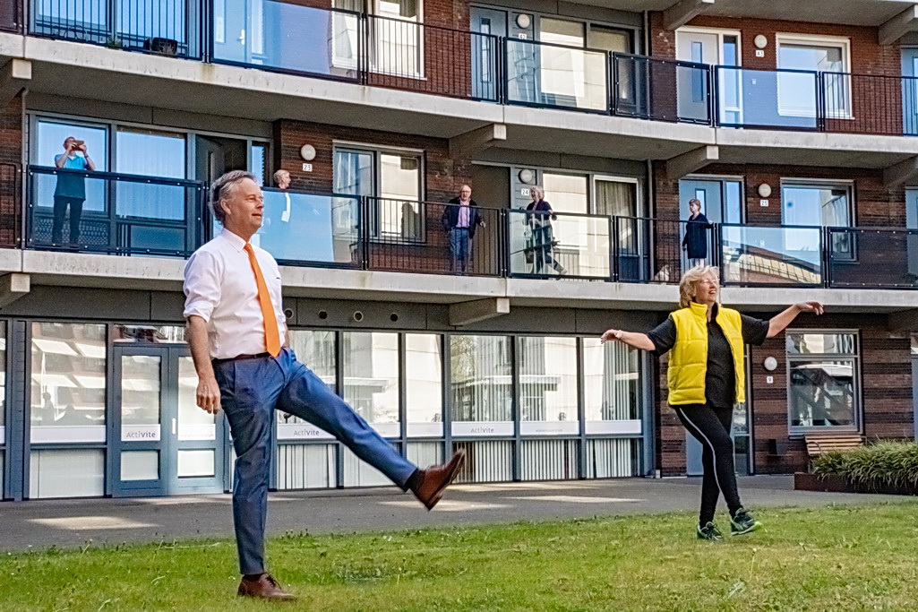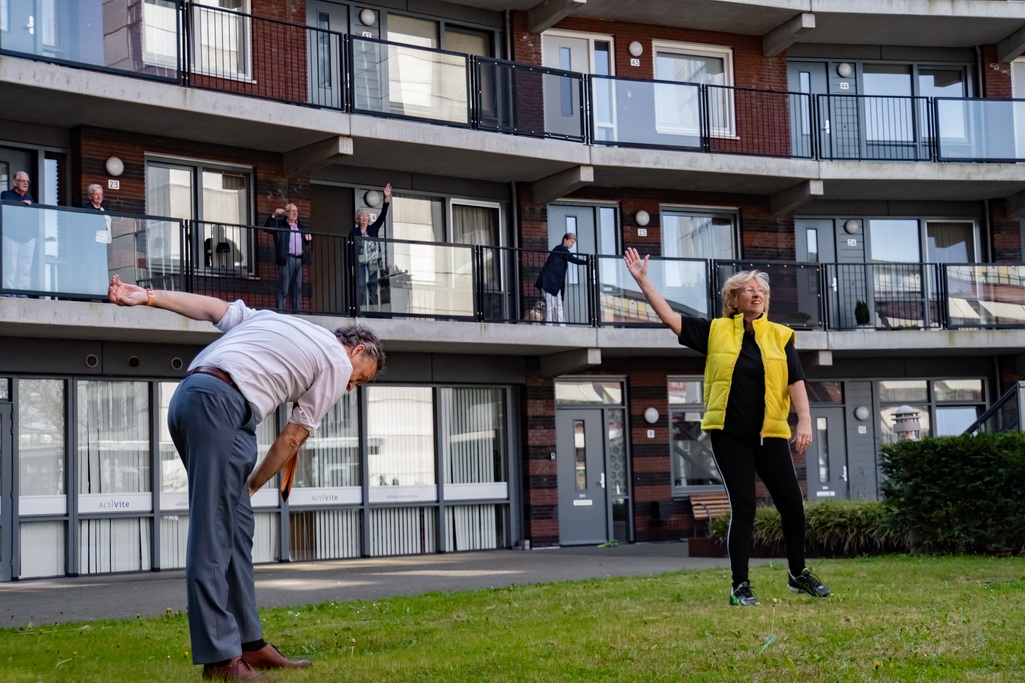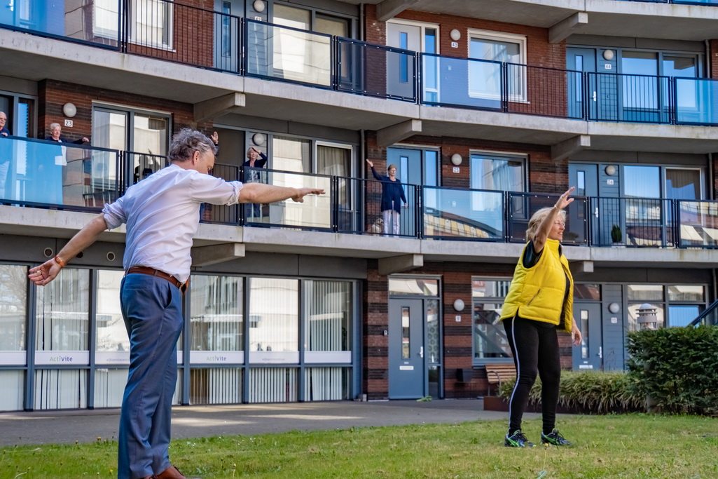 De Leiderdorpse burgemeester Laila Driessen deed vrijdagochtend mee met het gymnastiekuurtje voor de bewoners van woonzorgcentrum De Ommedijk. Het zogenaamde ‘BalkonBewegen’ is in het leven geroepen door Clubhuis De Derde Helft, nu de senioren niet meer elke woensdag en donderdag naar Alecto en RCL kunnen om met elkaar te bewegen. Ook sportwethouder Willem Joosten was van de partij.