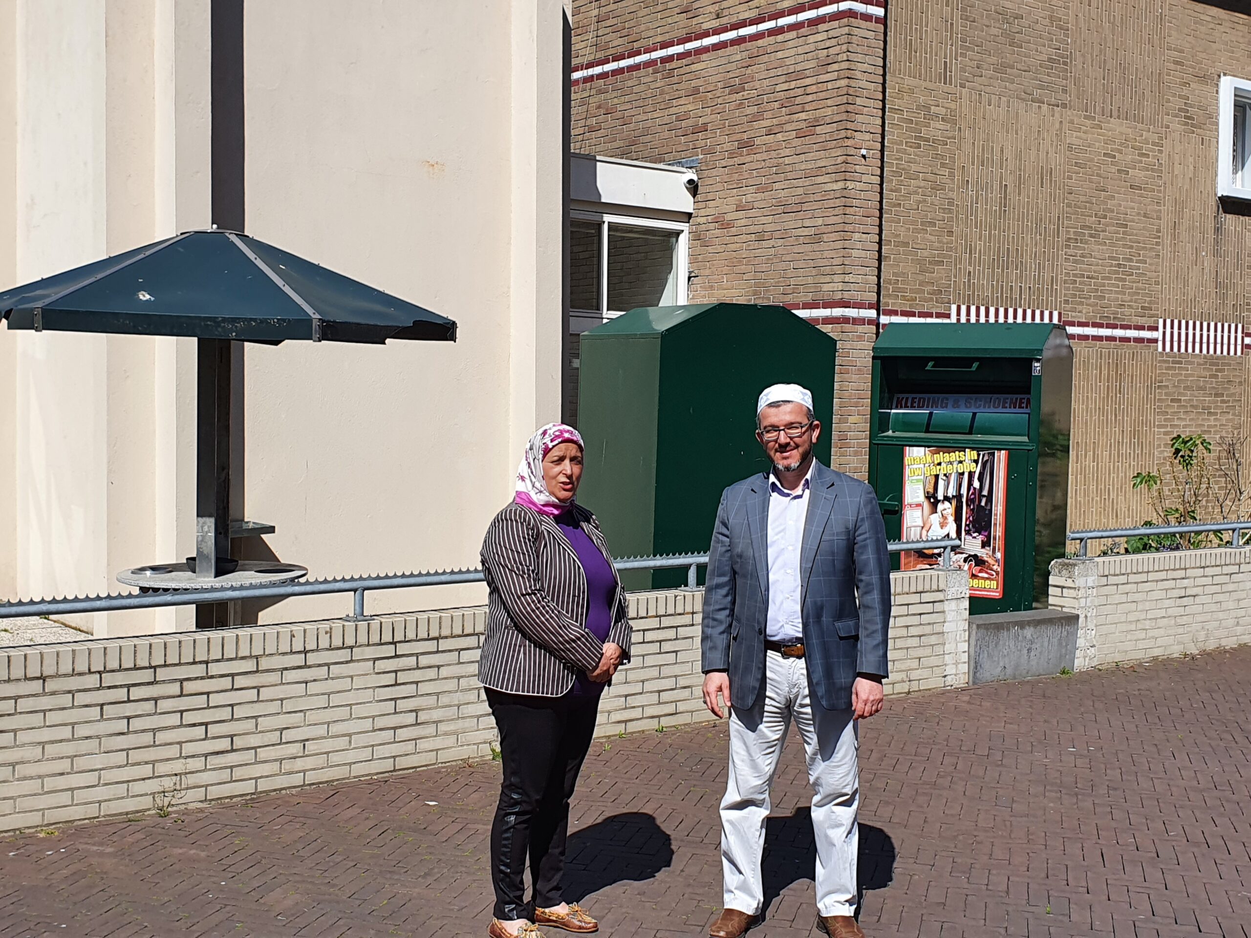 Chris de Waard in gesprek met Emine Guney van de Turkse Mimar Sinan Moskee aan het Kooiplein.