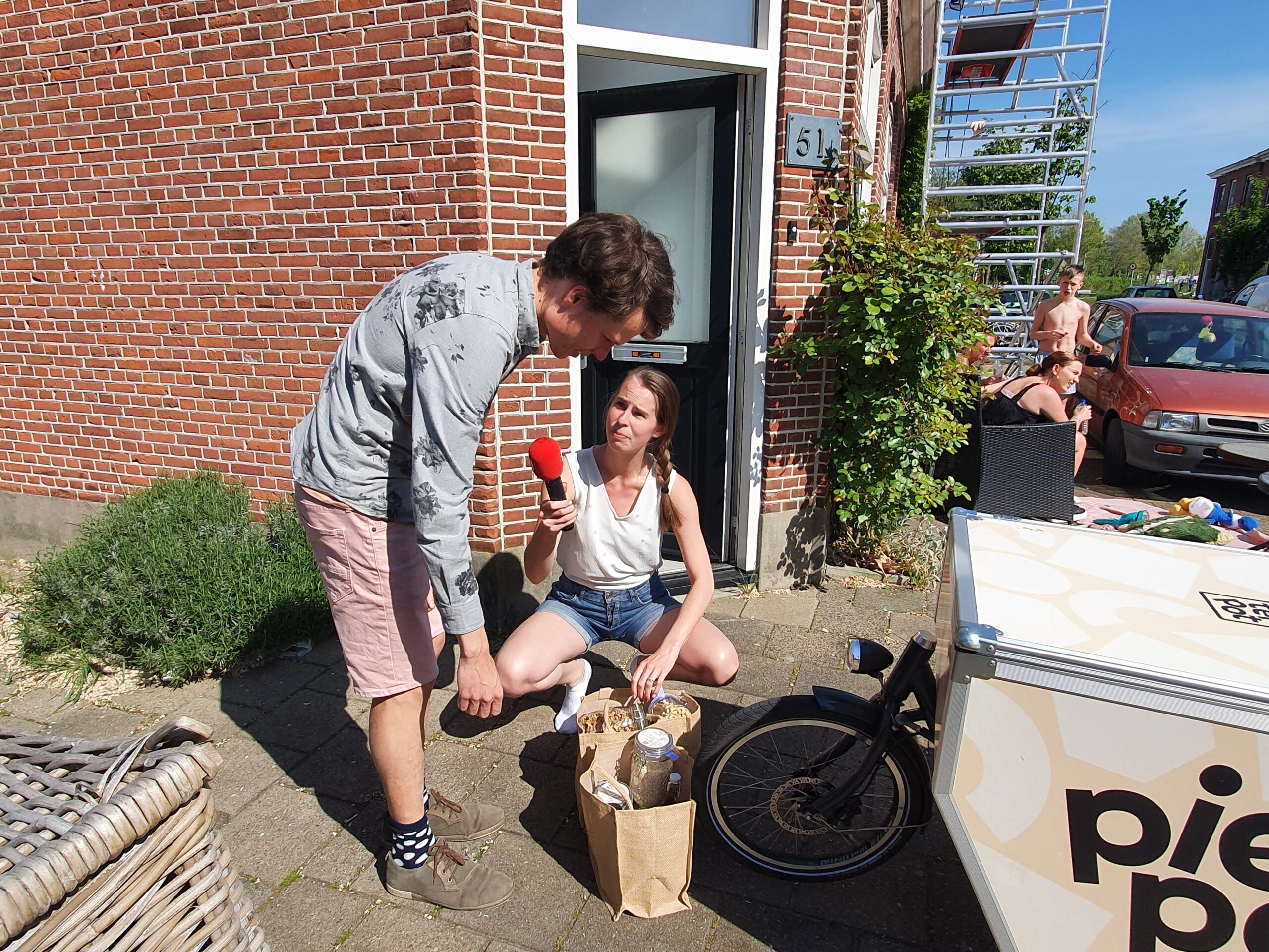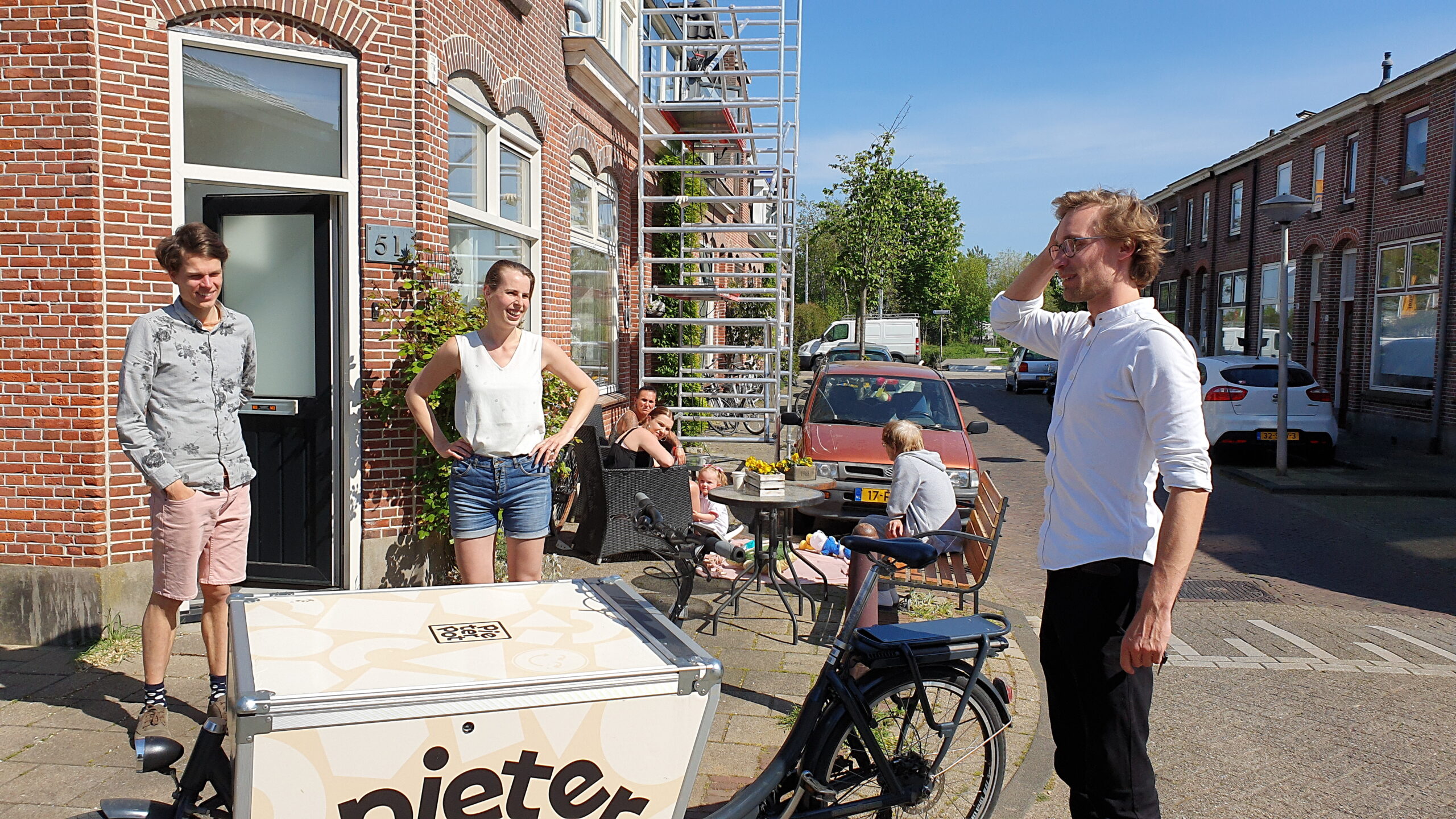 Chris de Waard in gesprek met mede-oprichter Jouri Schoemaker van Pieter Pot en twee van de eerste Leidse klanten, Vivianne Heikoop en Bram Valk.