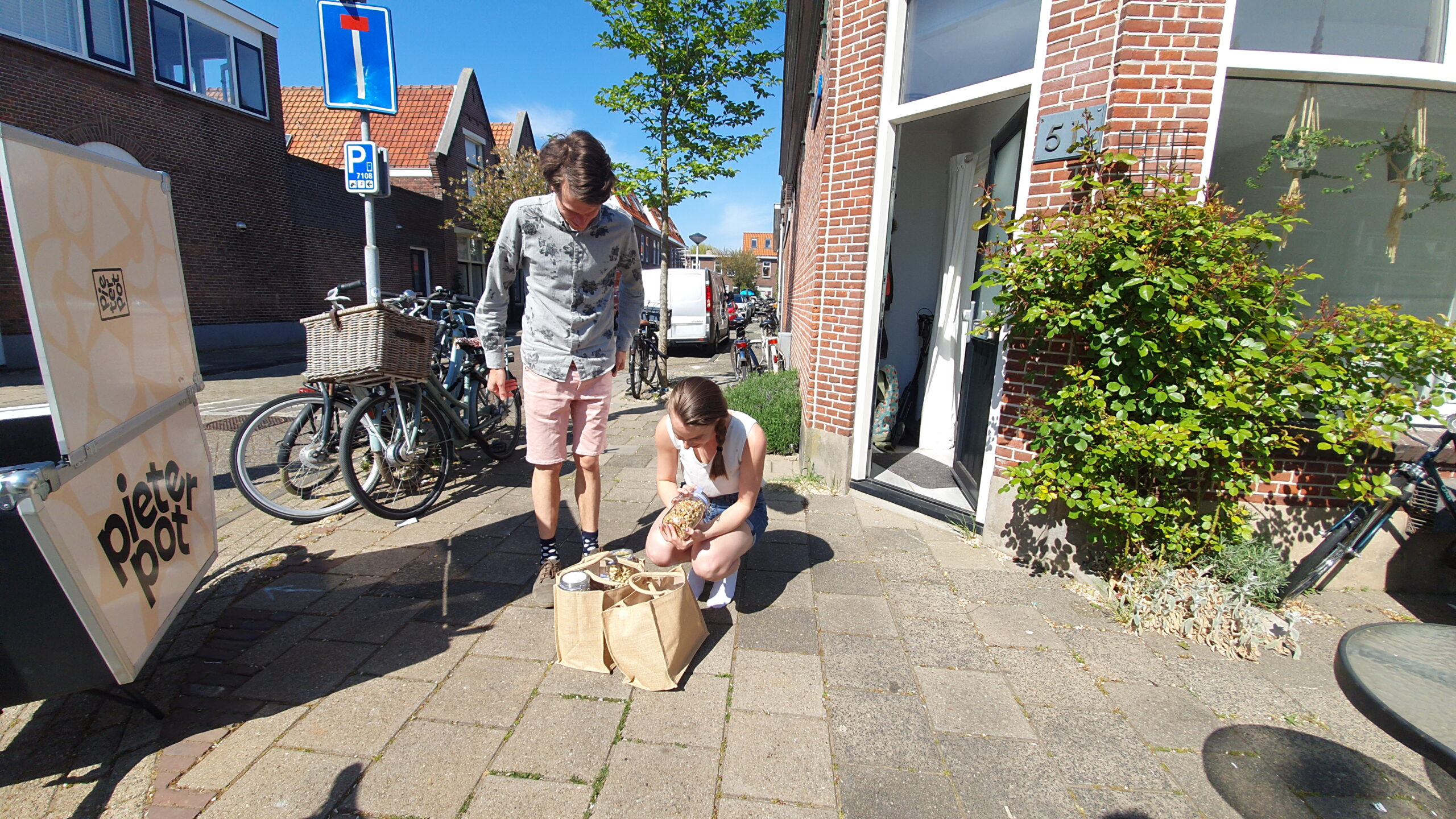 Het assortiment bestaat uit levensmiddelen die de gemiddelde consument in de voorraadkast heeft staan. Noten, pasta, maar ook olijfolie en zelfs pindakaas. “We hadden eerst ook Nutella. Dat stonden we dan zelf over te scheppen in onze eigen potten”, lacht Schoemaker terwijl hij in de Waardstraat net zijn eerste klant van een verrassingspakket heeft voorzien. “Dat ging teveel tijd kosten, maar we zijn inmiddels in gesprek met verschillende merken en producenten zoals Unilever om merkproducten te kunnen leveren in onze eigen ‘Pieter Potten’. Die moeten dan ook in supermarkten in het schap verschijnen.”