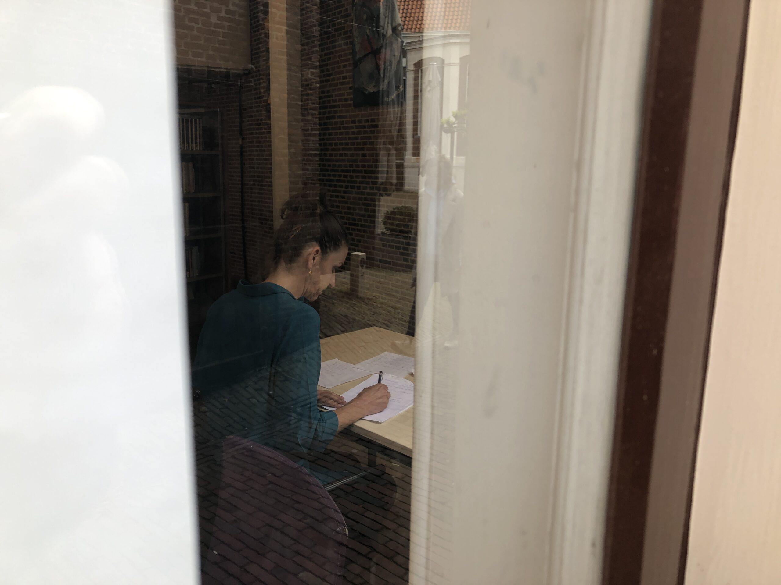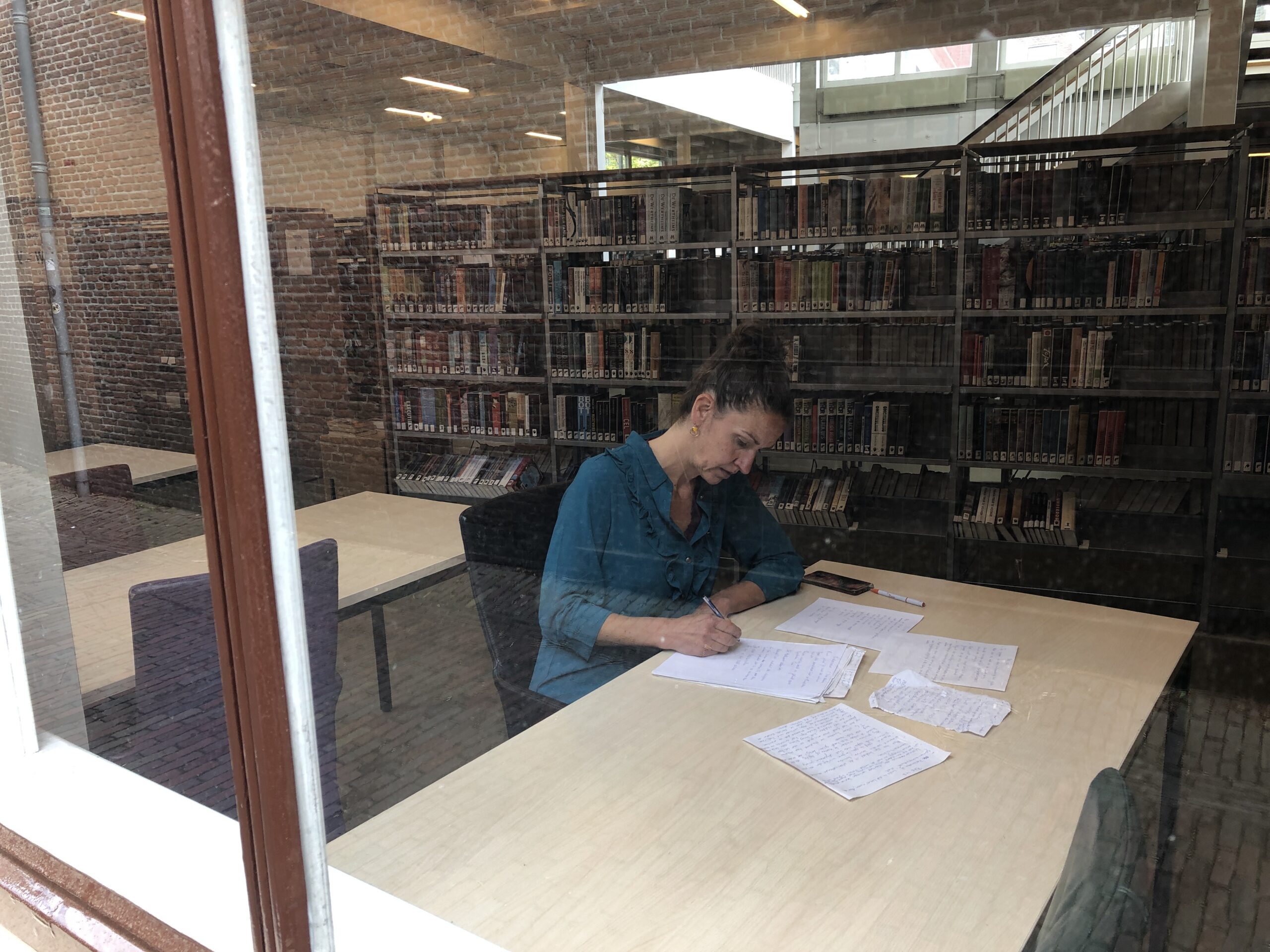 Ondanks haar eenzame opsluiting heeft van Velzen zich geen moment verveeld. “De tijd vloog om, ik had nog wel uren willen blijven”, zei ze na afloop. De raamgedichten blijven de komende weken staan op de ruiten van de bibliotheek.