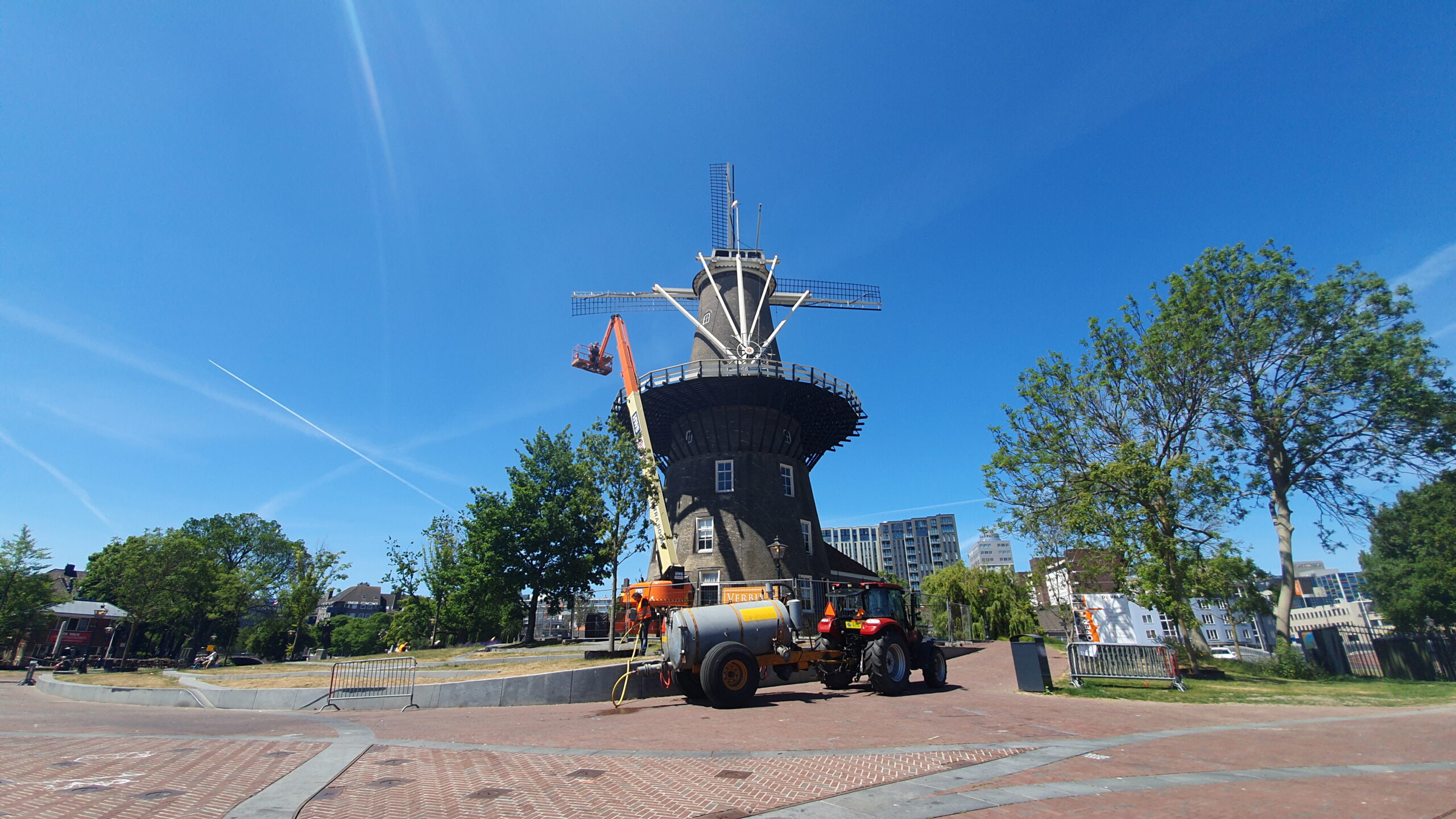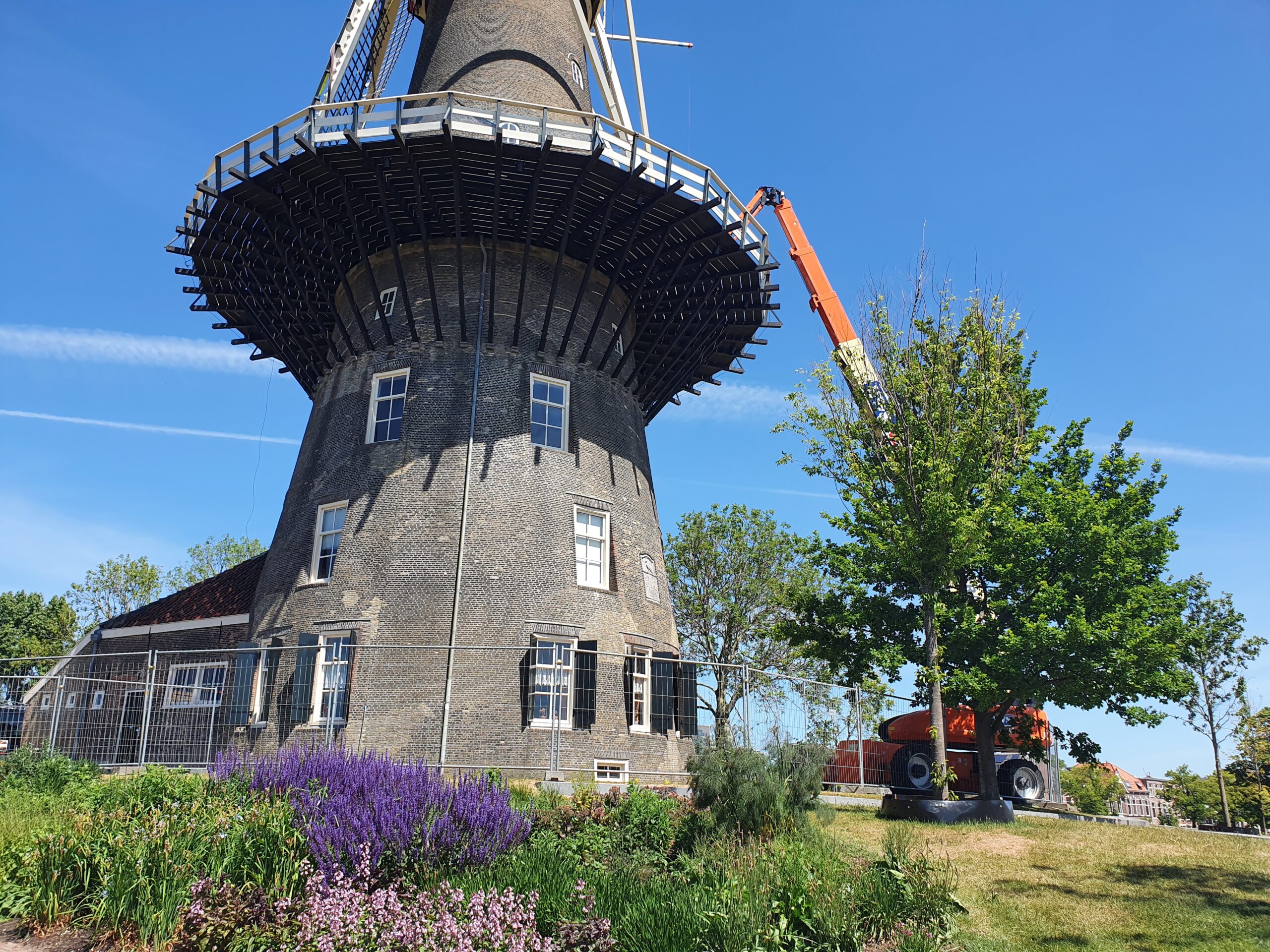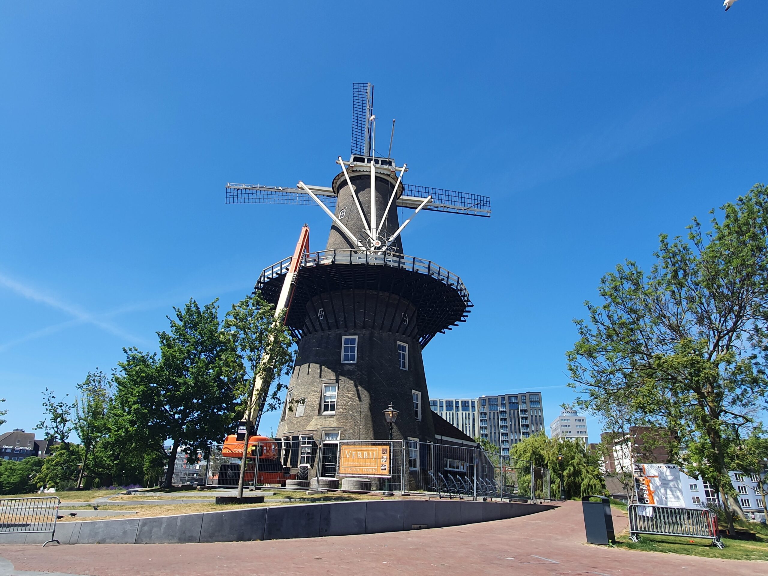 Van de periode dat de molen was gesloten in verband met de coronacrisis is gebruik gemaakt om onderhoudswerkzaamheden uit te voeren. Zo zijn enkele schoren vervangen. dat zijn de grote schuine balken die de constructie ondersteunen waarmee de kap en de wieken in de wind gedraaid kunnen worden.