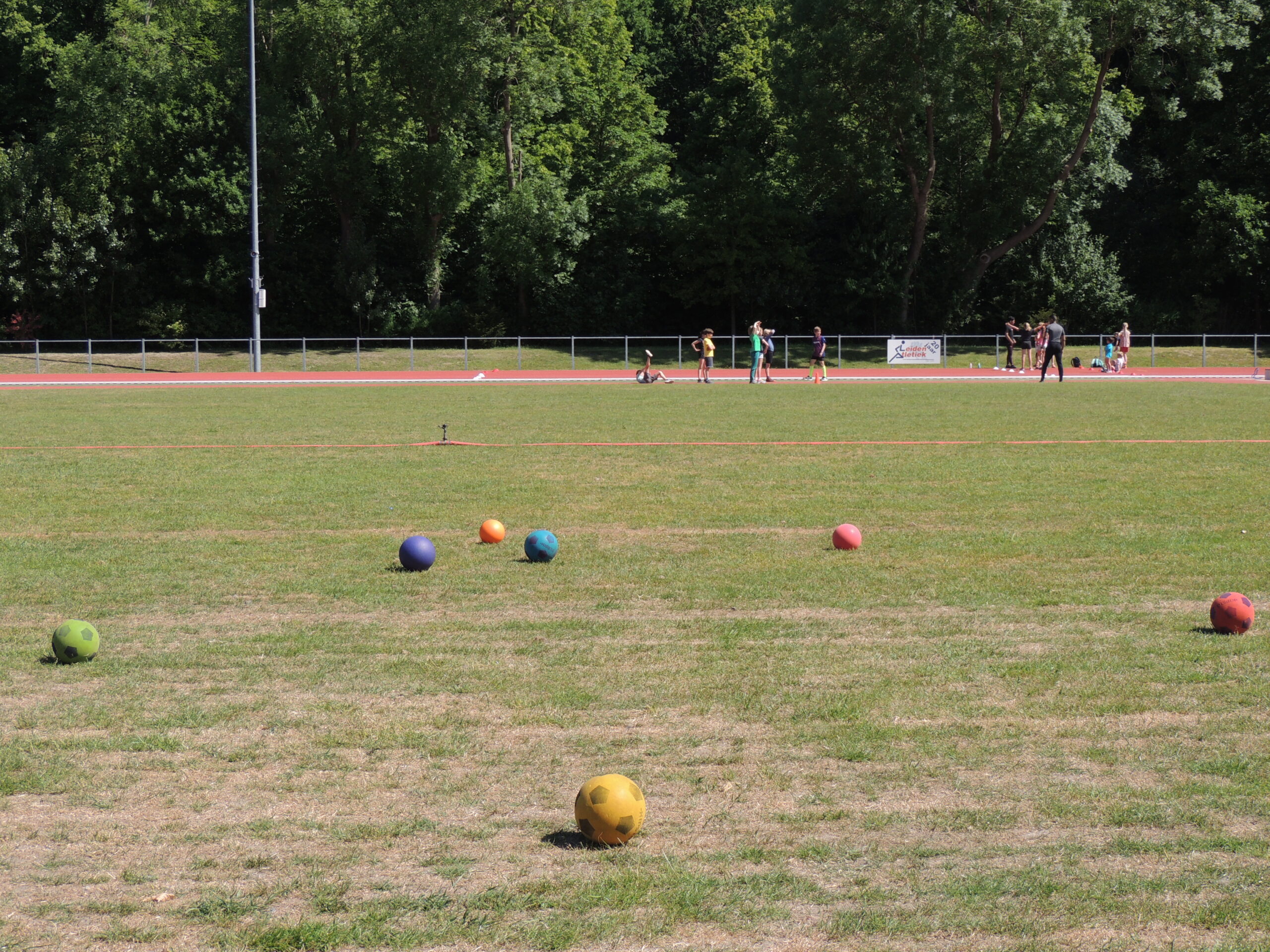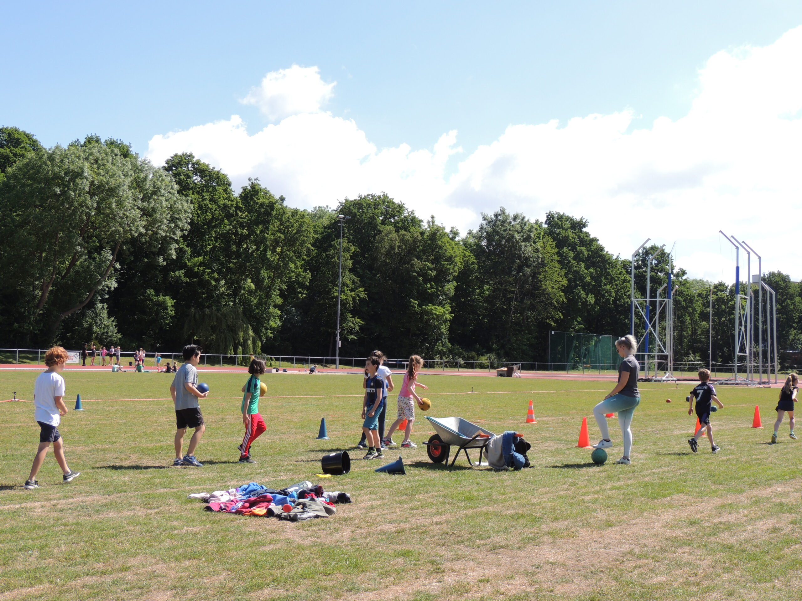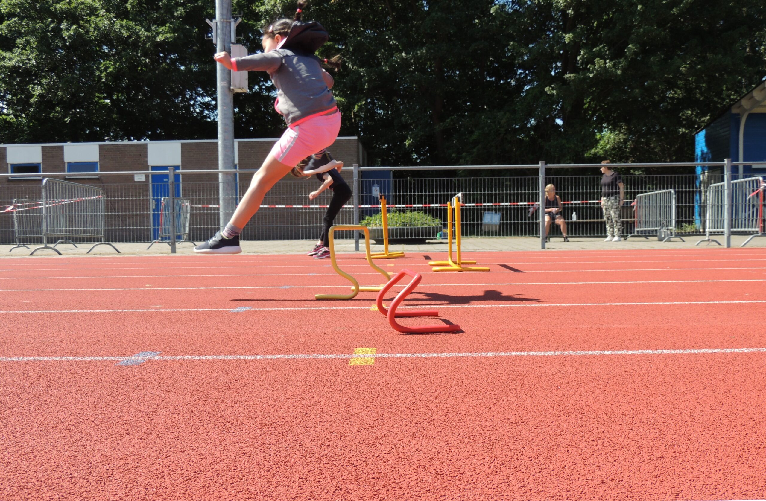 Op het complex van Leiden Atletiek is ruimte genoeg om een paar klassen kennis te laten maken met atletiekonderdelen. Er wordt gegooid met ballen, over lage hekjes gesprongen en geoefend met starten. Puur plezier in bewegen staat voorop. Voor zowel de kinderen als de stagiairs van het mboRijnland die de kinderen helpen.
