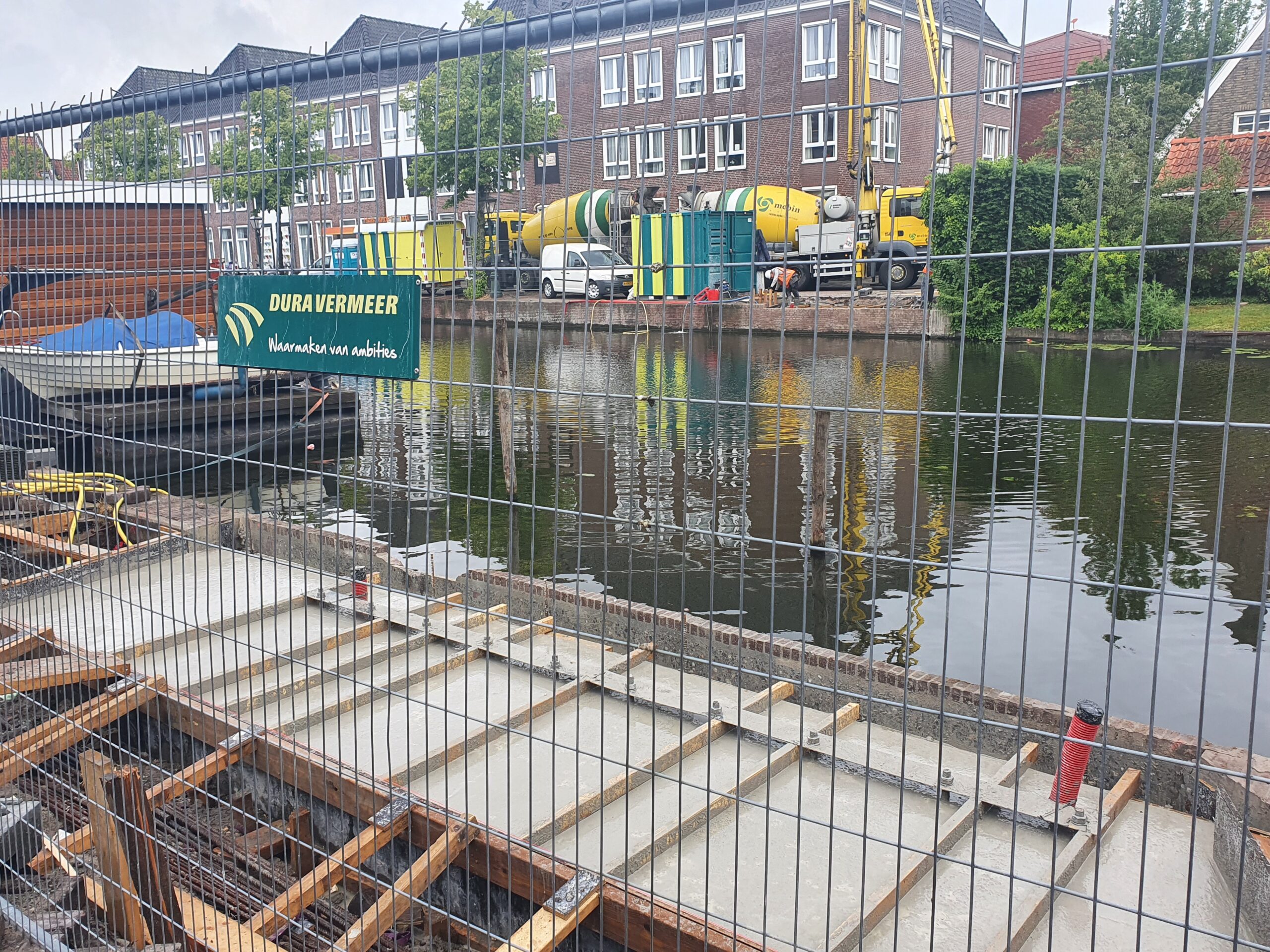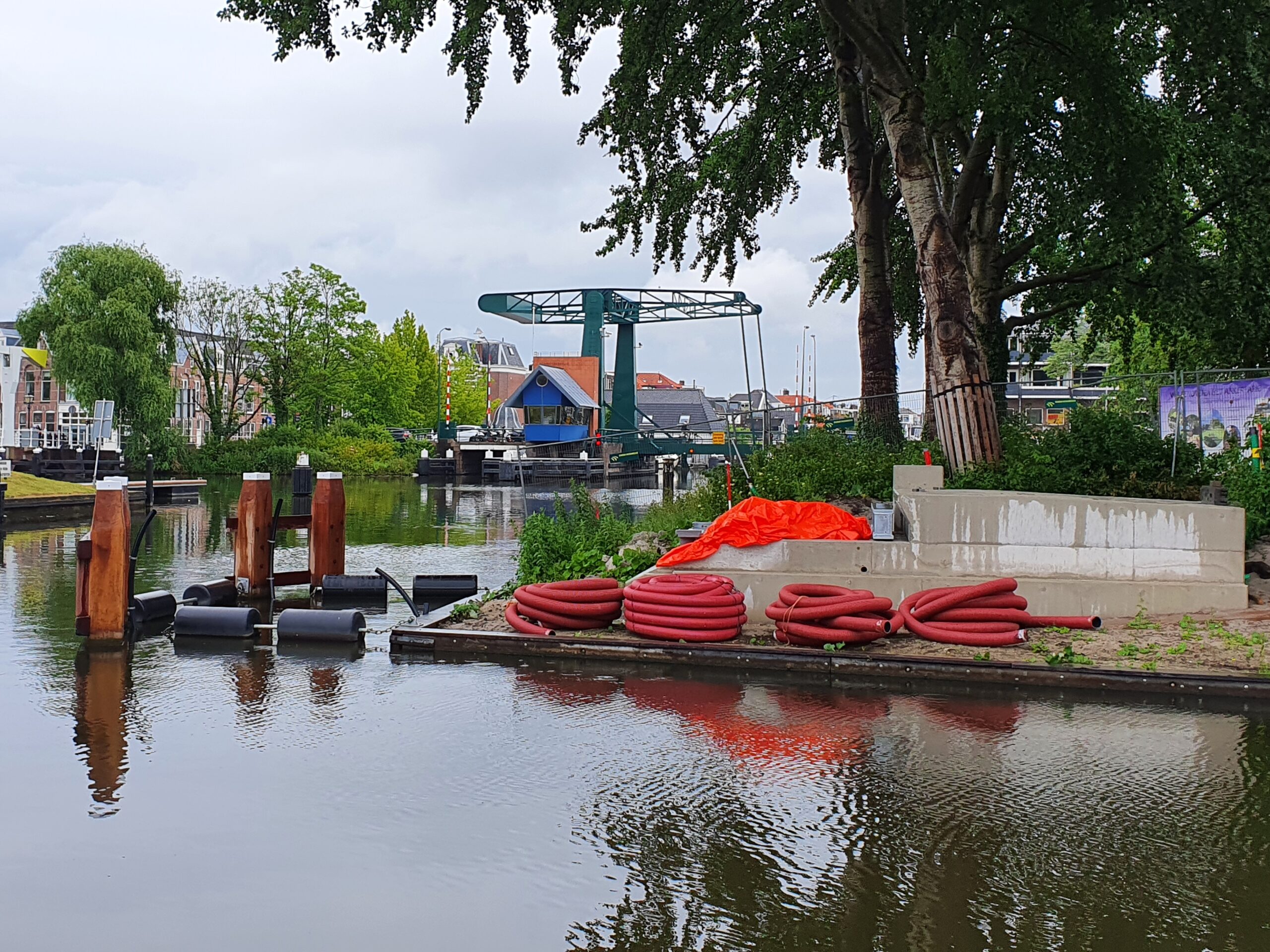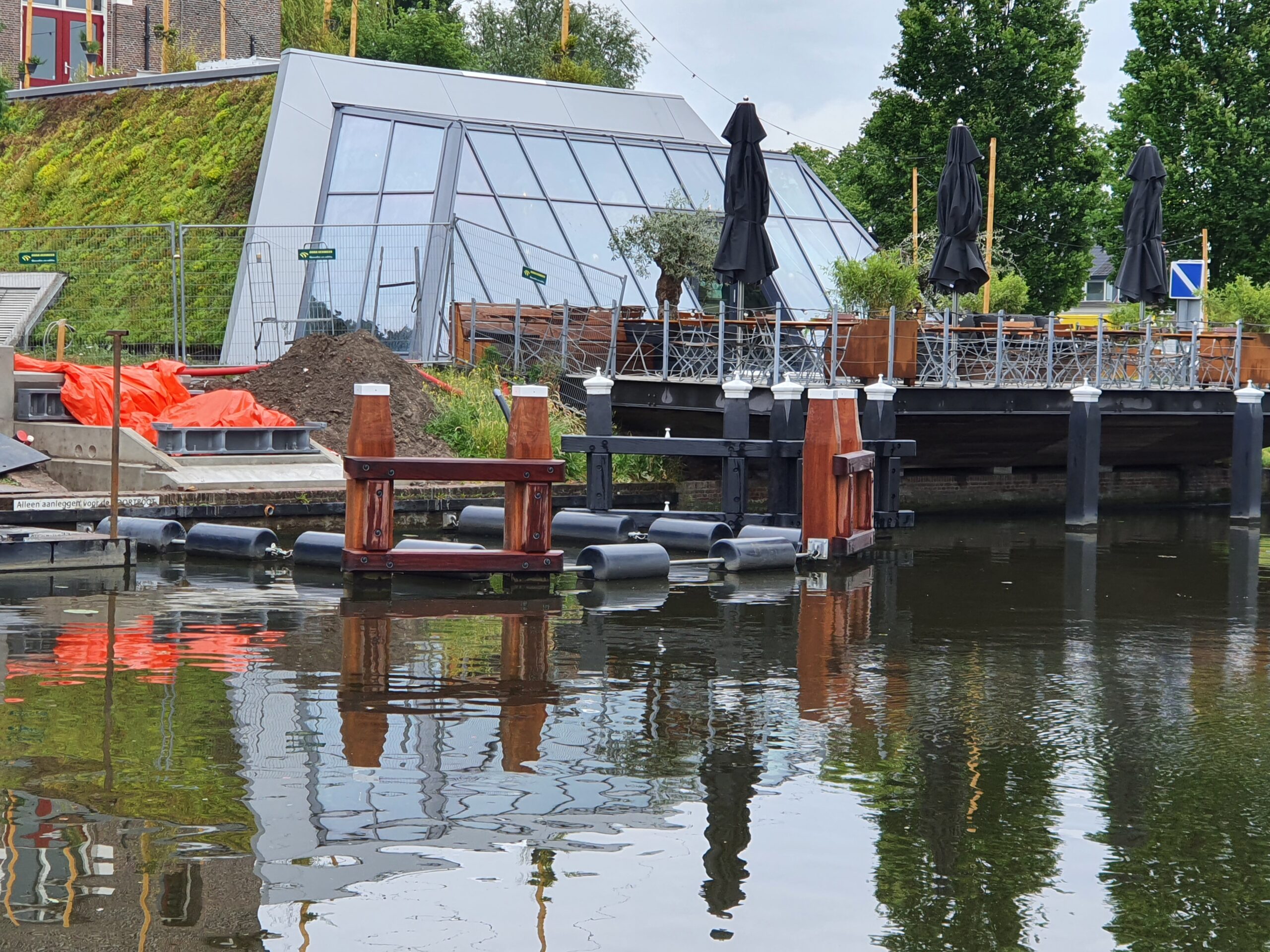 Ook de hoogste singelparkbrug ligt voorlopig nog niet over de Nieuwe Rijn. De Hapynionbrug had er al moeten liggen, maar een woonboot met ‘passagerecht’ zorgt voor vertraging en hogere kosten. “Het bleek dat een van de woonboten het recht op vrije doorgang had”, weet Geertsema inmiddels. “Daar kwam de gemeente onlangs pas achter en daarom moest het ontwerp van de brug worden aangepast. De constructie wordt nu verhoogd, zodat de brug een centimeter of tien, vijftien hoger wordt. De betreffende boot kan er dan wel onderdoor.” Vandaag is begonnen met het storten van beton aan de kant van de Kaarsenmakerssteeg. Wanneer de brug wordt ingehangen, is nog niet precies bekend. Aannemer Dura Verkeer is niet al te scheutig met die informatie, om te voorkomen dat er teveel mensen een kijkje komen nemen als zo’n brug wordt ‘ingehangen’, zoals het wordt genoemd. Wel is duidelijk dat de brug naar verwachting in de loop van de week van 22 juni op z’n plek wordt gelegd.