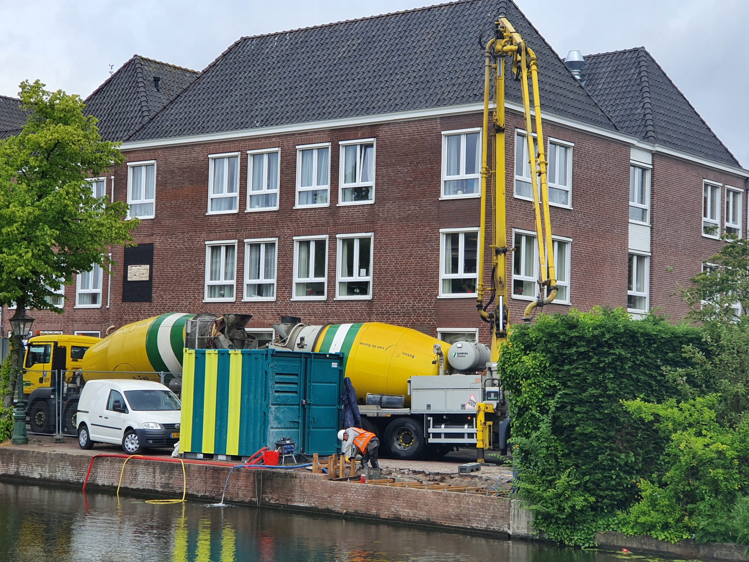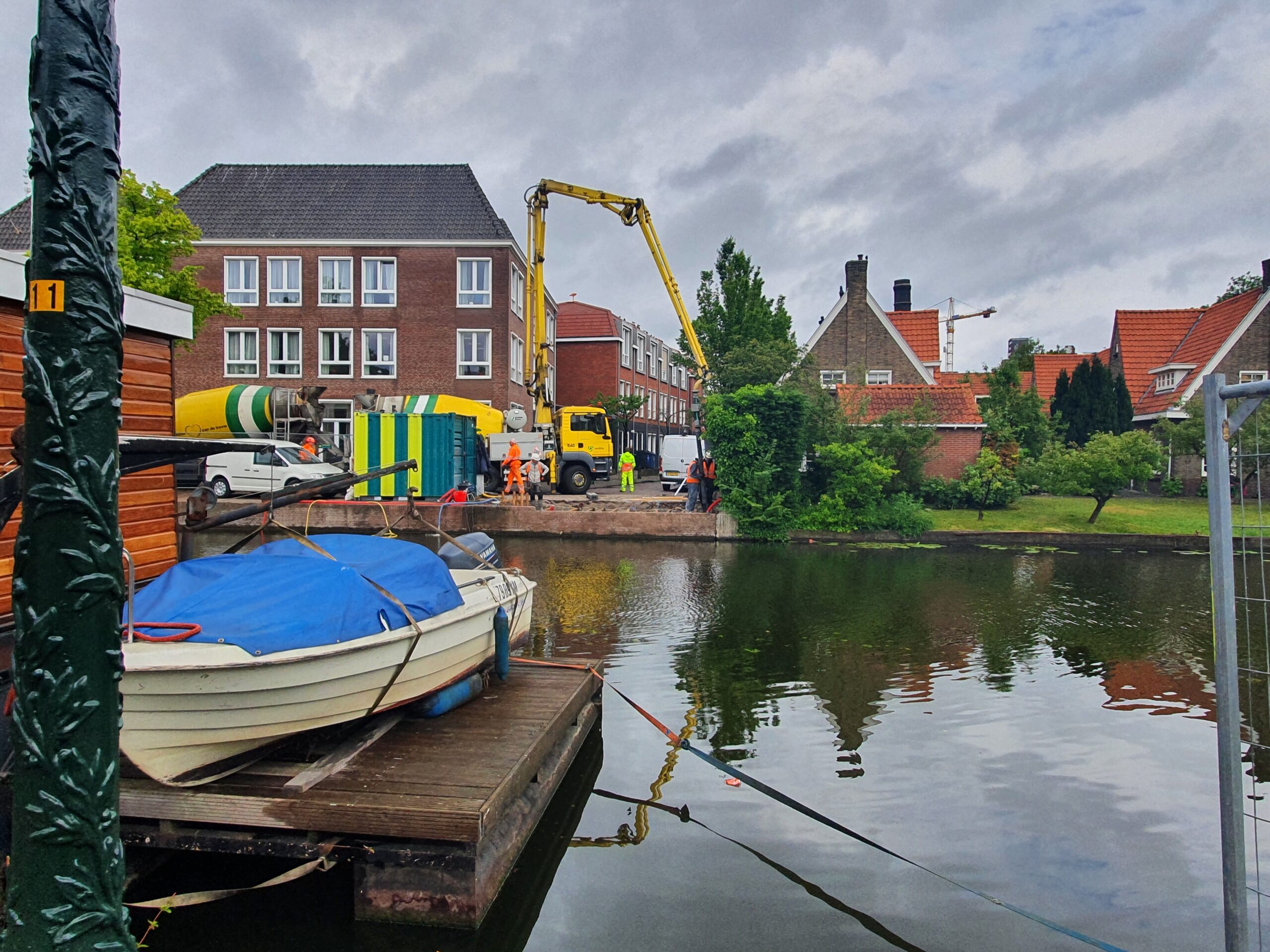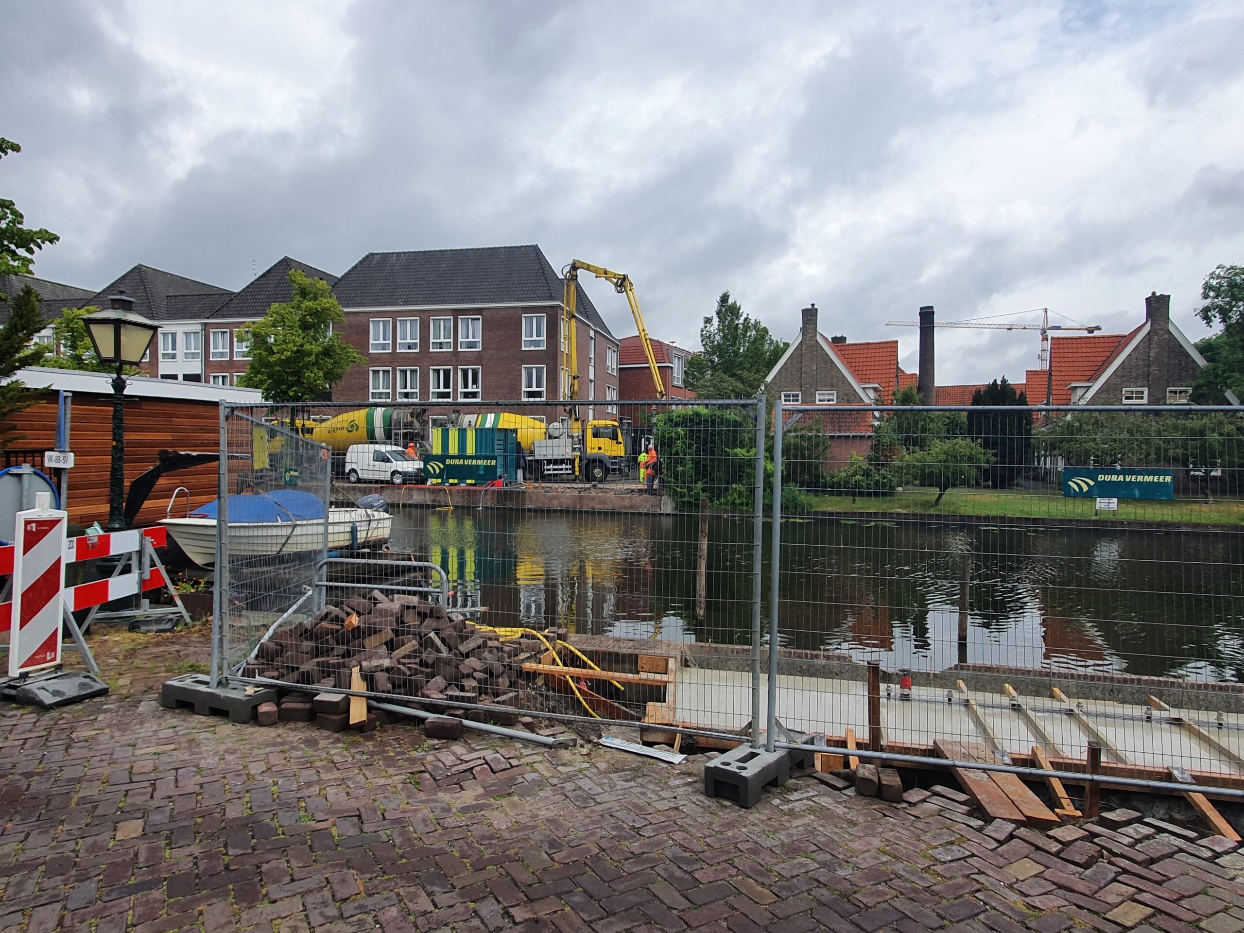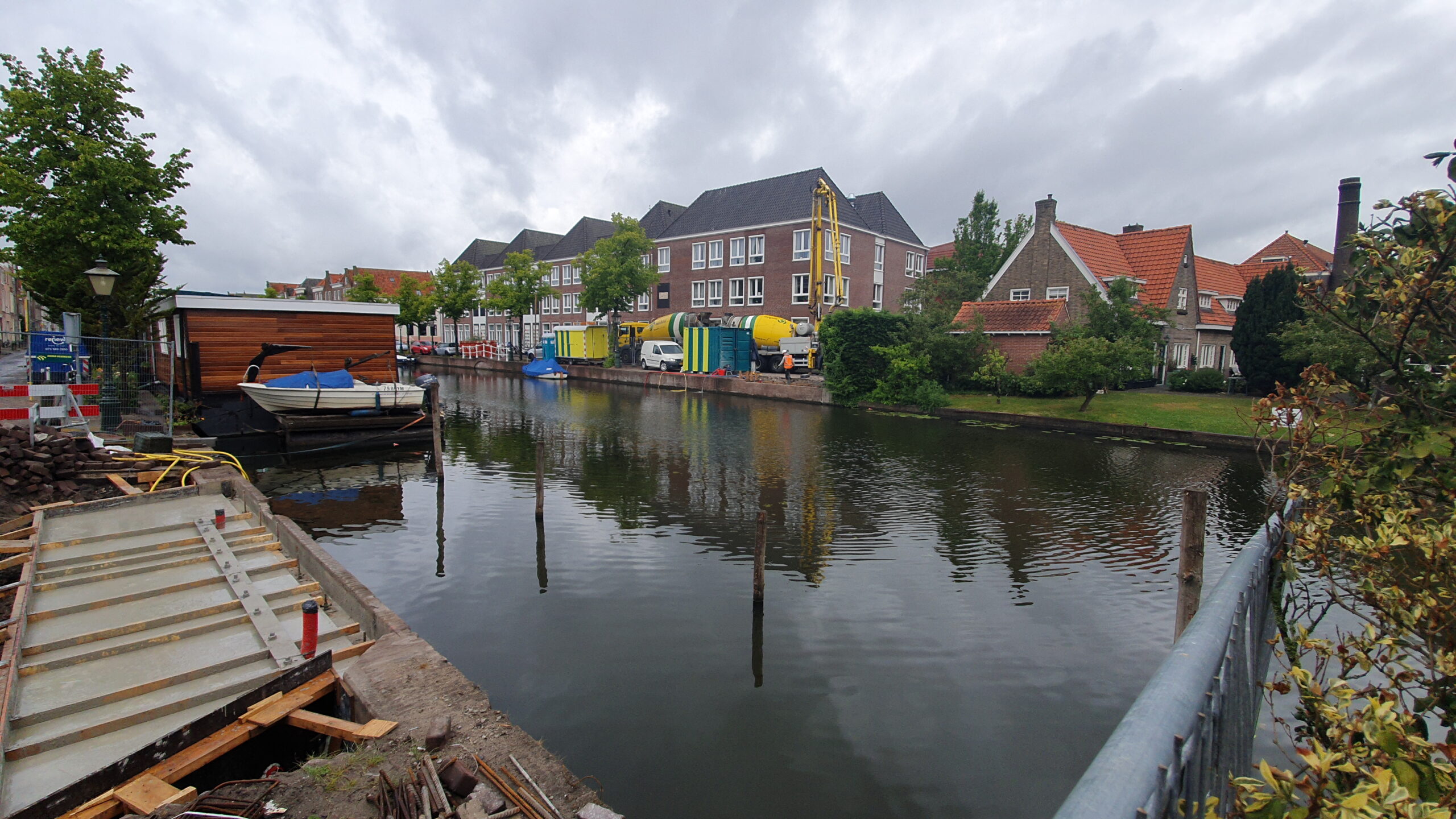 Ook de hoogste singelparkbrug ligt voorlopig nog niet over de Nieuwe Rijn. De Hapynionbrug had er al moeten liggen, maar een woonboot met ‘passagerecht’ zorgt voor vertraging en hogere kosten. “Het bleek dat een van de woonboten het recht op vrije doorgang had”, weet Geertsema inmiddels. “Daar kwam de gemeente onlangs pas achter en daarom moest het ontwerp van de brug worden aangepast. De constructie wordt nu verhoogd, zodat de brug een centimeter of tien, vijftien hoger wordt. De betreffende boot kan er dan wel onderdoor.” Vandaag is begonnen met het storten van beton aan de kant van de Kaarsenmakerssteeg. Wanneer de brug wordt ingehangen, is nog niet precies bekend. Aannemer Dura Verkeer is niet al te scheutig met die informatie, om te voorkomen dat er teveel mensen een kijkje komen nemen als zo’n brug wordt ‘ingehangen’, zoals het wordt genoemd. Wel is duidelijk dat de brug naar verwachting in de loop van de week van 22 juni op z’n plek wordt gelegd.