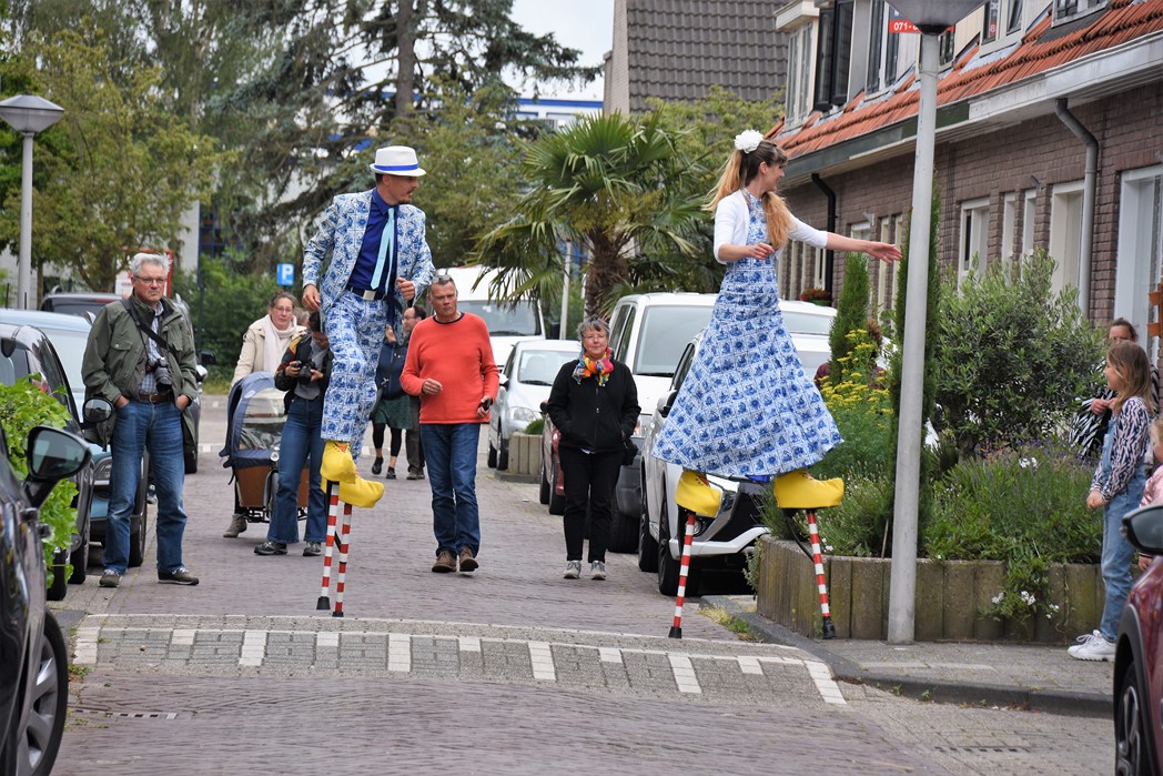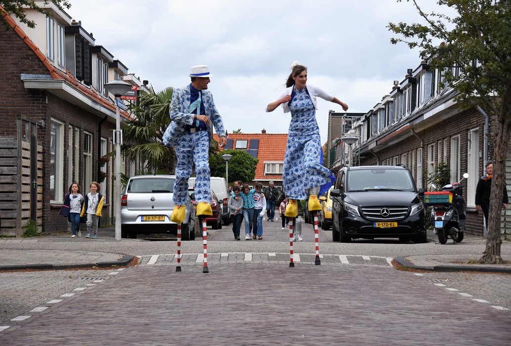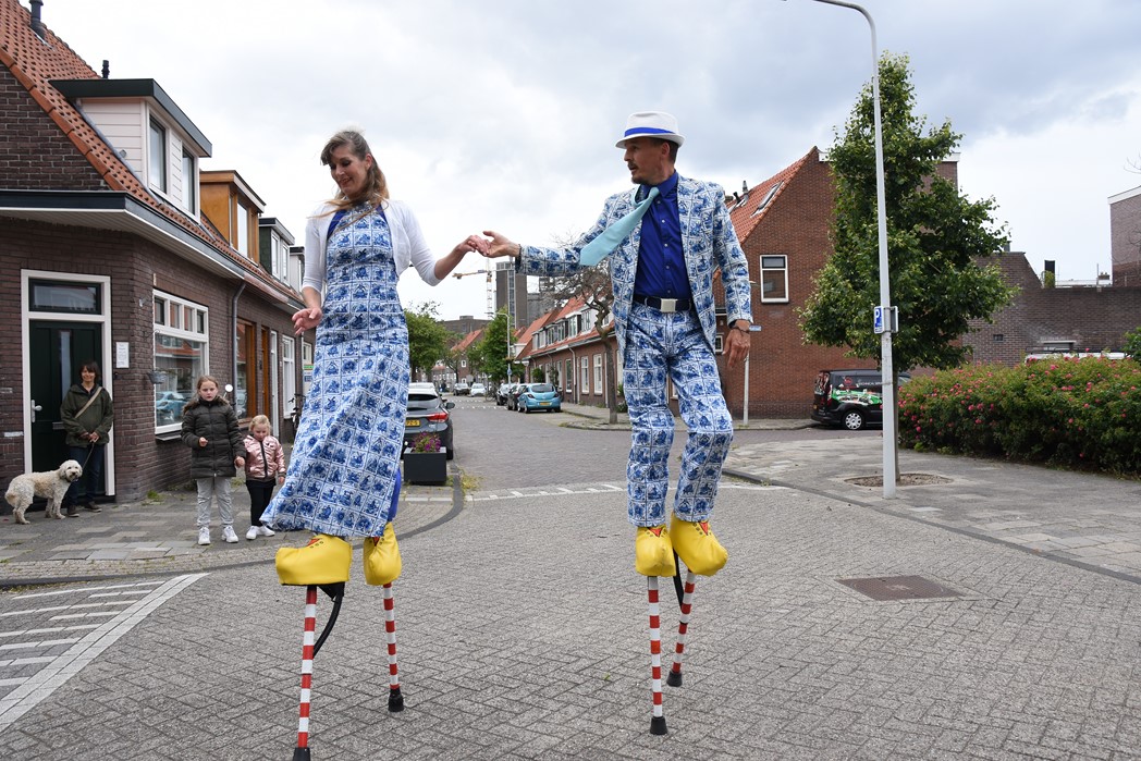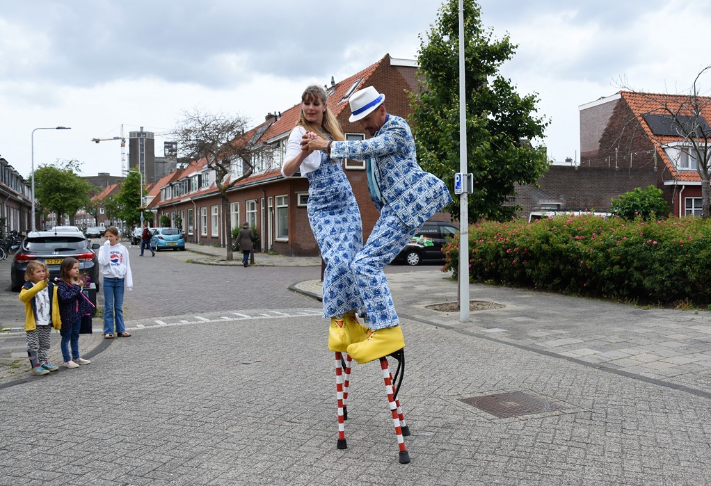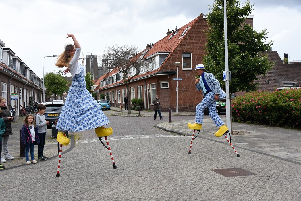 Op hoge stelten, met klompen en kleding in Delfts blauwe motieven brachten de dansers van Levend Lijf dit weekend een bijzondere tango naar De Kooi en de Zeeheldenbuurt. Onder het motto als de straat niet naar het theater kan komen, komt het theater naar de straat. Buurtbewoners werden uitgenodigd mee te lopen en mee te dansen door de wijk.