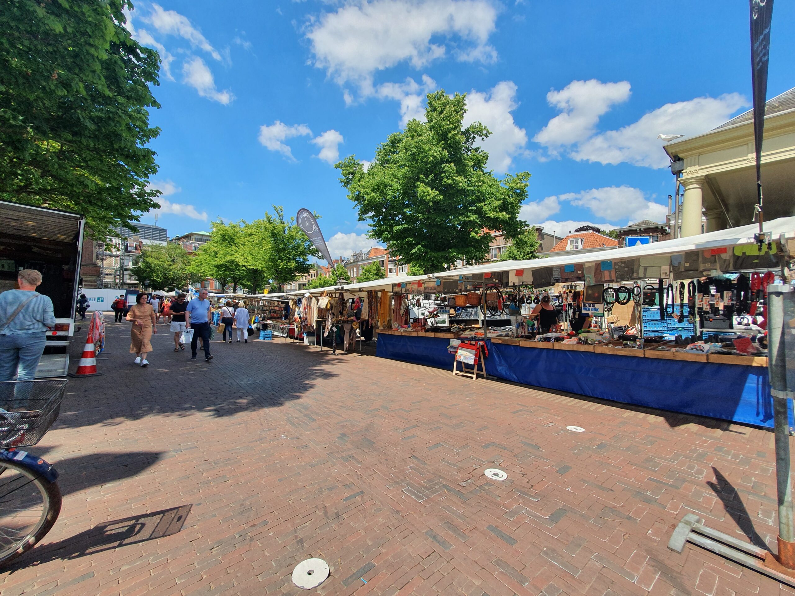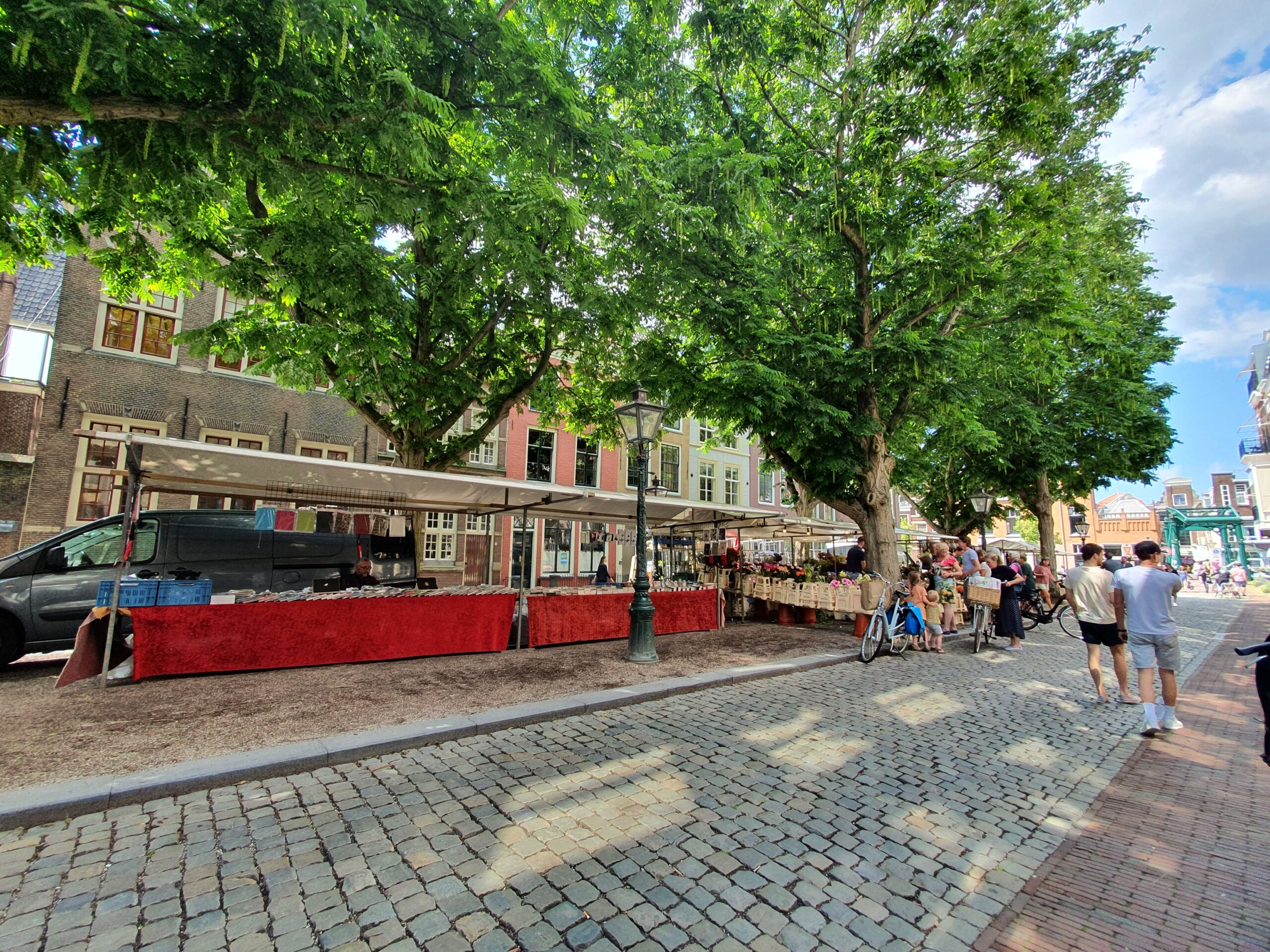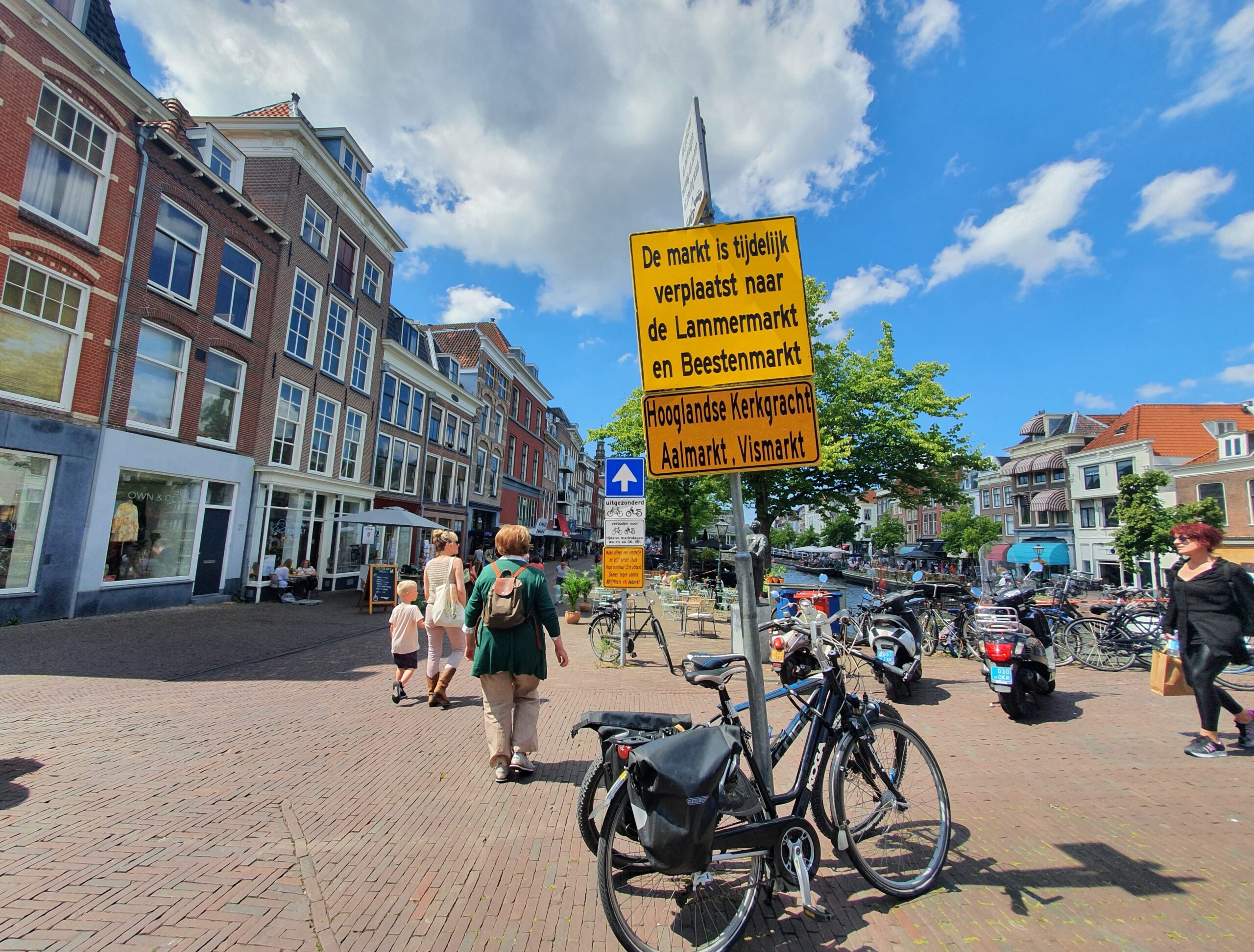 Het was vandaag drukker dan de afgelopen weken op de Leidse zaterdagmarkt. Die was voor het eerst uitgebreid met de Vismarkt, de 2e Binnenvestgracht en de Nieuwe Beestenmarkt. Die laatste twee straten vormen nu ook een verbinding tussen de twee tijdelijke marktpleinen: de Beestenmarkt en de Lammermarkt.