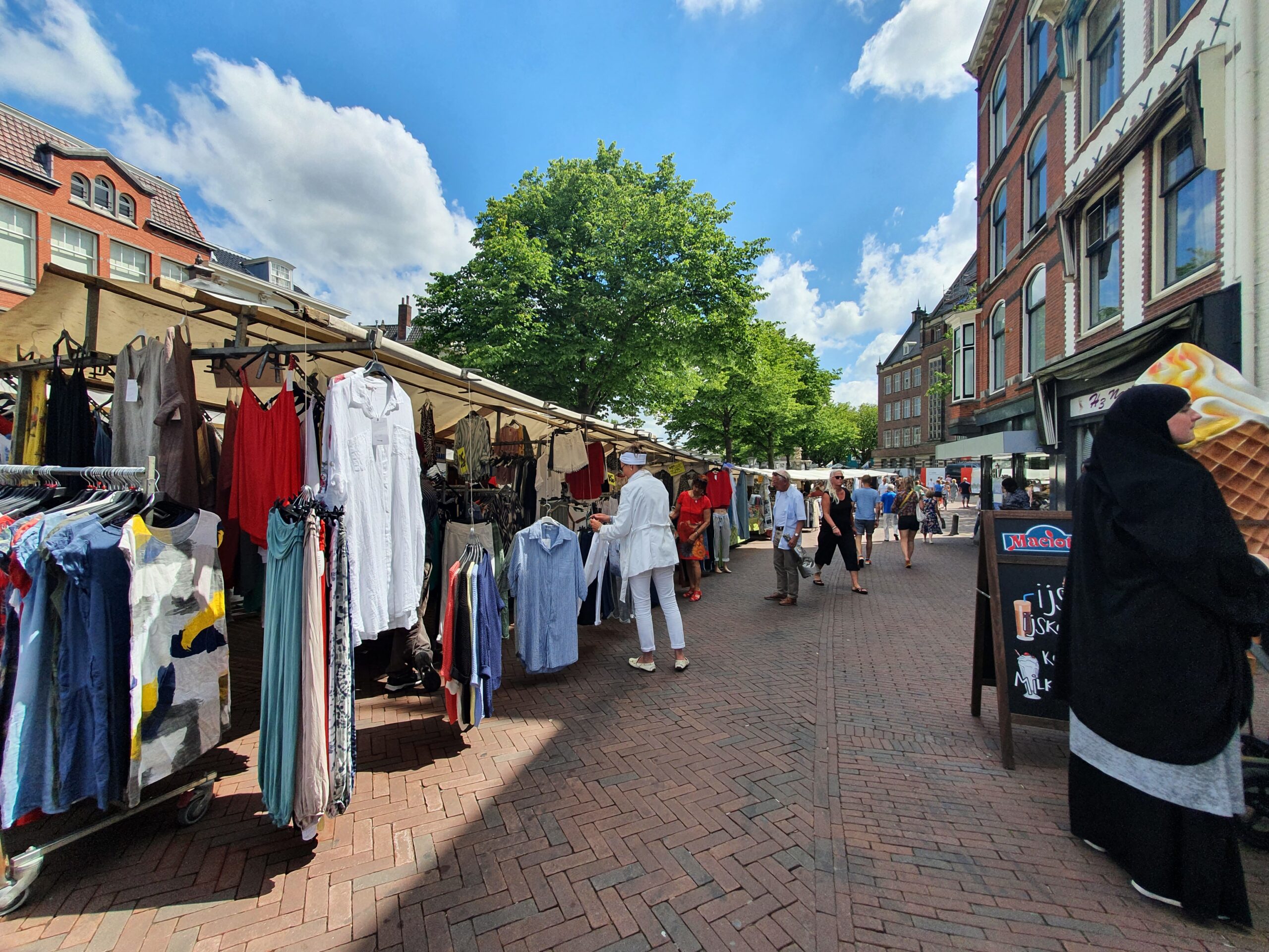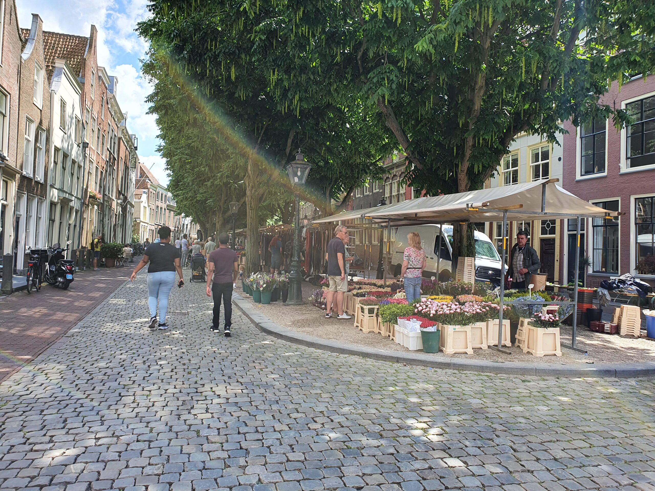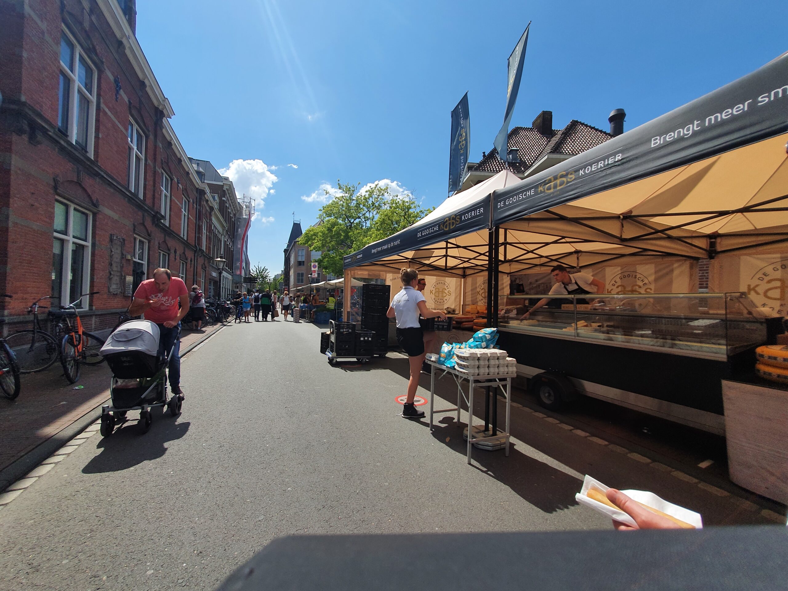 Op de Hooglandse Kerkgracht was het net als afgelopen woensdag rustig. Alleen dit keer geen lege kramen, maar gewoon weinig kramen. Die stonden gebroederlijk naast elkaar aan de ‘Haarlemmerstraatkant’ van de gracht. De marktkooplui hopen volgende week uit te kunnen breiden naar de Aalmarkt, zodat er niemand meer op de Hooglandse Kerkgracht hoeft te staan. “Het was al stukken beter”, zegt ook Paul Verschoor die verantwoordelijk is voor het neerzetten van de kramen voor de kooplui zonder eigen materiaal. “De Hooglandse Kerkgracht is gewoon niets.”