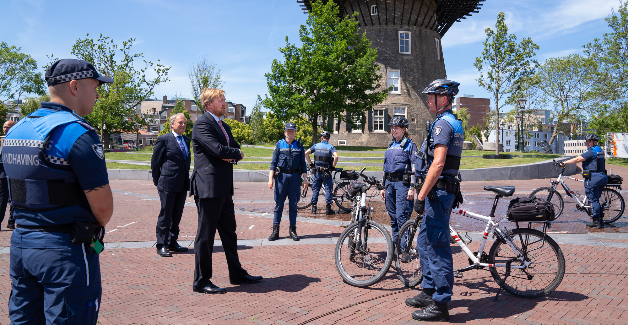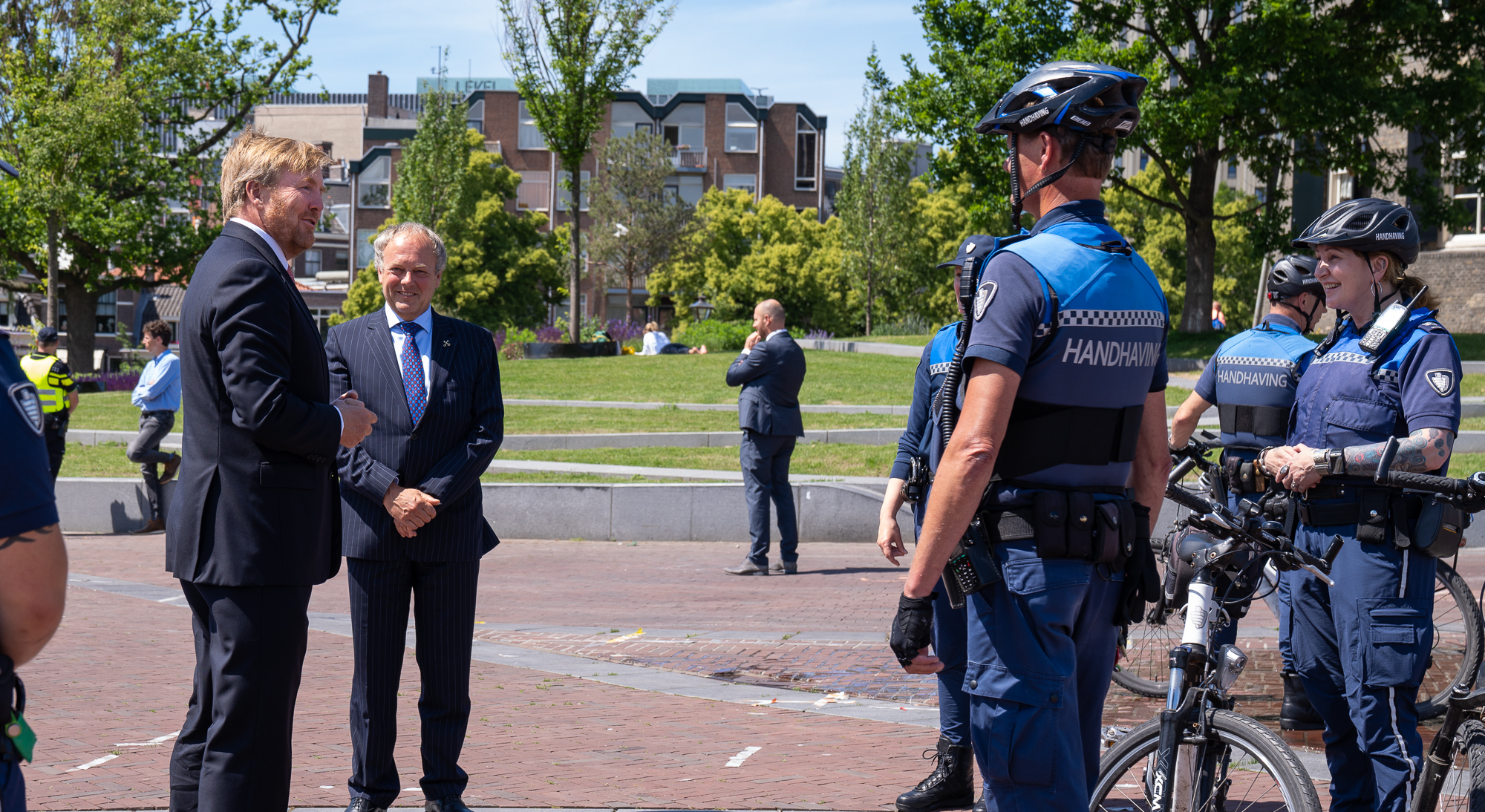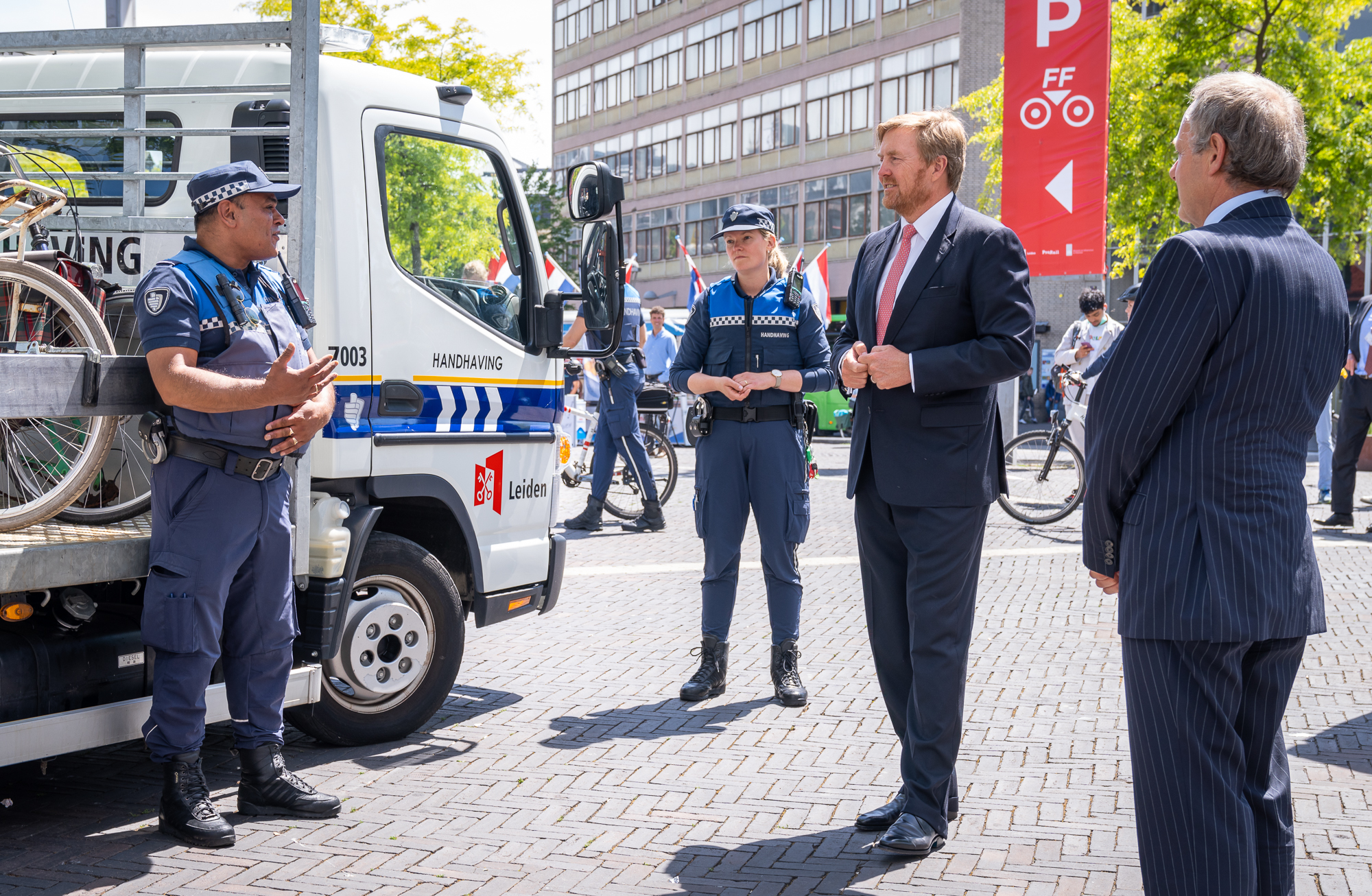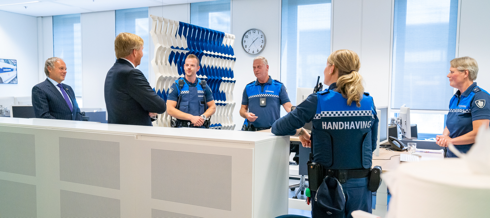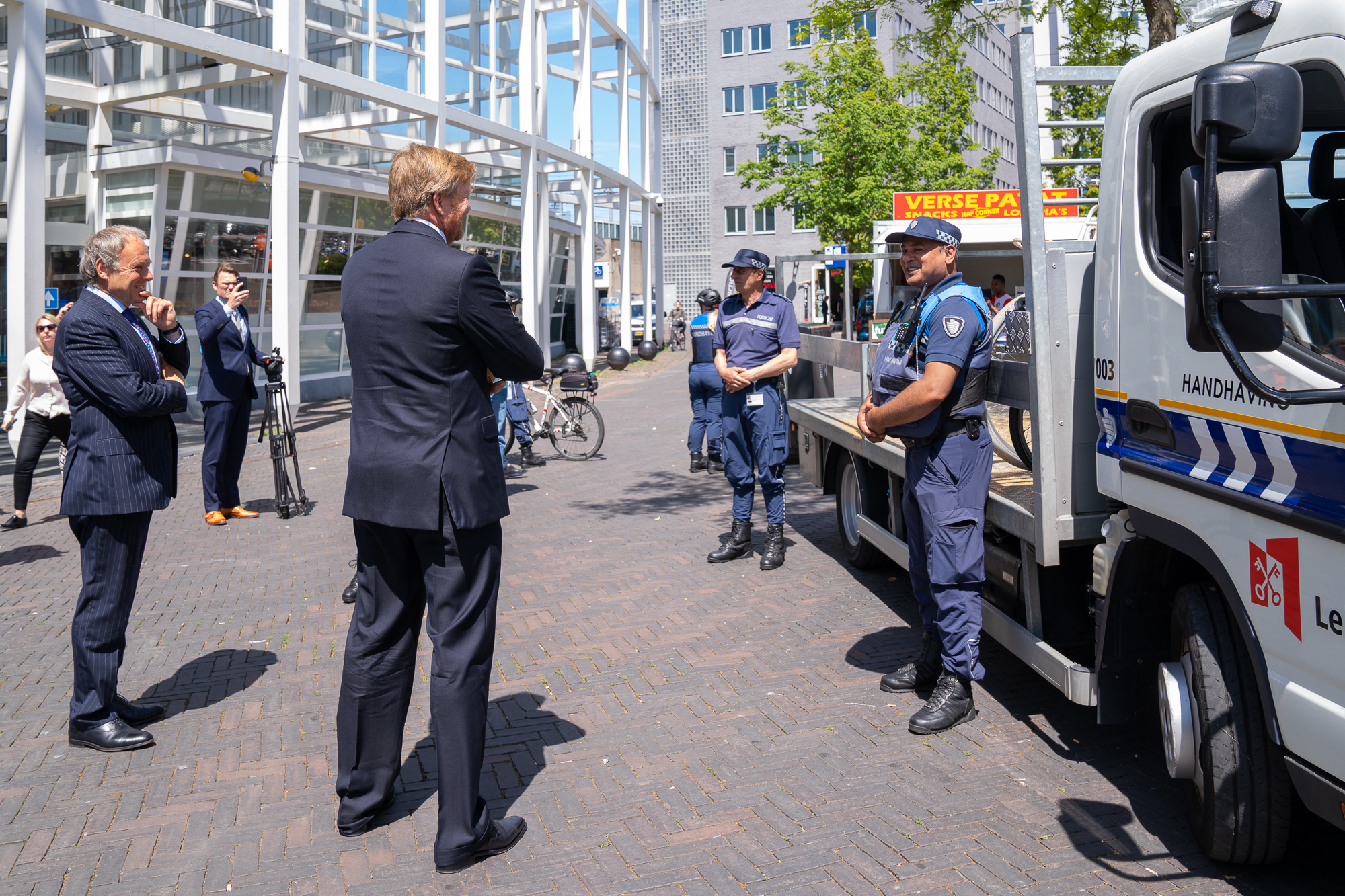 Koning Willem-Alexander was vandaag op bezoek bij de Leidse handhavers. In het nieuwe stadskantoor sprak hij met de boa’s over hun werkzaamheden en hoe die de afgelopen tijd zijn veranderd. Ook werd er gesproken over de samenwerking met de politie en ondernemers in de stad. “We hebben best een moeilijk vak en het is heel bijzonder dat de koning nu bij ons op bezoek was”, vertelt teammanager Ine Koevoet van de afdeling Handhaving.