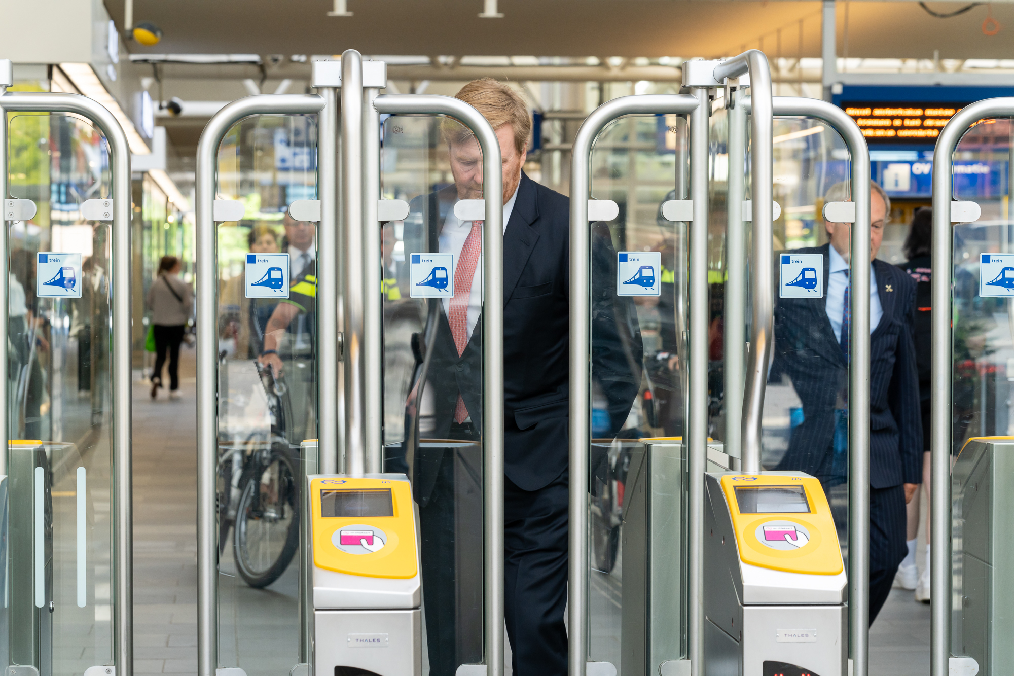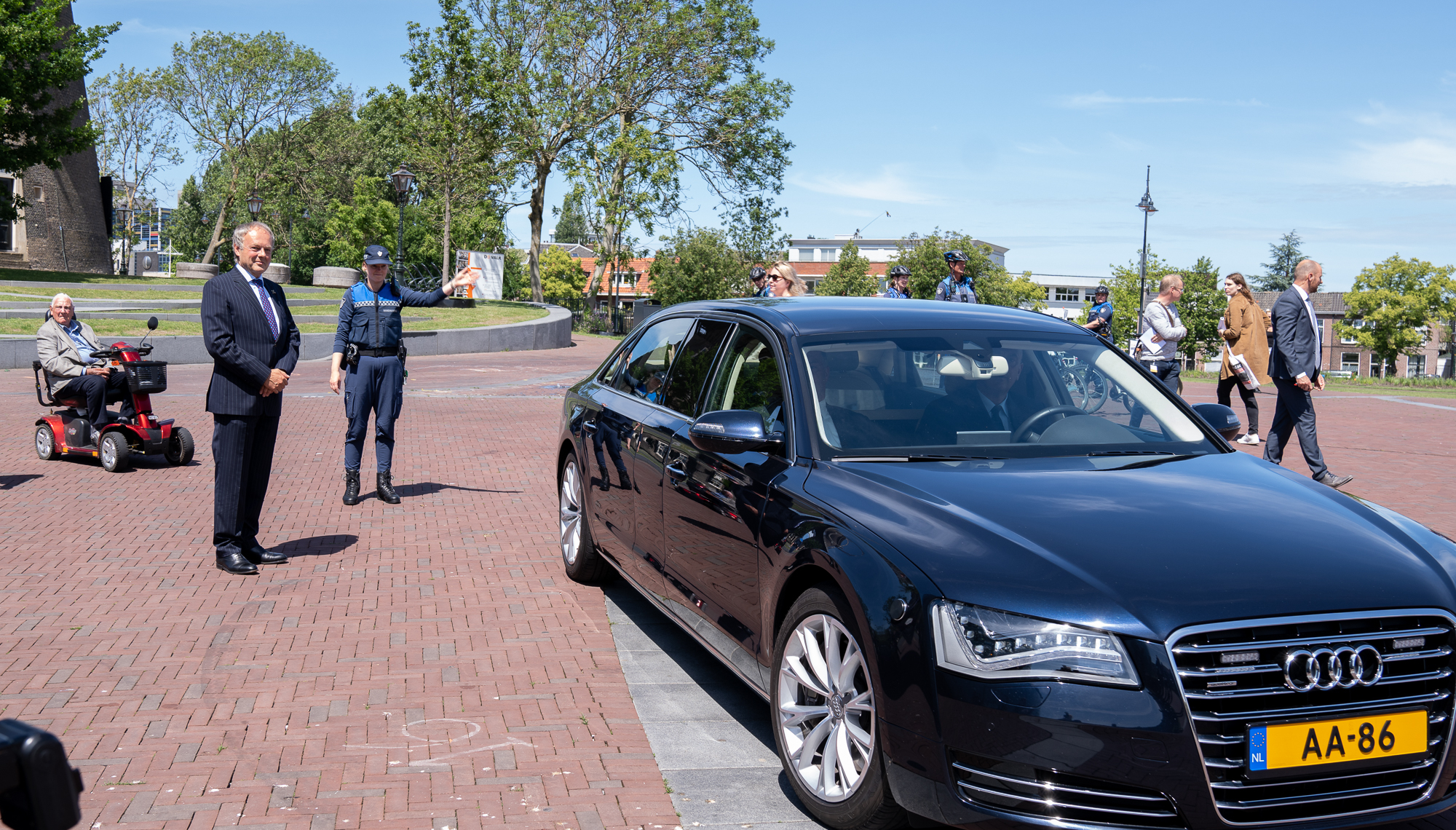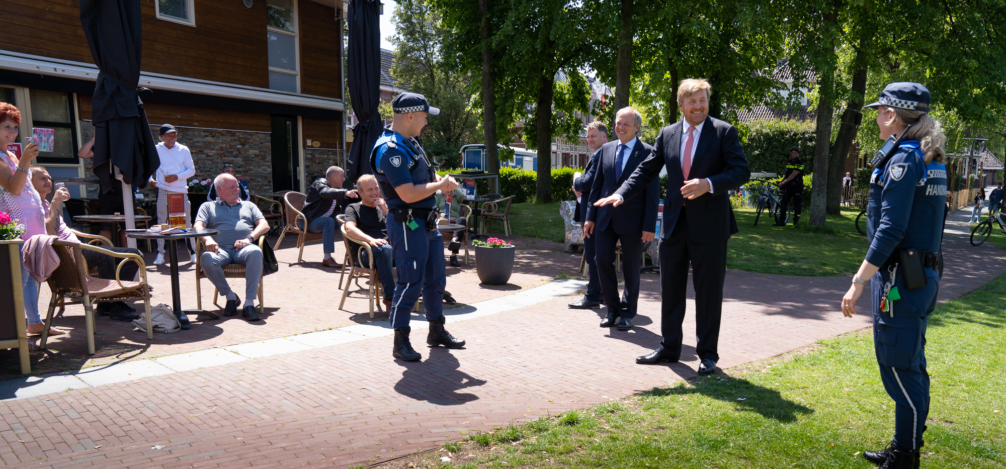 “Dit was mijn beste imitatie van een lijnbus”, zegt de koning terwijl hij op de busbaan voor de deur van het Stadskantoor aan de Bargelaan uit de auto stapt. “Leuk om hier te zijn.” Op de stoep wordt hij welkom geheten door burgemeester Henri Lenferink en samen met een afvaardiging van de gemeentelijke afdeling Handhaving vertrekken ze voor een rondleiding.